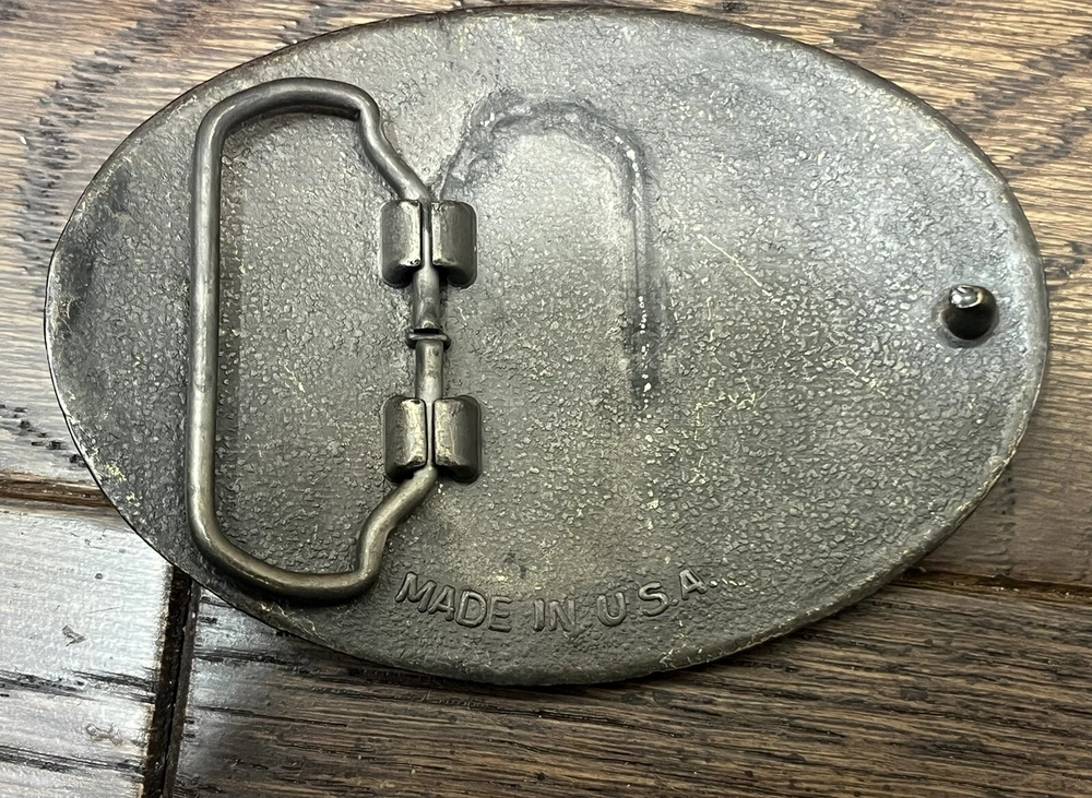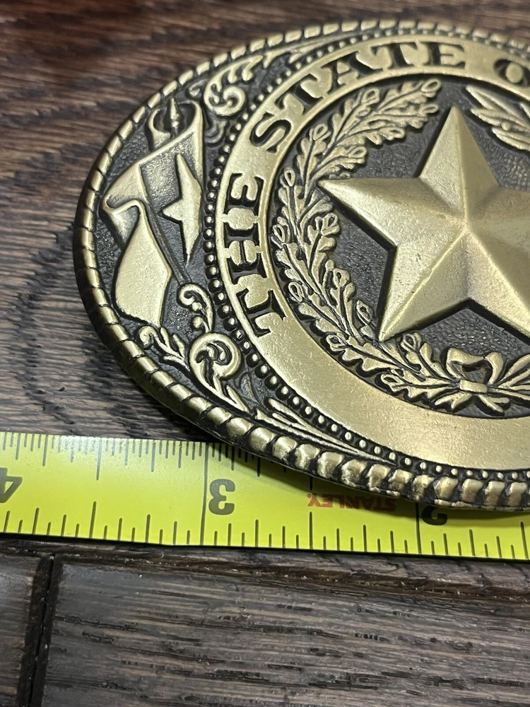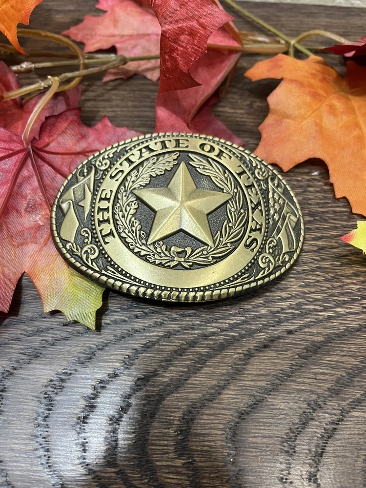 Show off your love for the Wild West with this vintage belt buckle featuring The Great State of Texas Lone Star design. Made of brass, this original piece from the 1980s is perfect for any cowboy or Western enthusiast. The buckle measures 3.75” x 2.75” and is suitable for adult unisex wear. With a gold color and country look, this belt buckle is a great addition to any vintage accessories collection. It is also a great conversation starter and a unique way to express your love for the Wild West. Don’t miss out on this original piece from an unknown manufacturer. Made in the USA. Preowned vintage in good condition.