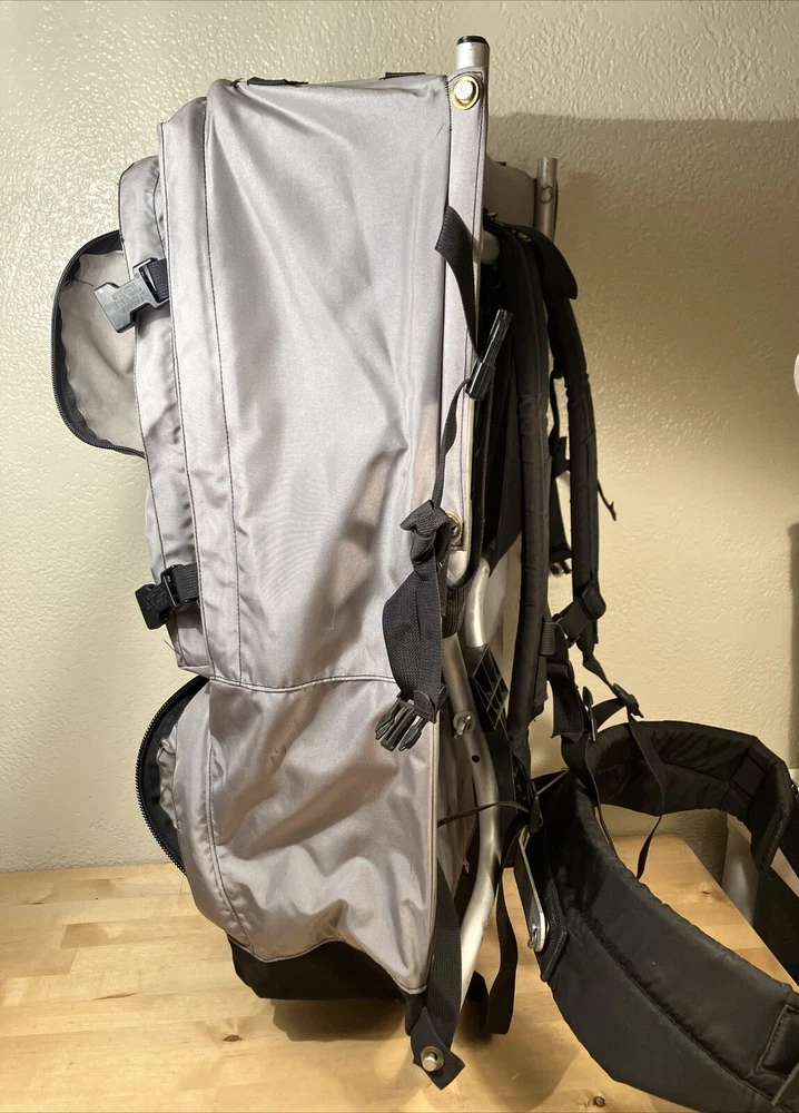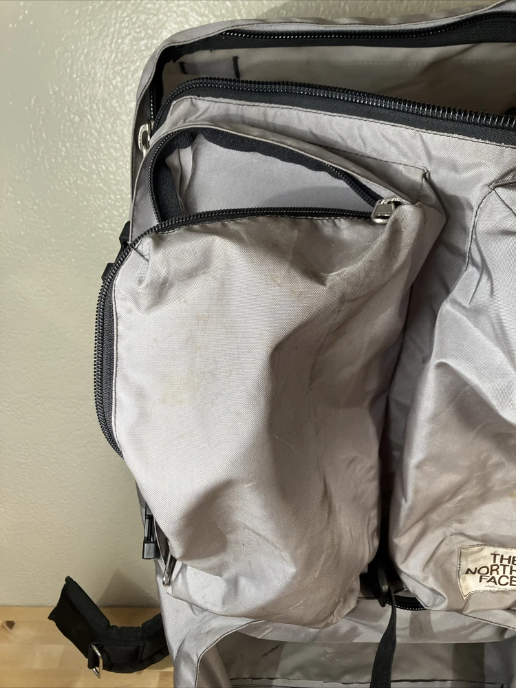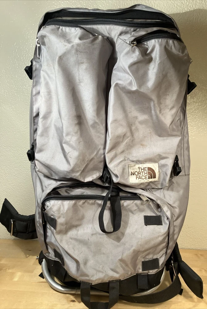THE NORTH FACE Vintage Brown Label External Frame Hiking Backpack Marked Size: L Pre-owned. See photos for condition details. No rips or tears. One large stain, maybe iodine from a first aid kit. No bends or dents in aluminum rack observed. Zippers, waist belt and all clips/straps in excellent working order. To upcycle, I reuse shipping material as often as possible. Buy more from my store and save on shipping.