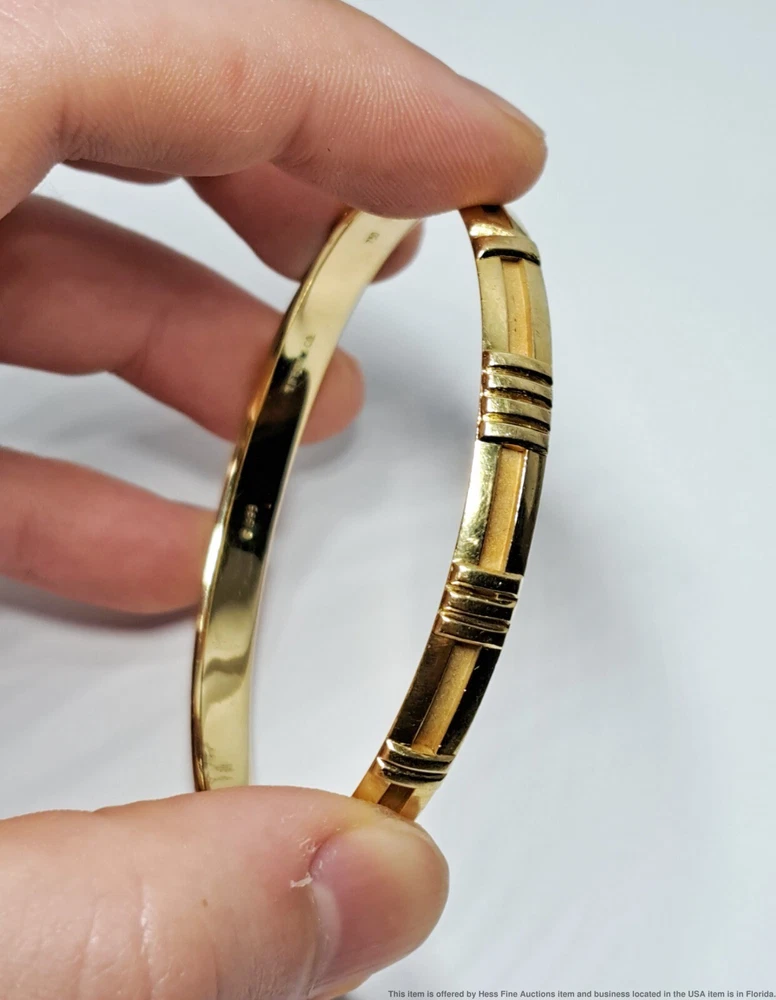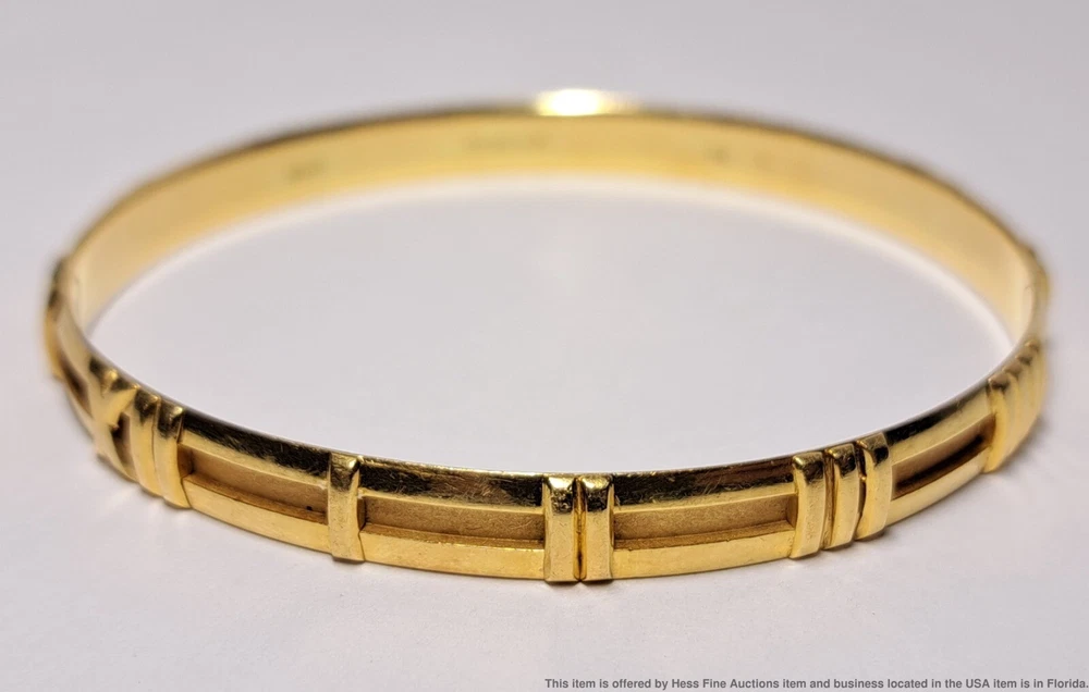 Vintage Tiffany & Co Atlas 18K Gold Roman Numeral Bangle Bracelet Signed 1995 Vintage Tiffany & Co Atlas 18K Gold Roman Numeral Bangle Bracelet Signed 1995 Click images to enlarge Description Described & Photographed By: Dillon 61241 NFTME Title: Vintage Tiffany & Co Atlas 18K Gold Roman Numeral Bangle Bracelet Signed 1995 Description: Vintage Tiffany & Co Atlas 18K Gold Roman Numeral Bangle Bracelet Signed 1995 Here are the specifications: Type of Jewelry: Bracelet Mounting metal: 18K Yellow Gold Approx. Size or length: 7-3/4 in circumference; 2-5/8 opening; 1/4 in or 6.5mm width Condition: Preowned with light use overall. Could use a polish. See photos for details. Appears ready to wear! Stamping or Factory Markings: Tiffany & Co 1995 750 Total weight of piece: 22.1 grams Estimated size of package: 7.5 x 5.5 x 3.5 Estimated weight of package: 8 oz Condition: Pre-owned Condition Notes: Described & Photographed By: Dillon 61241 NFTME Title: Vintage Tiffany & Co Atlas 18K Gold Roman Numeral Bangle Bracelet Signed 1995 Description: Vintage Tiffany & Co Atlas 18K Gold Roman Numeral Bangle Bracelet Signed 1995 Here are the specifications: Type of Jewelry: Bracelet Mounting metal: 18K Yellow Gold Approx. Size or length: 7-3/4 in circumference; 2-5/8 opening; 1/4 in or 6.5mm width Condition: Preowned with light use overall. Could use a polish. See photos for details. Appears ready to wear! Stamping or Factory Markings: Tiffany & Co 1995 750 Total weight of piece: 22.1 grams Estimated size of package: 7.5 x 5.5 x 3.5 Estimated weight of package: 8 oz Payment Paypal Shipping Shipping Options: Domestic shipping: Weight based Shipping Charges. Domestic Carriers are: Ups Second Day Air, Ups Next Day Air International shipping: Weight based Shipping Charges. International Carriers are: Ups Standard Canada, Ups Worldwide Expedited I will ship to: United States, Worldwide Weight: 8 oz. Shipping and Handling: Please check eBay's Shipping & Payment tab Customer Service Policy: Please note in bidding or buying this auction you are entering into a binding contract. In bidding or buying you are agreeing to all policies stated below and comply with Florida State laws. Sales Tax applies to all Florida sales unless you have a valid dealers license. Legal Shipping High value items require restricted delivery with only the addressee being able to sign for it. * Shipping is calculated by eBay and shown in the auction. Legal Jurisdiction. HessFineAuctions is a division of Hess Fine Art, and is registered in Pinellas County, FL, USA. It is agreed that all parties will abide by the laws of the State of Florida in all matters relating to this agreement. And that in the case of any dispute, the legal jurisdiction of resolution shall be Pinellas County, Florida. The buyer acknowledges that any items not returned within 30 days of receipt of the refund will be deemed appropriated by the buyer and buyer also acknowledges their intent to deprive from seller, either temporarily or permanently, the right to the property or the benefit from the property. Resale certificates must match buyer name or company and address * The auctions contain only what is described. Do not assume something comes with a used item if it is not stated in the auction verbiage. Many items will be marked with serial numbers or identifying numbers items may not be accepted for return if these numbers are not present. * Photographs often disclose condition far better than verbiage as many people have different ideas on what terms may mean. * If an identifying mark, inclusion or defect is visible in the images it is considered DISCLOSED to the buyer. * Gold items have been tested with a Kee gold tester M-509GM and tested as stated in the auction. * All Items are shipped insured. If an item has arrived damaged we will require images and a damage affidavit. CUSTOMS AND INTERNATIONAL BIDDER POLICIES International bidders - you are agreeing to the following when you place a bid with us: * If your total purchase including shipping exceeds $200.00 US and you pay with a credit card then your only delivery option is UPS signature delivery. This is because credit cards require both a signature and tracking. * If you pay with PayPal and the total price including shipping is less than $750.00 US then we can ship USPS to most countries. Please contact us with eBay’s message system before you pay for an amended invoice. * The following applies if you are shipping to or from these countries. CANADA, Australia, Belgium, Brazil, Croatia, Denmark, France Germany, Great Britain and Northern Ireland, Israel, Netherlands New Zealand Spain and Switzerland, Estonia, Finland, Gibraltar, Hungary, Italy, Latvia, Lithuania, Luxembourg, Malaysia, Malta, Portugal, and Singapore. We will be able to offer you USPS International shipping if you are paying with PayPal and the item and shipping are less than $750.00 US. We may be able to ship 1st Class USPS International if you are shipping to or from the countries listed above. * If you wish your item sent to a colleague with a US address we are of course willing to do so but the address must be verified with PayPal Credit card company and in the eBay invoice. * We declare all items for the winning bid amount. * It is common for countries to charge some form of customs duties, taxes, VAT, or brokerage fees on items being shipped from the USA. These costs, along with country-specific importing rules and delays caused by customs, are the buyer’s responsibility. * We do not falsify customs documents to assist you in evading your lawful taxes. Hess Fine Auctions Hess Fine Auctions can be reached during working hours of 9 to 5 PM EST. Legal Shipping Vendio Images: More than just a pretty image. 250+ Mobile Responsive & Active Content Free Listing Templates with Vendio Sales Manager. Vendio provides powerful selling automation for sellers of all sizes. Get business information that counts! - Vendio Counters are active content free.