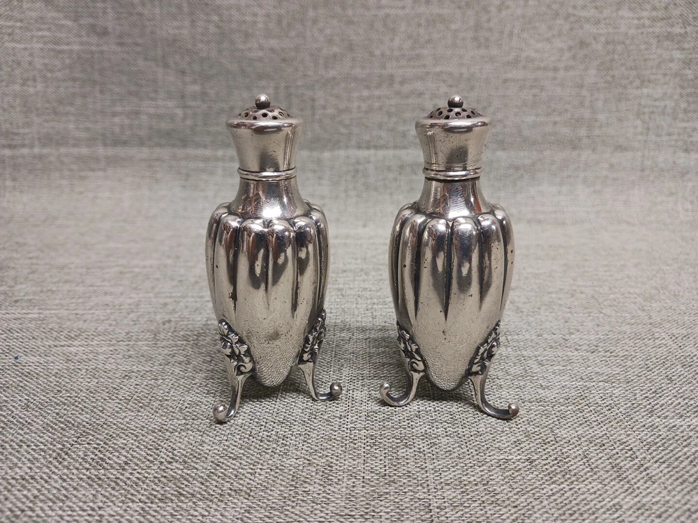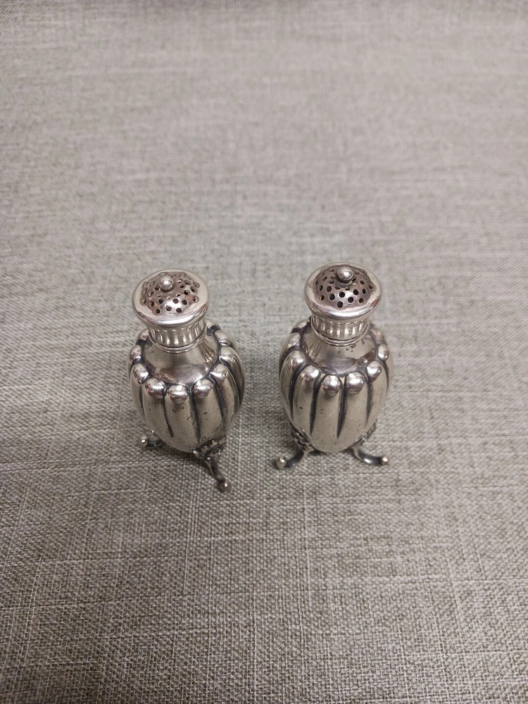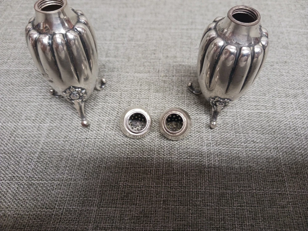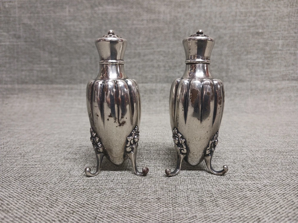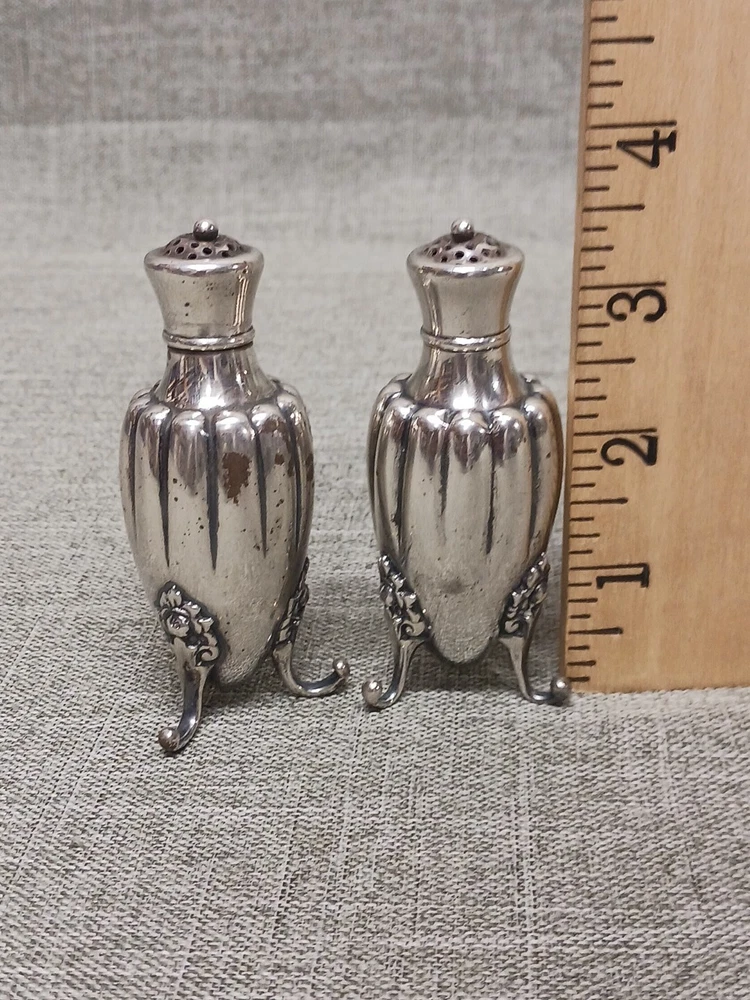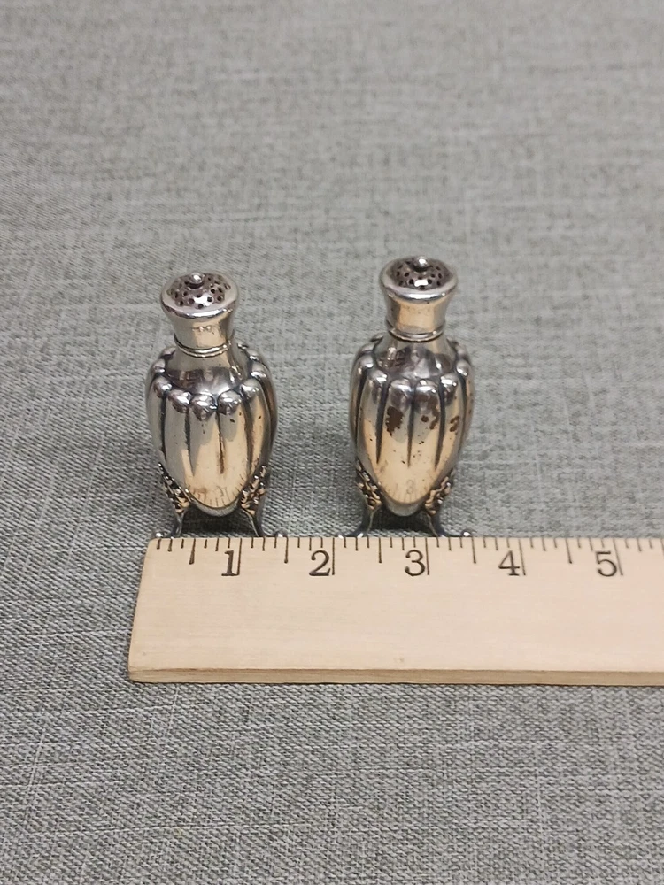 This pair of sterling silver salt & pepper shakers are in good condition. They show normal wear from age/being handled. The tops have some denting, and the feet have some bends. I don't see any dents on the shakers bodies. They are solid sterling they aren't weighted and don't have inserts. They weigh 3.78 troy ounces together. They are marked Tiffany & Co Makers Sterling on the bottoms. They measure approx. 3 3/8" tall by 1 1/4" wide. They need a good polishing. Look at all pictures to see the condition. Free U.S. shipping on this auction.