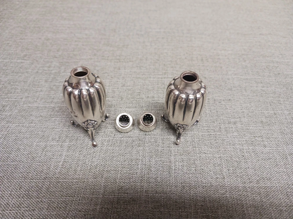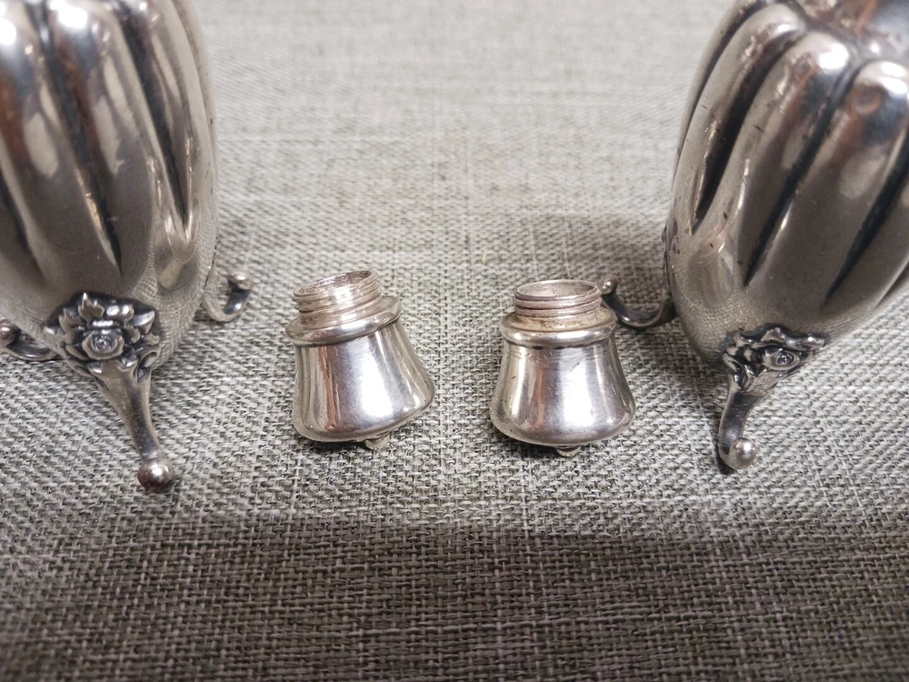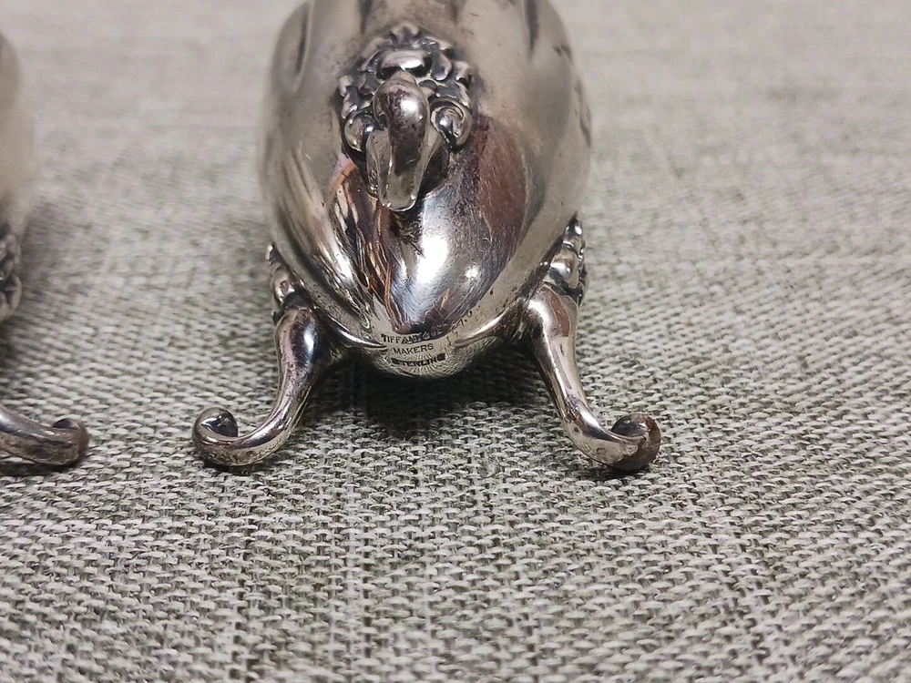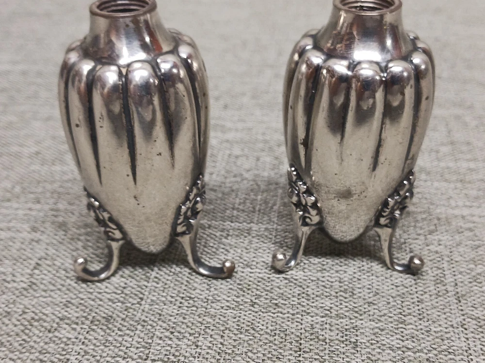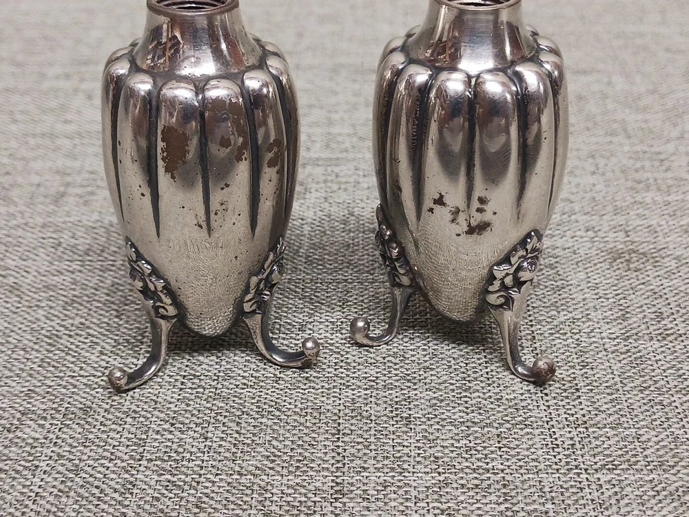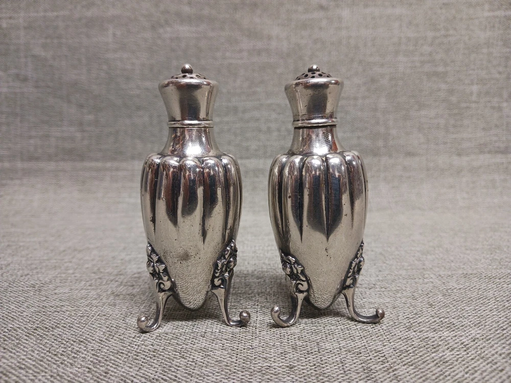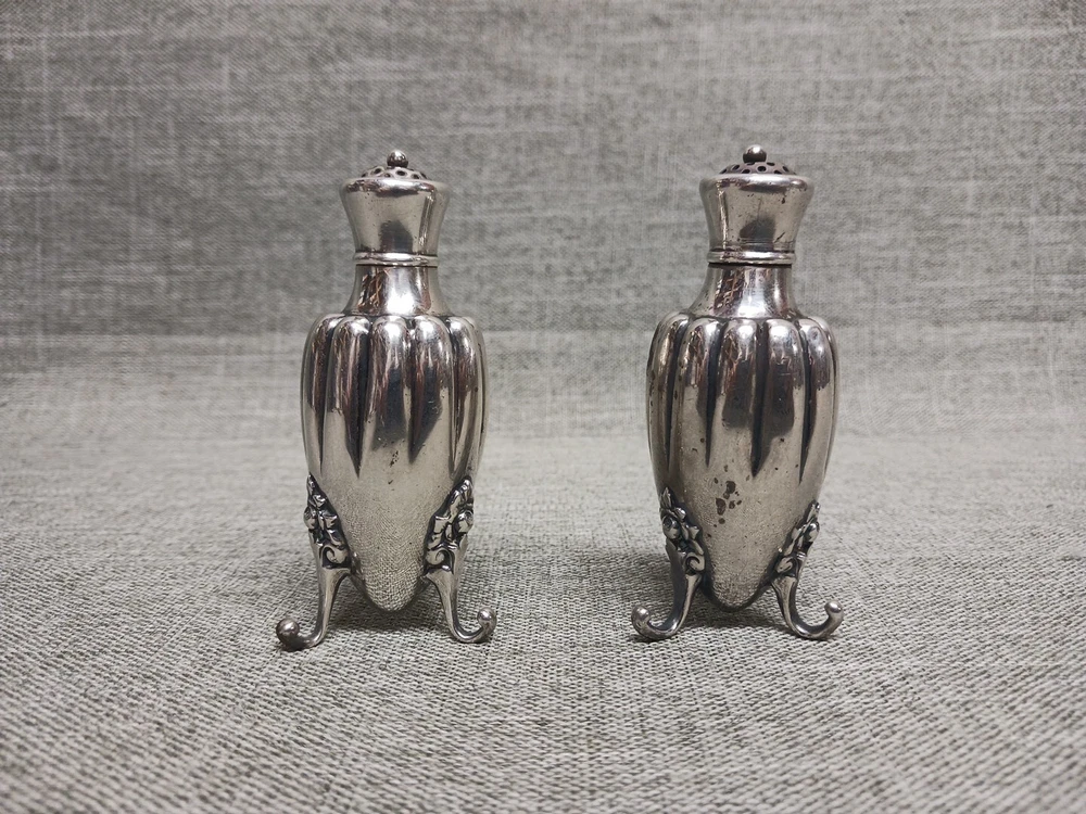 This pair of sterling silver salt & pepper shakers are in good condition. They show normal wear from age/being handled. The tops have some denting, and the feet have some bends. I don't see any dents on the shakers bodies. They are solid sterling they aren't weighted and don't have inserts. They weigh 3.78 troy ounces together. They are marked Tiffany & Co Makers Sterling on the bottoms. They measure approx. 3 3/8" tall by 1 1/4" wide. They need a good polishing. Look at all pictures to see the condition. Free U.S. shipping on this auction.