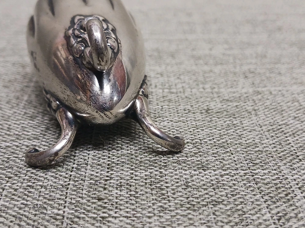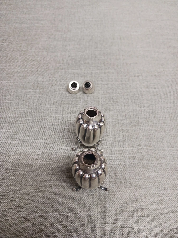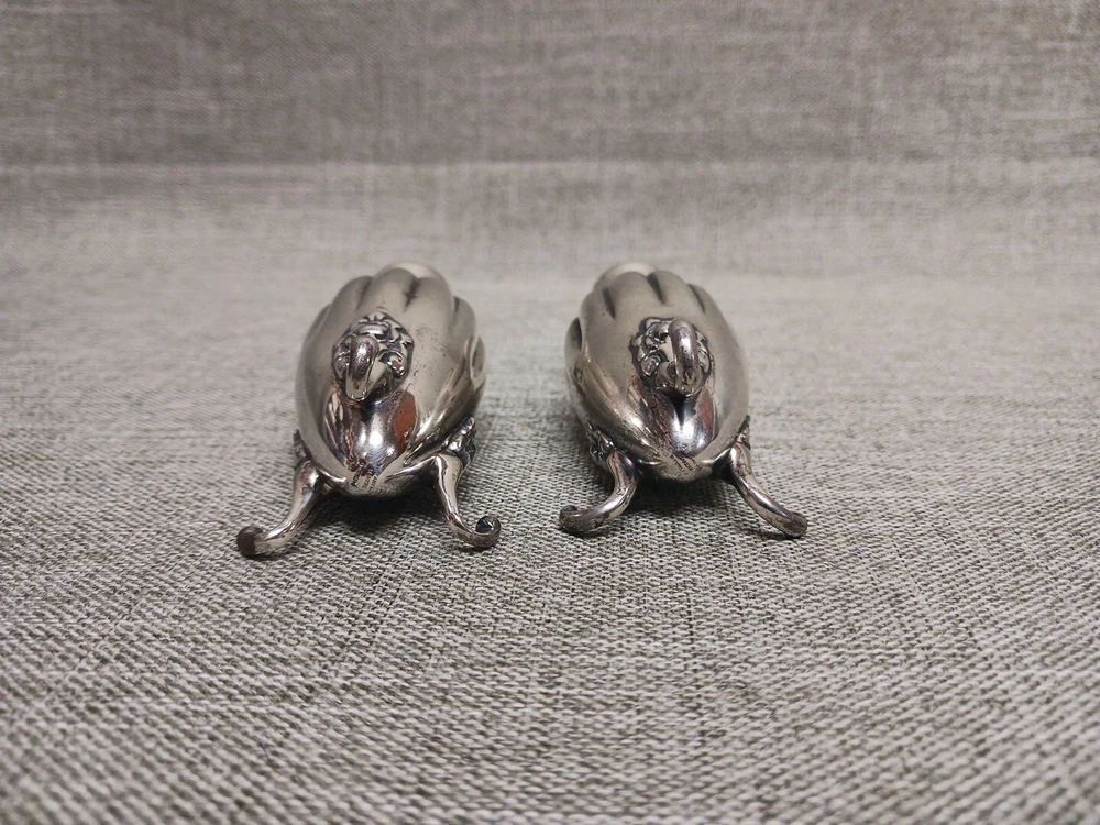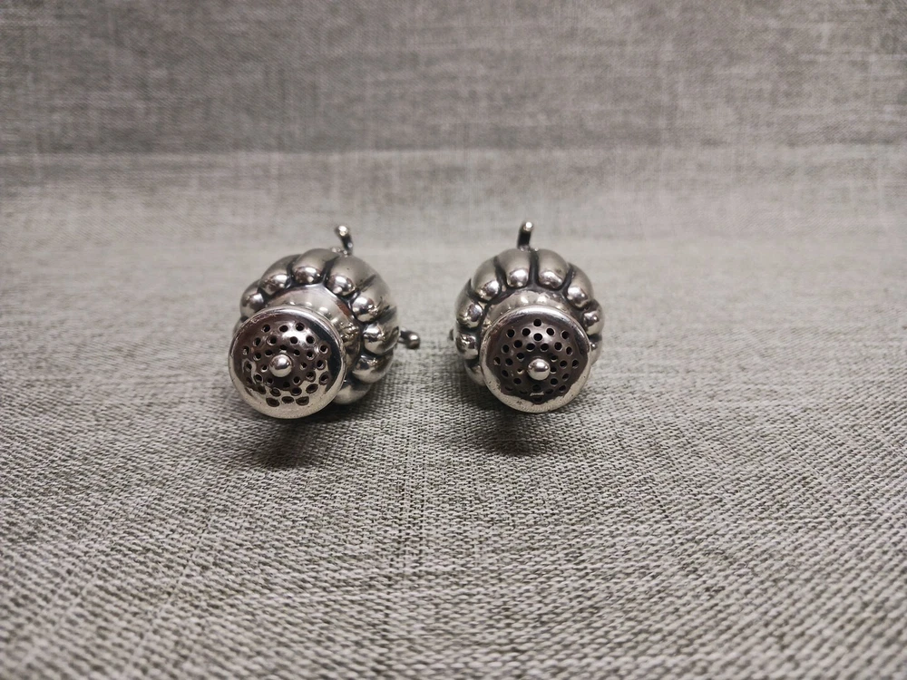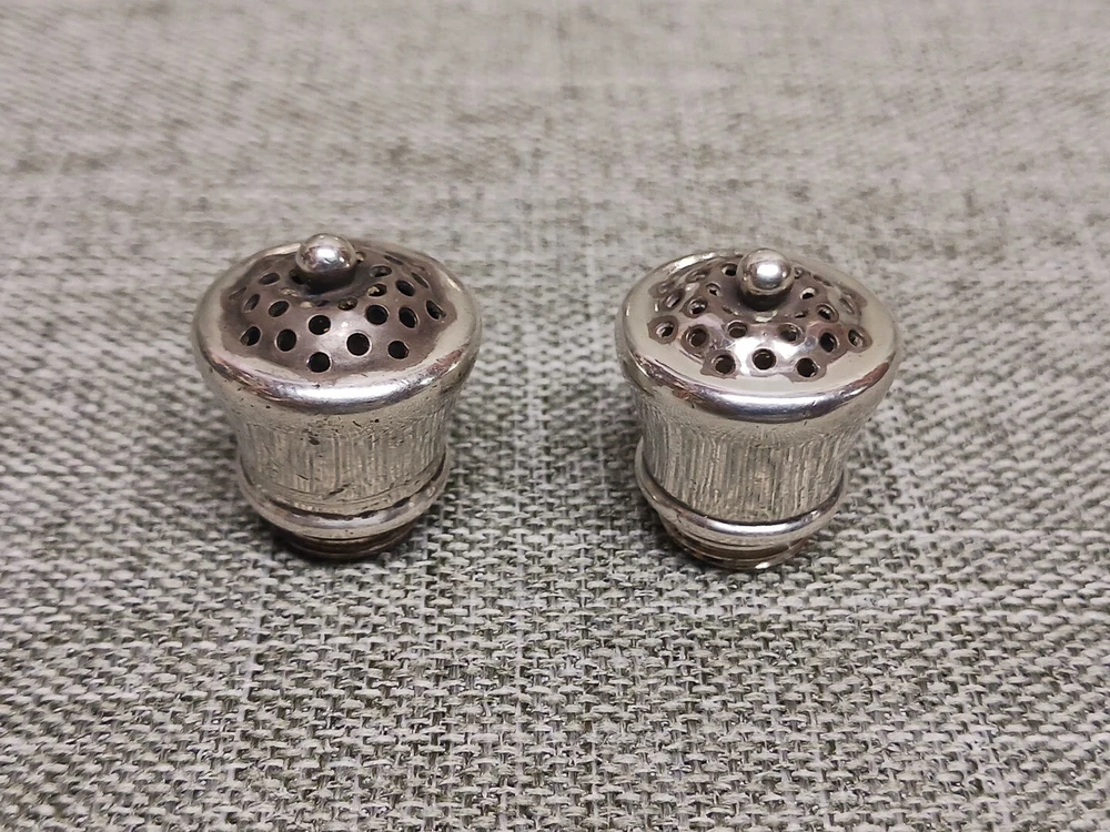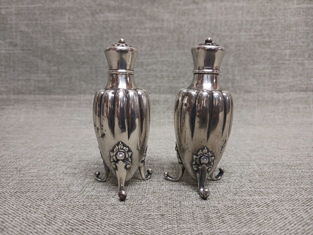 This pair of sterling silver salt & pepper shakers are in good condition. They show normal wear from age/being handled. The tops have some denting, and the feet have some bends. I don't see any dents on the shakers bodies. They are solid sterling they aren't weighted and don't have inserts. They weigh 3.78 troy ounces together. They are marked Tiffany & Co Makers Sterling on the bottoms. They measure approx. 3 3/8" tall by 1 1/4" wide. They need a good polishing. Look at all pictures to see the condition. Free U.S. shipping on this auction.