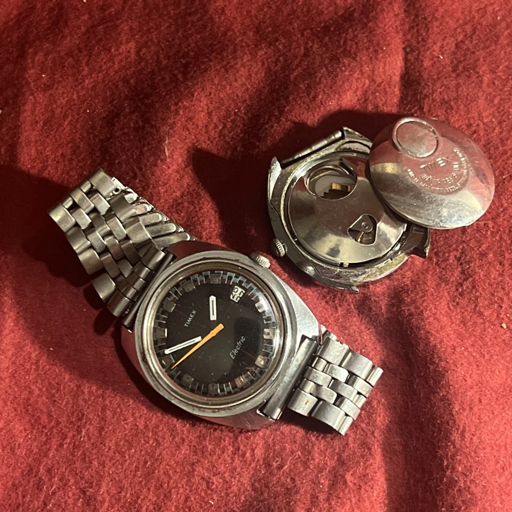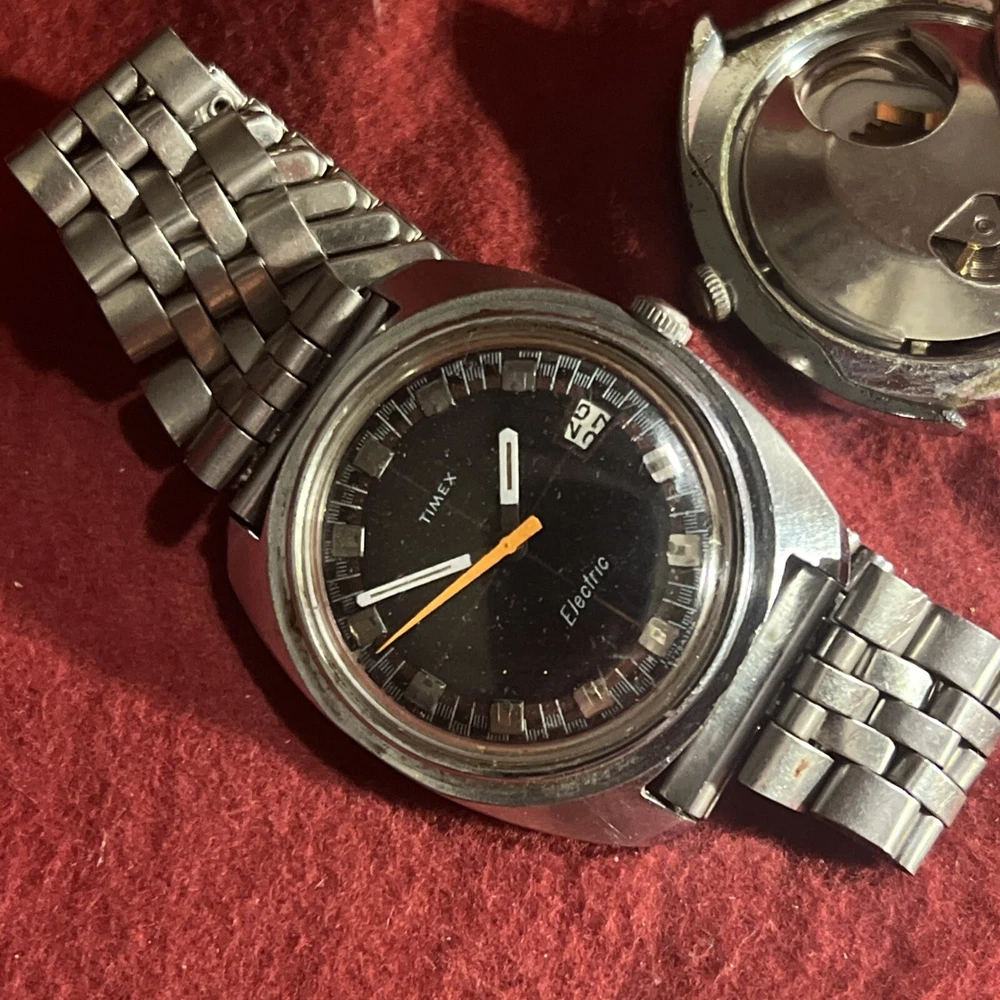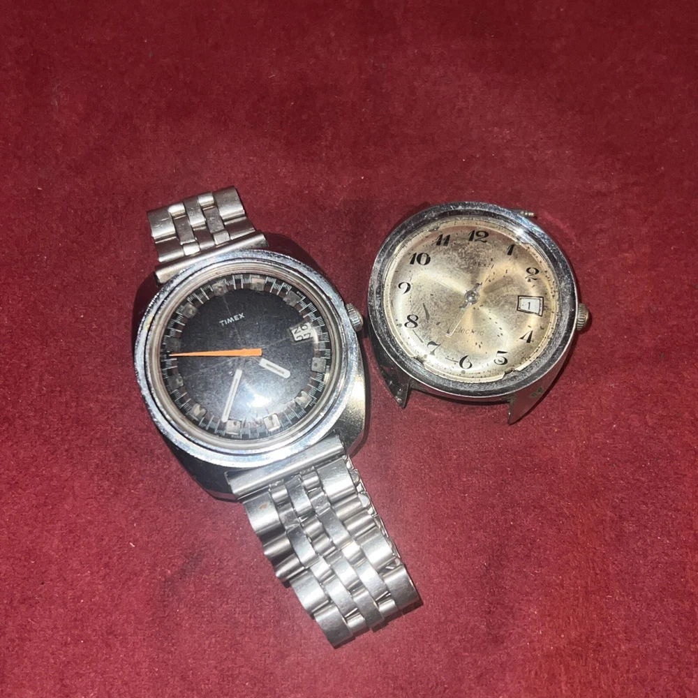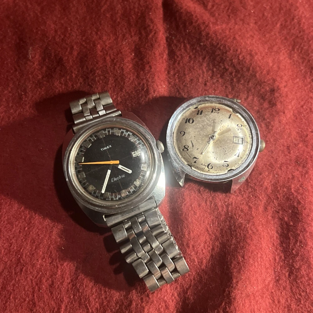 Vintage Timex divers watch Black Dial / Orange Seconds Hand -for Restoration! Missing bezel and looks like movement has missing parts! I’m including a second Timex electric and possibly you can exchange movements? I’m not sure if the second Timex movement works or not! But it looks complete! See pics!! Both for parts repair!! As is as seen as pictured… Please read below: Please review item specifics, and pictures for best details!! Please ask questions and good luck bidding! If any issue with purchase or arrival condition such as not as described, please reach out to me before posting feedback and or opening a case and I will make it right!! My wish is for you to have a happy buying experience and to enjoy my items!! Please note about vintage items. Unless marked new or new old stock, they are sold in used, as-is, pre-owned condition. Because of the age of these items they may have some wear, imperfections and signs of use, age and time… "International buyers " please note: Import duties, taxes, and charges aren't included in the item price or postage cost. These charges are the buyer's responsibility. “Please check with your country's customs office to determine what these additional costs will be, prior to bidding or buying." Shipping international via the eBay international Shipping method! ** Due to the nature of used/vintage watches, I do not guarantee long term functionality and accuracy... for best performance always have older watches serviced!! ** In regard to water resistance and or waterproof: the water resistance rating, if any, is based on the manufacturer's marking, not an actual test by me. I do not recommend using any of my used watches in submerged water environment such as swimming or shower or ocean!