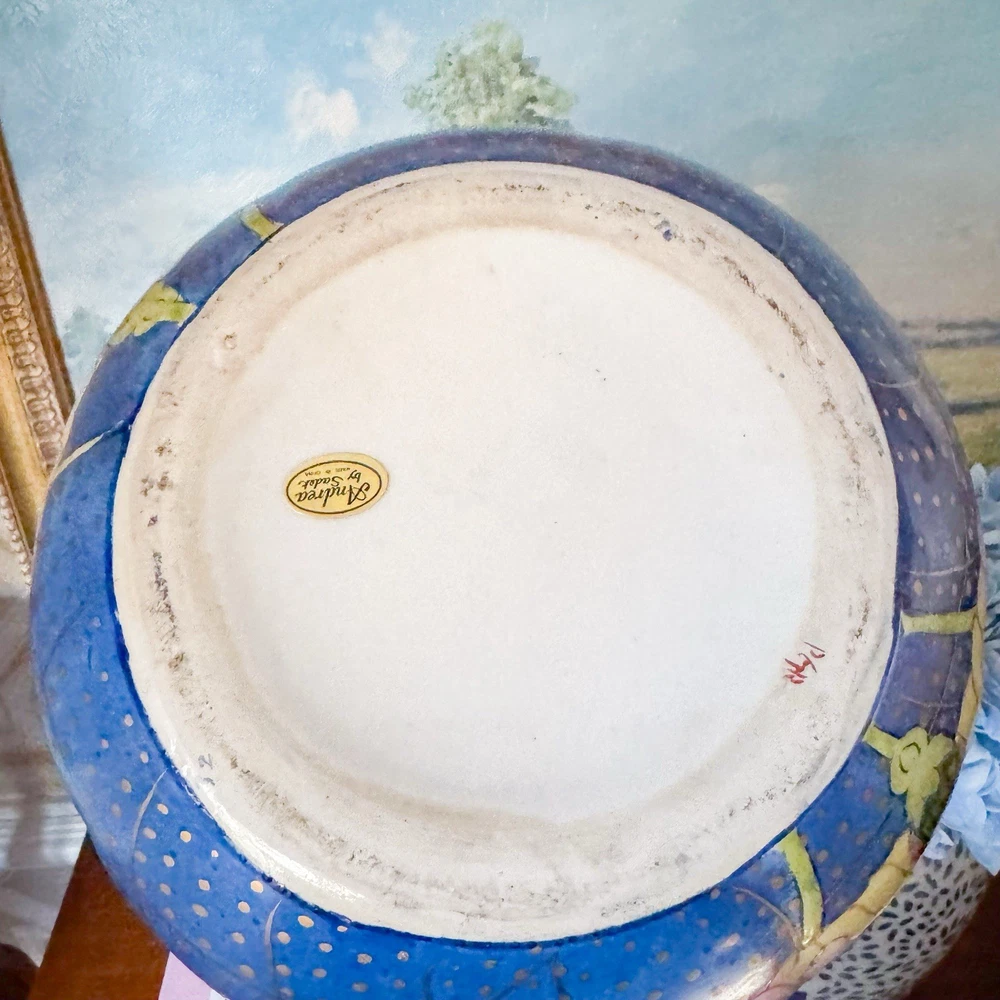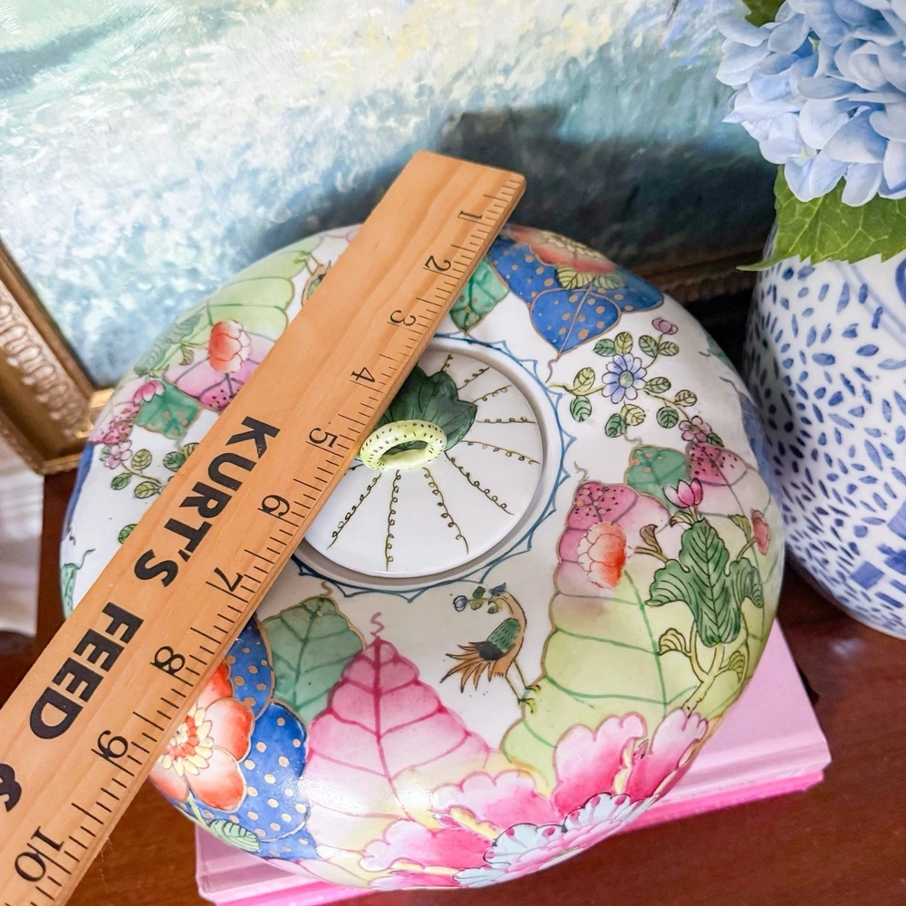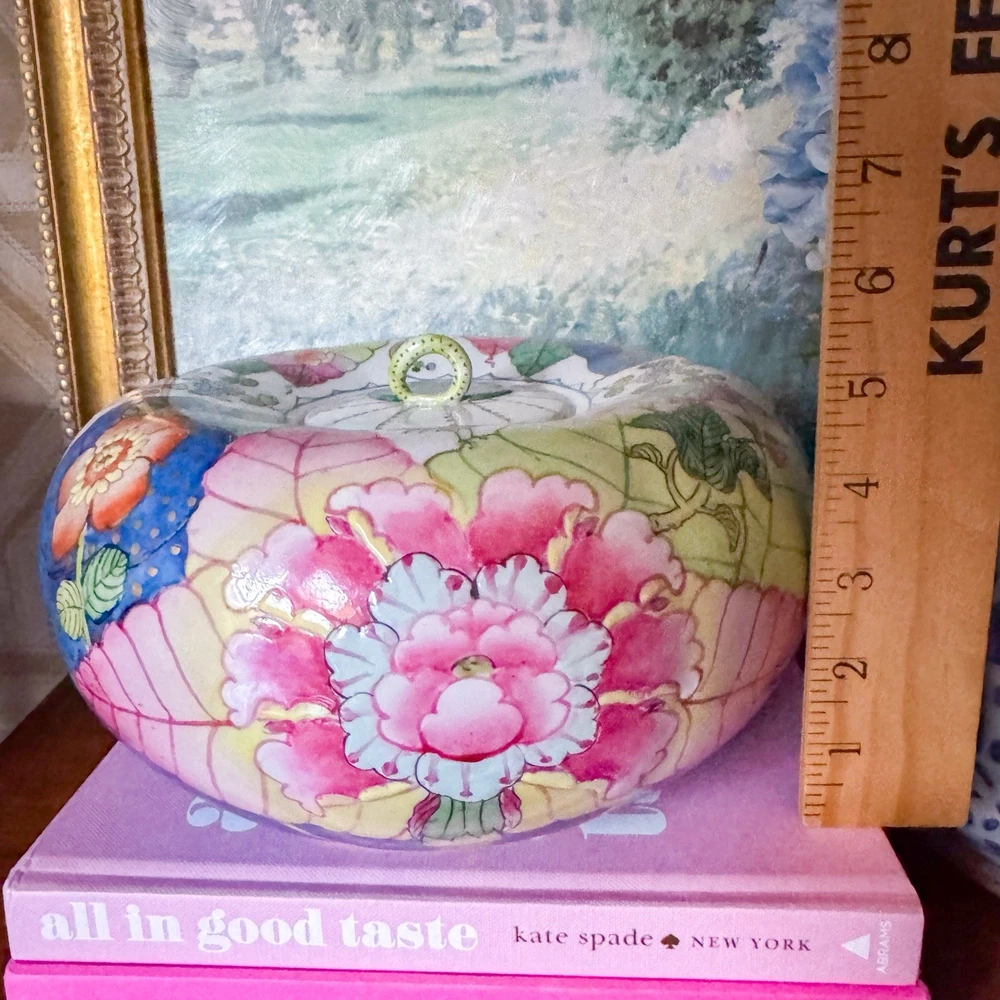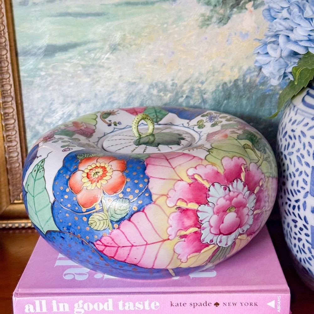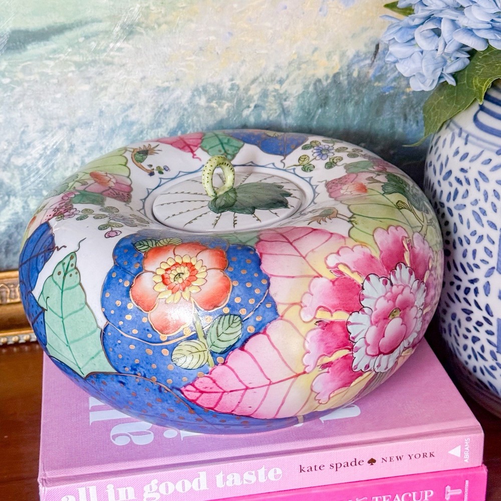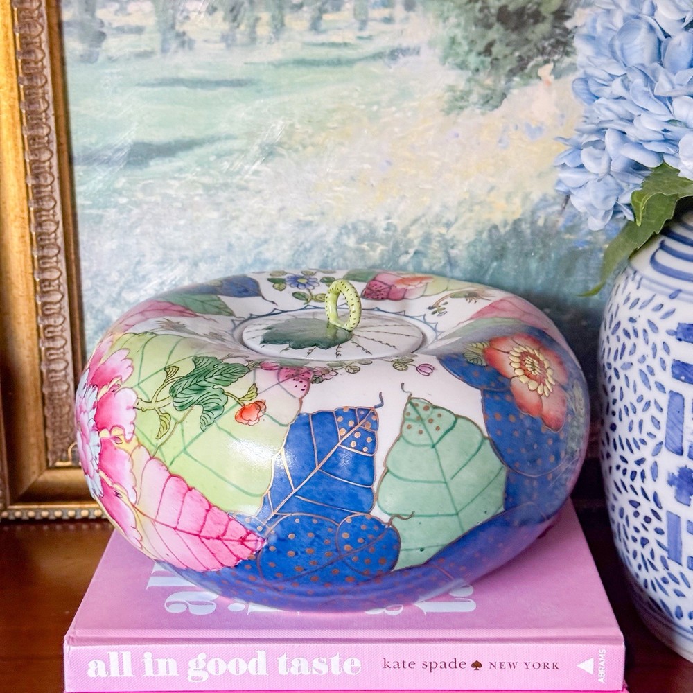 Fantastic rare tobacco leaf porcelain pumpkin jar. Perfect addition to your Thanksgiving decor or to any tobacco leaf collection! I just love the little stem handle. 30” circumference at widest. Andrea by Sadek sticker on bottom. In great vintage condition. Tiny flaw on the under side of the lid. Paint is still vibrant. Weighs a little over 4lbs Please note items may appear slightly different in color based on lighting in your own home. I use natural light and a light box to photograph my items. Also, with vintage items, slight imperfections or normal wear with age is to be expected. I strive to disclose and show any flaws. Photos are by far the best representation of the item. Smoke free pet free home. Same to next business day shipper. Always packed with the utmost care. I do use recycled shipping boxes to be kinder to the planet. If that is an issue please don't hesitate to reach out.