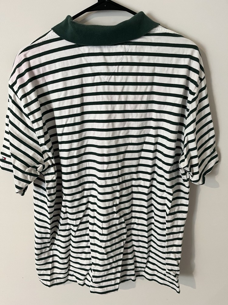 Elevate your casual wardrobe with the classic style of a vintage Tommy Hilfiger men's polo shirt. This time-honored piece features a crisp white and green striped pattern, short sleeves, and a traditional collared neckline with a three-button closure that adds a touch of sophistication. Crafted from 100% cotton, this polo shirt ensures breathable comfort and easy care, making it a versatile addition to your wardrobe for all seasons. The shirt comes in a size XL with a regular fit that's perfect for a relaxed yet polished look. Embroidered with the iconic Tommy Hilfiger logo, it’s a subtle nod to the brand’s premium quality. Whether you're hitting the golf course or enjoying a casual day out, this polo shirt is designed to meet the needs of both performance and style.