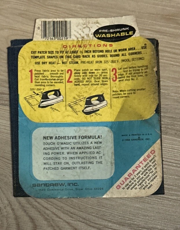 Add a vintage touch to your accessories, bags, jeans, pants, crafts, and apparel with this giant iron-on blue jean denim repair patch from Sandrew Inc. Measuring 12x10 inches, this patch is perfect for adding a unique touch to your items. Made in the United States, this high-quality patch is suitable for a wide range of uses. Whether you are a collector or a DIY enthusiast, this patch is sure to add a touch of personality to your projects. Damaged packaging. Fr