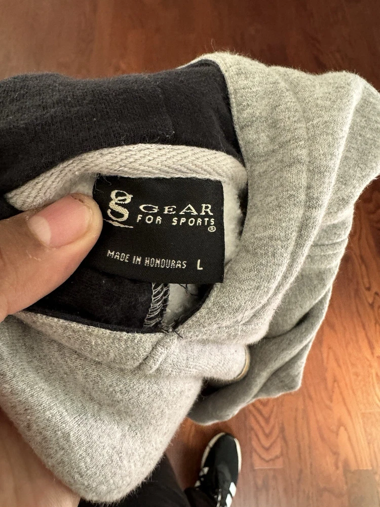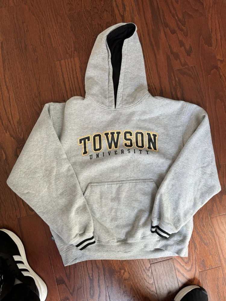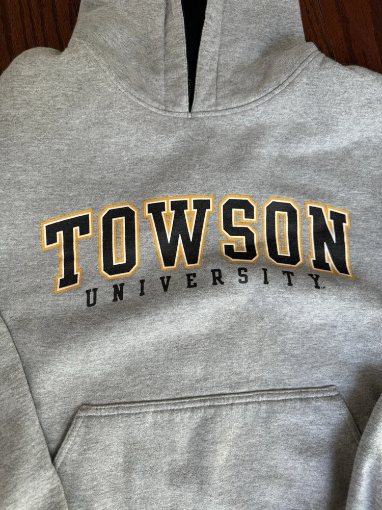 Show off your school pride with this vintage Towson University sweatshirt. The gray hoodie features the Tigers team logo and is made of a comfortable blend of polyester and cotton with microfiber fabric type. Perfect for all seasons, this pullover hoodie with a crew neck and long sleeves has a regular fit and is machine washable for easy care. It also comes with pockets for added convenience. This JanSport hoodie is perfect for gym and training, walking, cross-training, running, and jogging. The graphic print and accents make it a great addition to any activewear collection. It is a size L and has a solid pattern. Get your hands on this American-themed hoodie, perfect for showing off your school spirit.
