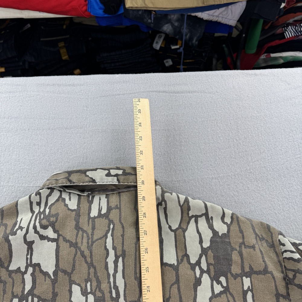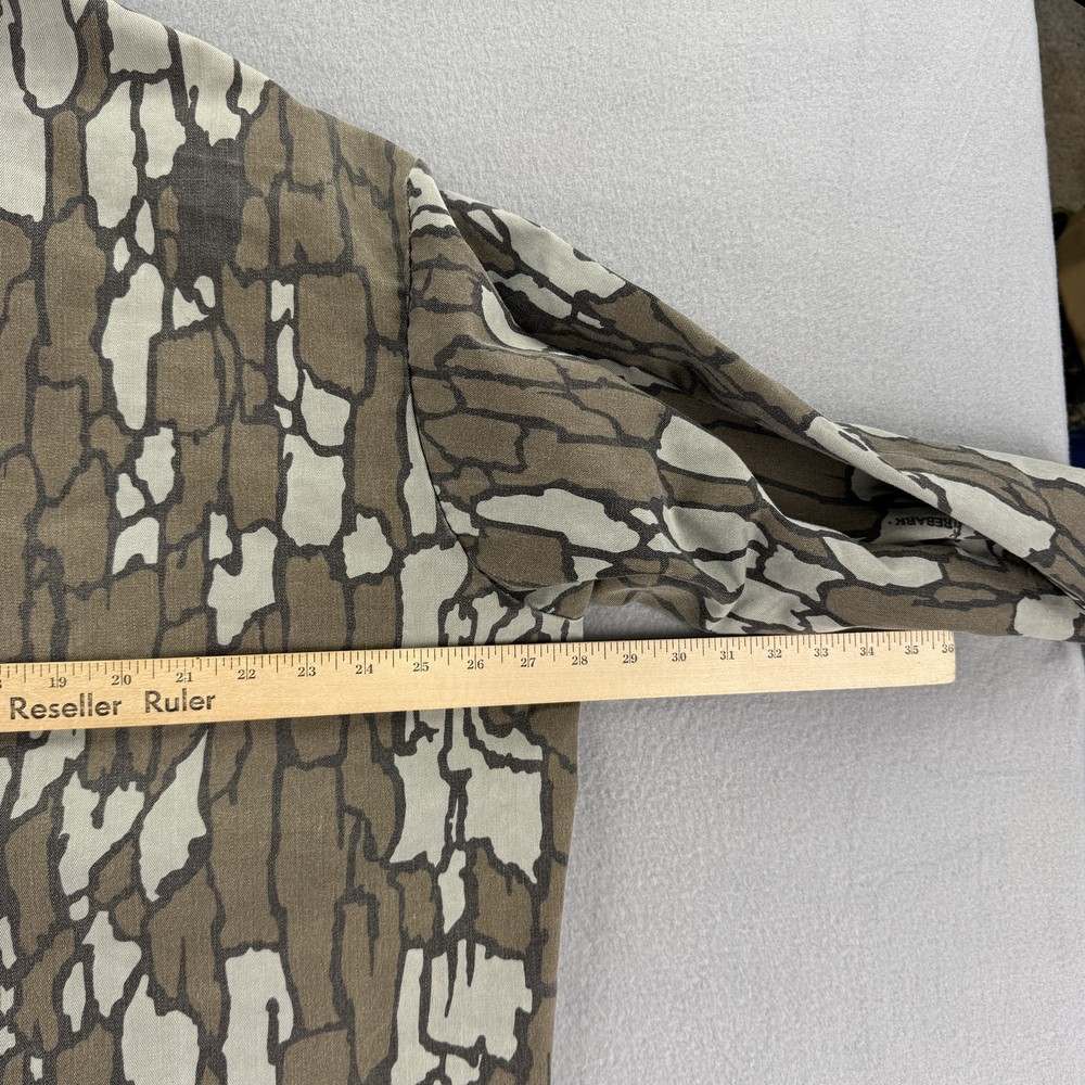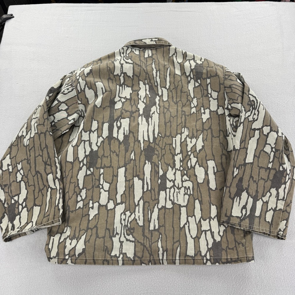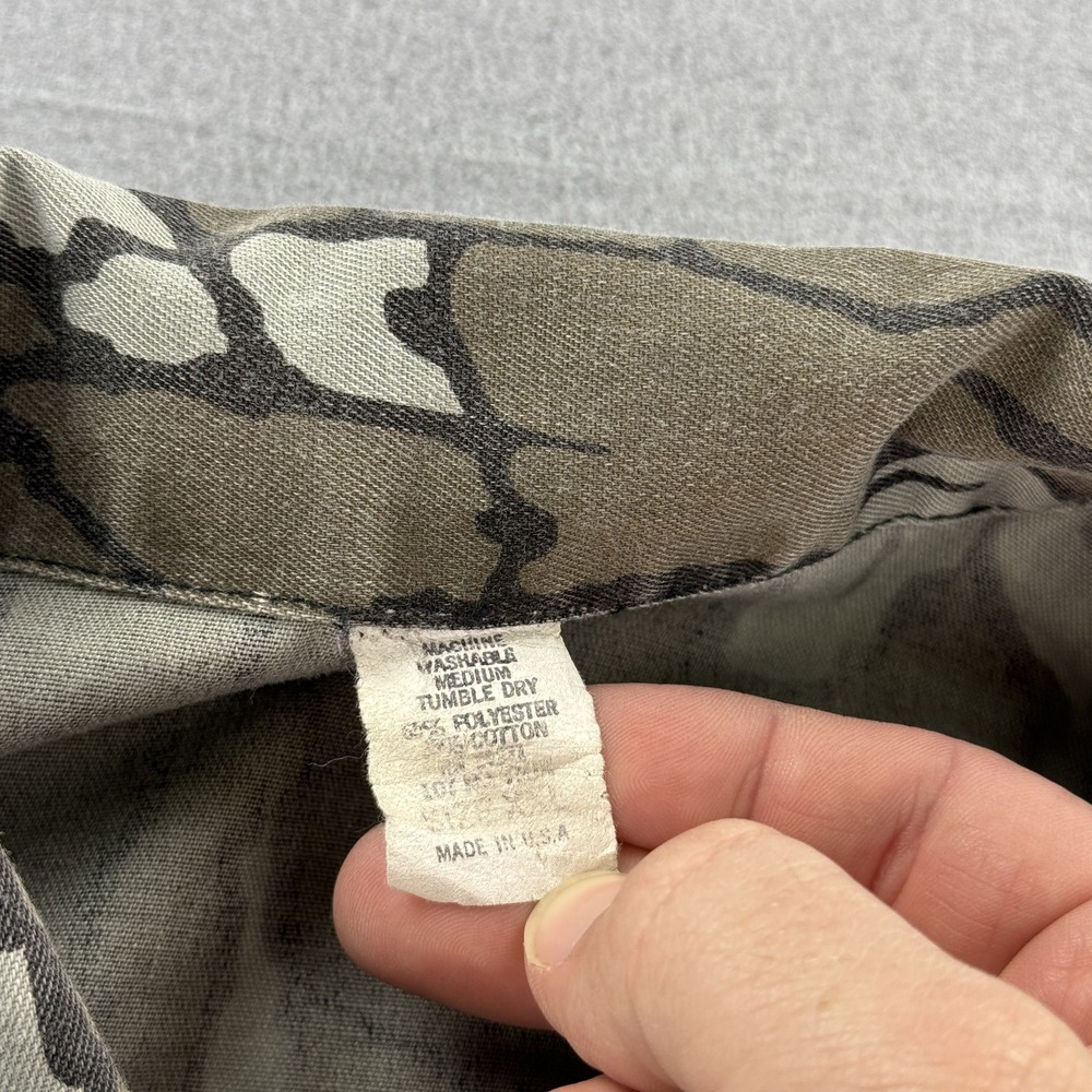 Vintage Trebark Camo Shirt Jacket Mens Medium Brown Camouflage Button Up Condition: Good, gently worn, no visible holes or stains Classic camo pattern in shades of brown, gray, and tan Two button-flap chest pockets Button front closure Long sleeves Tag size: Medium (Mens) Material: 65% polyester, 35% cotton Machine washable, tumble dry medium Made in USA Approximate flat measurements shown in photos: - Pit to pit: 26 in - Back length from collar seam: 30.5 in Era: 1990s Iconic vintage hunting style shirt jacket, perfect for outdoors, workwear, or streetwear