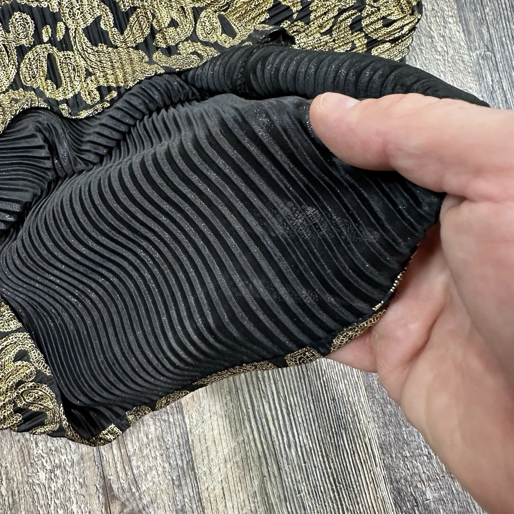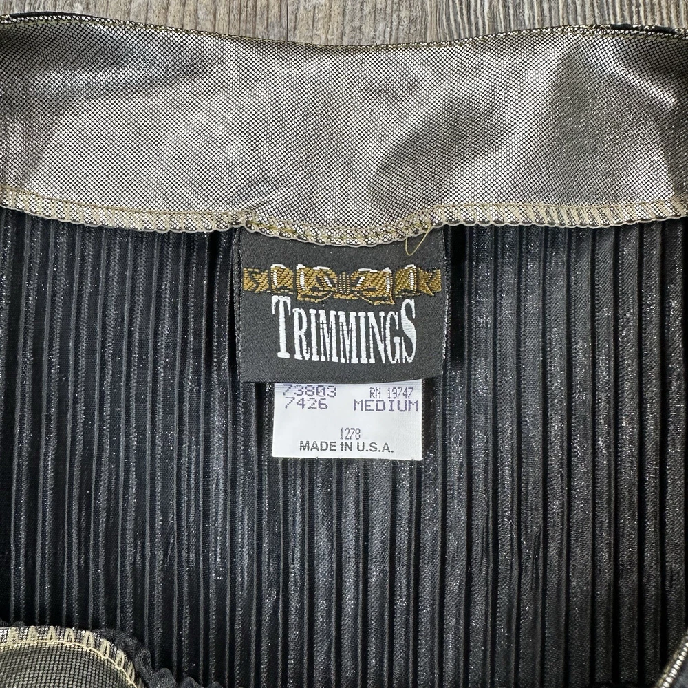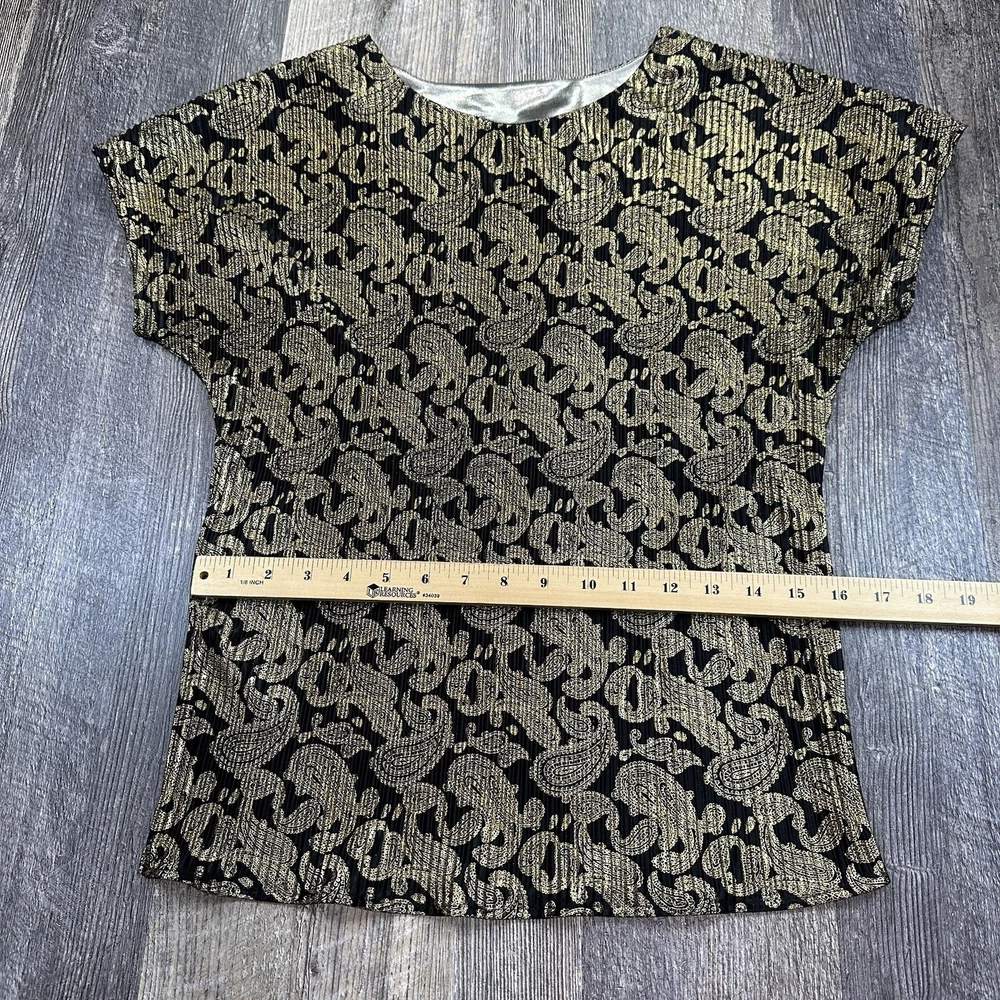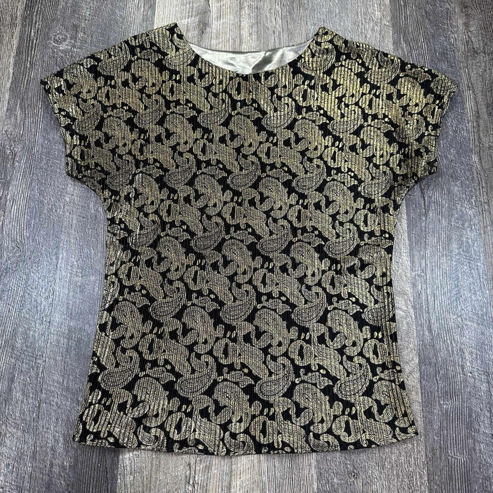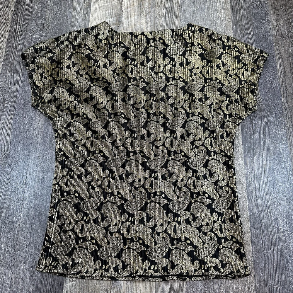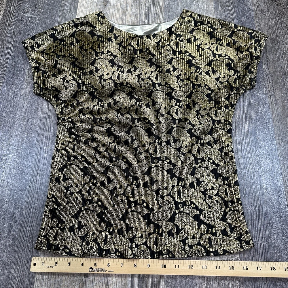 Vintage Women’s Trimmings Pleated Brocade Metallic Gold Blouse - Made in USA Women's Size - M Excellent Pre-Owned Condition NOTE: Please see all photos for condition as all flaws will be shown throughout the photos! * COLORS MAY BE DARKER OR LIGHTER OR SLIGHTLY DIFFERENT DUE TO MONITOR/PHONE/TABLET SETTINGS. Please refer to the "condition description" for inspection notes. Actual measurements may differ from the tag due to potential shrinkage, stretching, hemming, or manufacturer error. It is common for pre-owned jeans to shrink or stretch based on how they were washed/dried/worn from previous owners. If measurement differs more than 1.5" either way from what the tag says, I will list the items as actual measurements to ensure proper fit. I recommend measuring yourself before ordering online to help find the perfect fit for you. My shipping discount: $3 shipping on each additional item you add to your order!