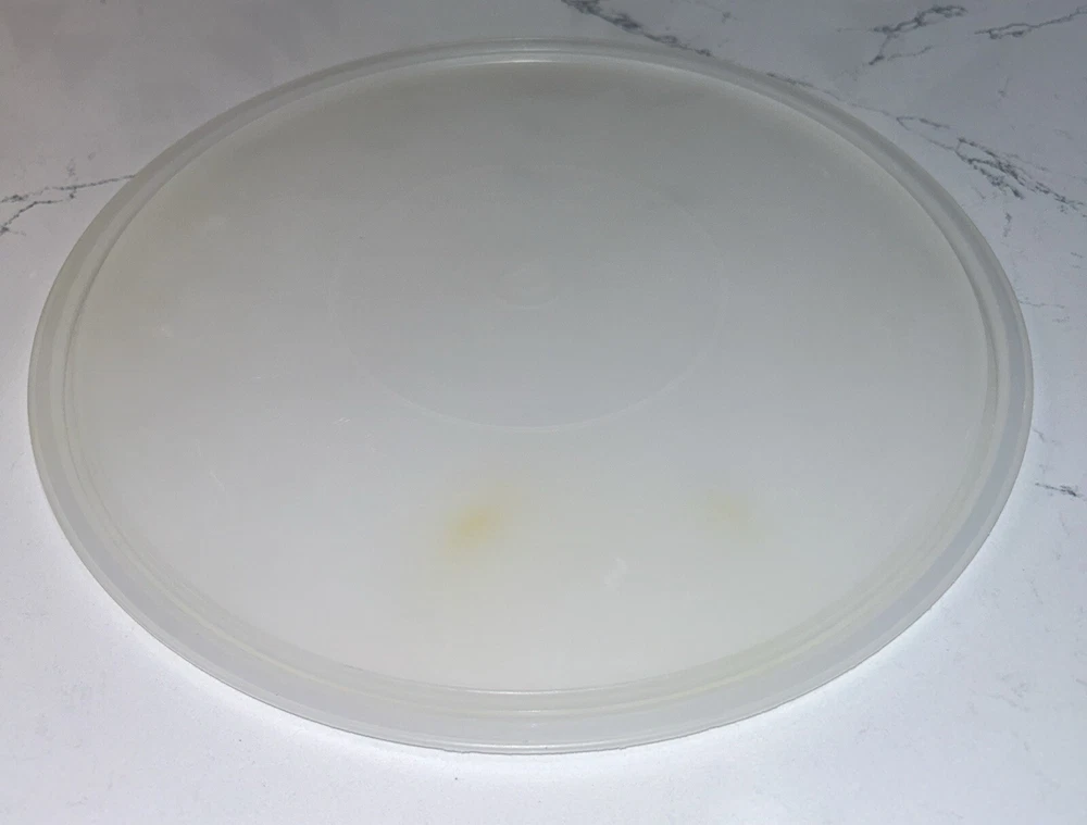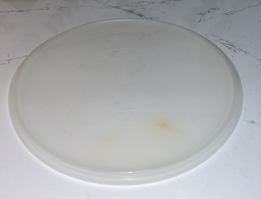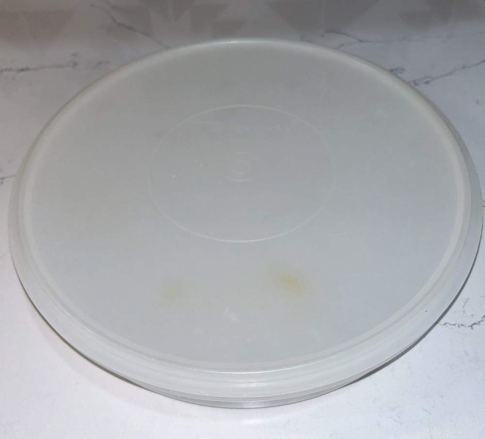 This vintage Tupperware storage container set is perfect for carrying and storing desserts and other food items. The set includes a large round carrier with a clear lid, measuring 12 inches in diameter and 2.5 inches in height. The carrier and lid are made of durable and easy-to-clean plastic, and the set is stackable for convenient storage. The design is solid and retro, with a multipurpose feature that can be used for food and kitchen themes. The carrier and lid are reusable, making it an environmentally friendly choice. This set is a great addition to any kitchen and perfect for those who love vintage or retro styles. Please note any imperfections, discoloration, scratches, etc. in the photos. Will provide more photos upon request.