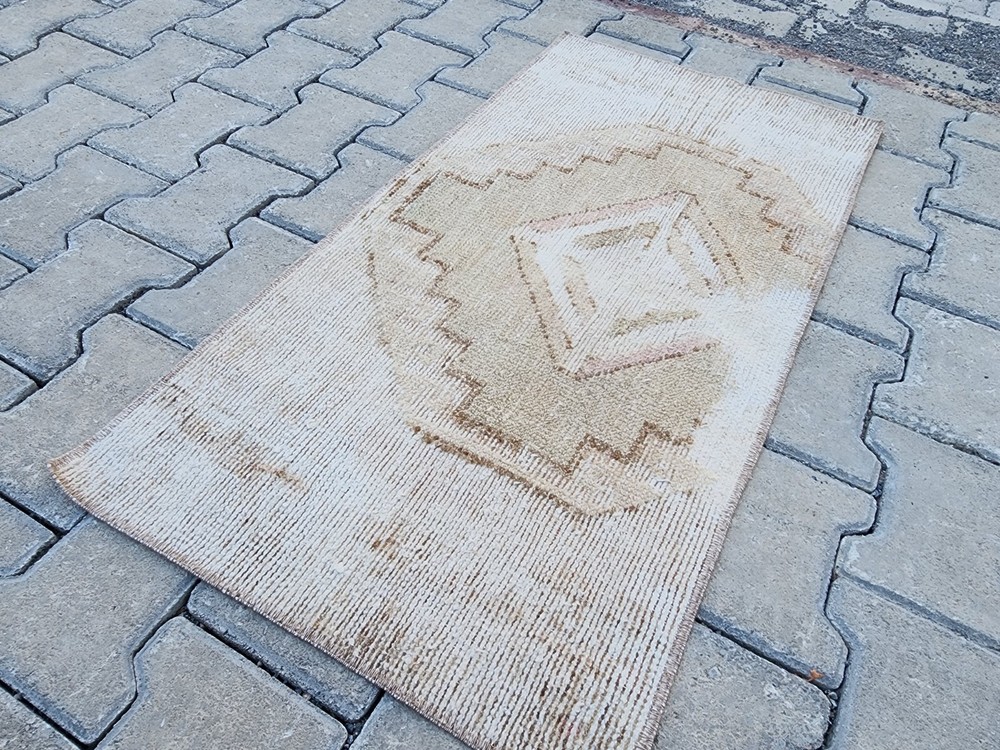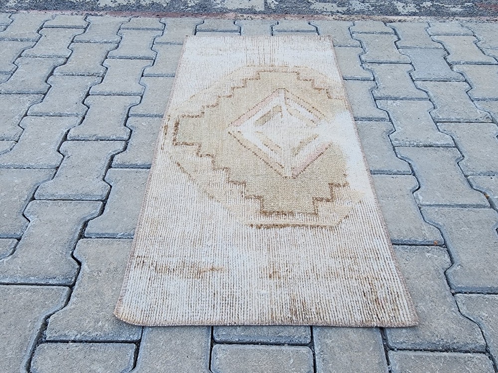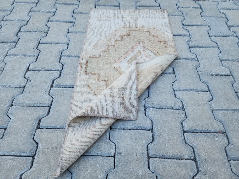 Turkish Oushak Rug – 1.7x3.4 ft, Beige and Yellow, Minimal Geometric Design Vintage Handwoven Wool Rug – Neutral Washed Aesthetic for Entryways or Decor Corners This vintage Turkish rug features a soft beige field with a central geometric diamond medallion in pale yellow and taupe tones. With its minimal pattern and sun-washed appearance, this piece is perfect for serene, neutral, or Scandinavian-inspired interiors. Handwoven from 100% wool and dyed with plant-based pigments, it’s ideal for layering, bedside accents, or hallway styling. Product Details: 📌 Origin: Turkey 📌 Material: 100% wool, vegetable dyed 📌 Weaving: Hand-knotted 📌 Pattern: Central diamond medallion 📌 Colors: Beige, soft yellow, washed taupe 📌 Condition: Gently faded / washed vintage condition 📌 Size: 52 x 104 cm (1.7 x 3.4 ft) 📌 Shipping: Free worldwide shipping in 1–3 business days 📌 Returns: 30-day return policy 💬 Message us for any inquiries!