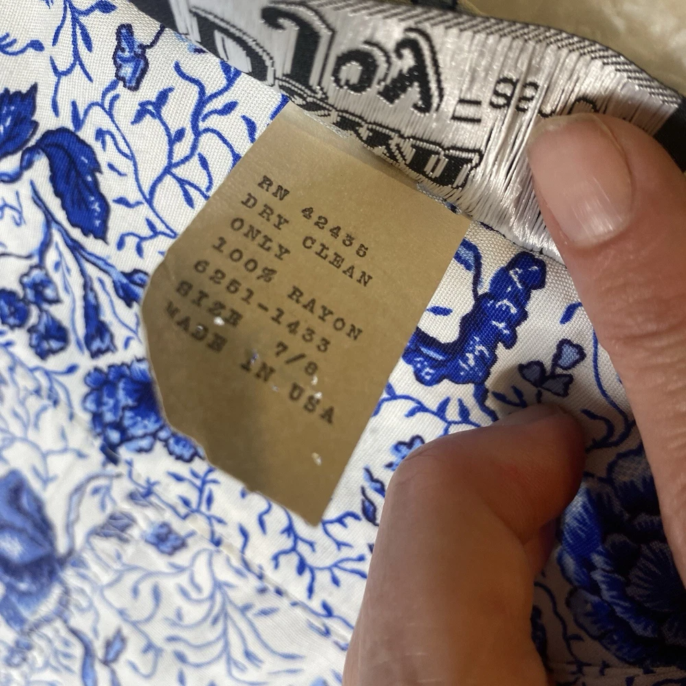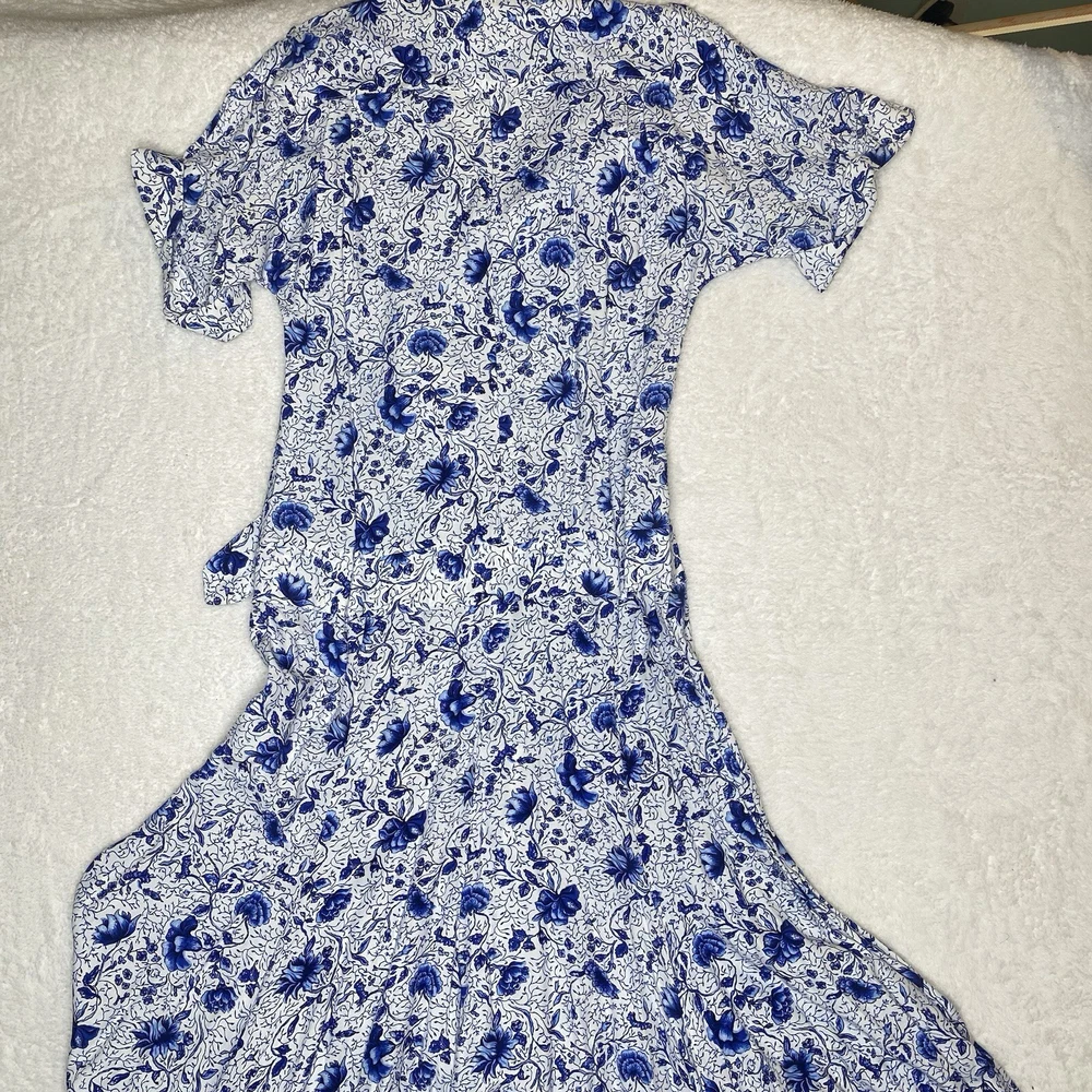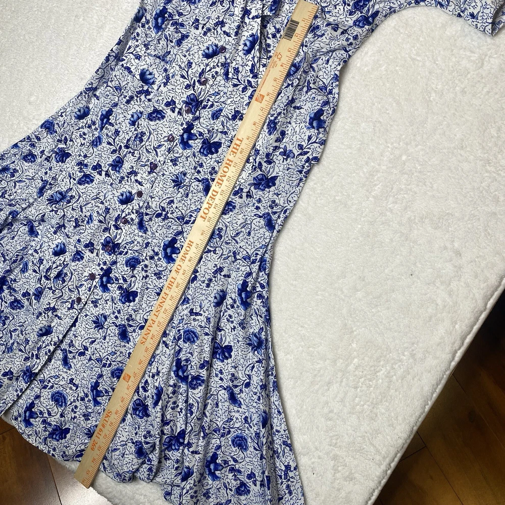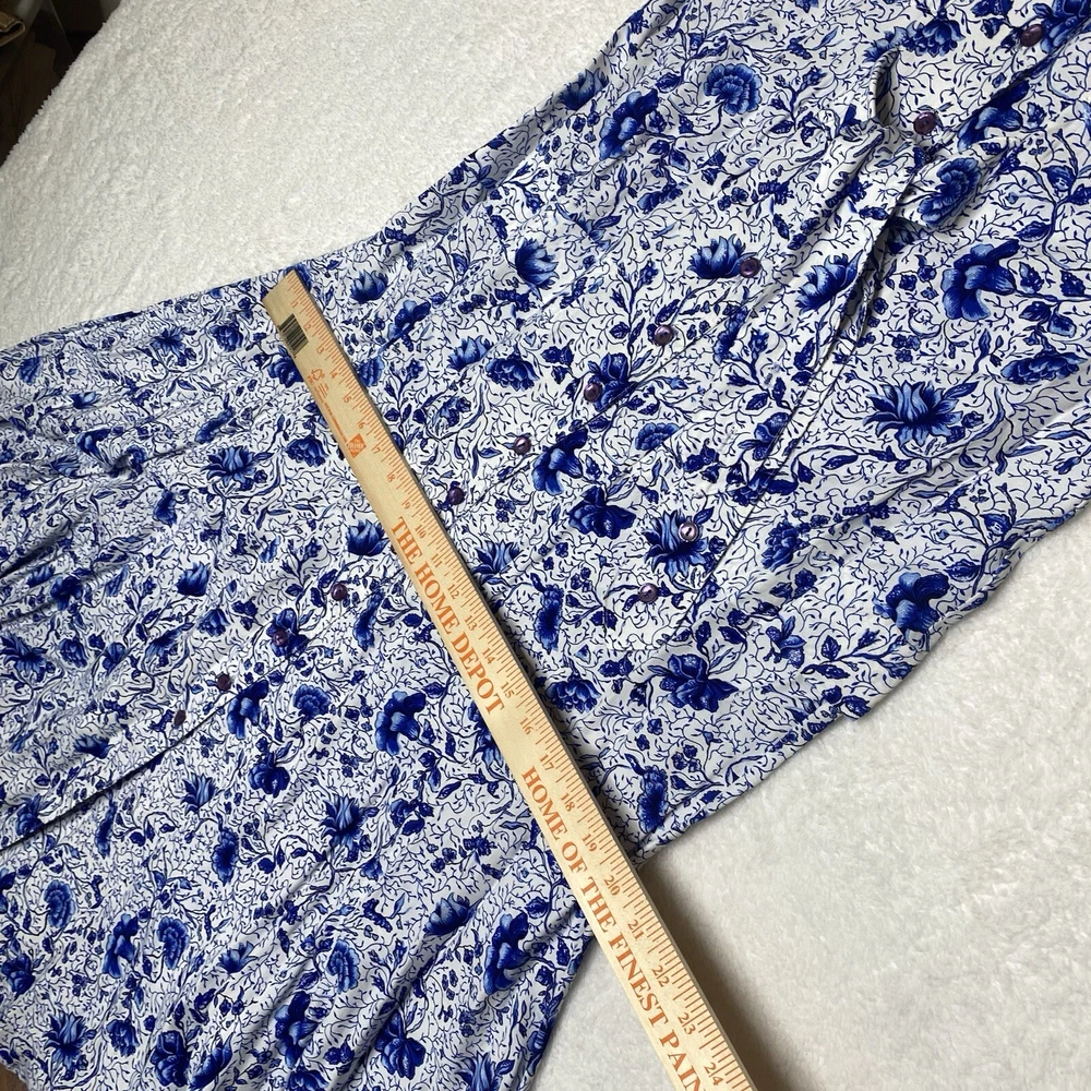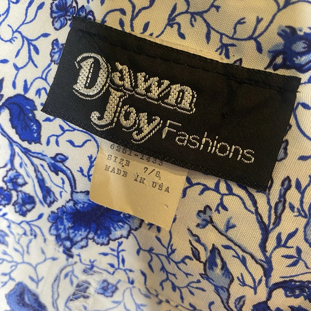 Vintage USA Dawn Joy 1970s 1980s White blue Maxi Dress V-Neck with collar button down front 7/8 excellent condition, tie front cinch, prairie, cottage core, whimsical, preppy ๐ specific measurement shown in photos ๐