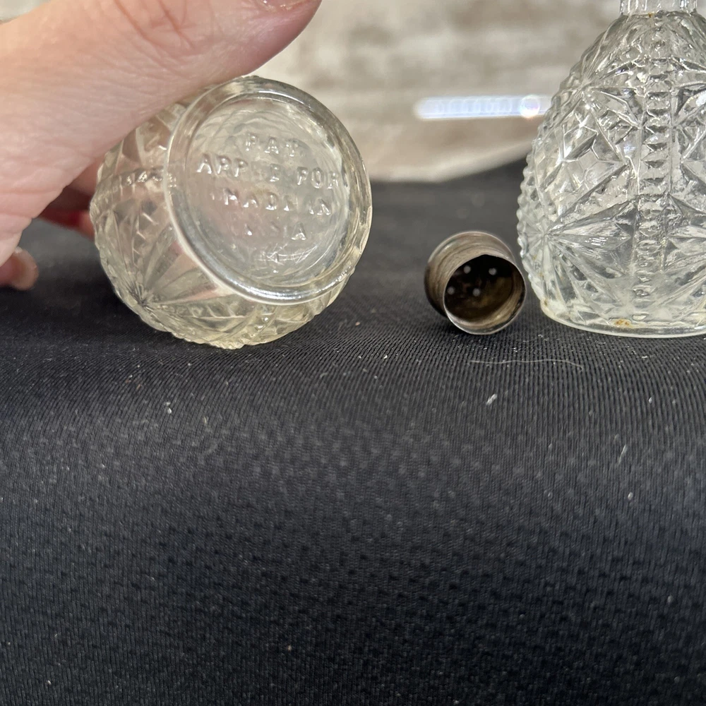 Elevate your dining experience with these petite crystal salt and pepper shakers, complete with stylish silver caps. A touch of Victorian elegance, they are crafted from clear glass, making them a subtle yet sophisticated addition to any table setting. Proudly made in the United States, these original shakers exude a timeless charm without the need for any modifications. Their age and the country of manufacture remain a mystery, adding an air of intrigue. Perfect for collectors and enthusiasts of decorative tableware, these shakers are a must-have for those who appreciate the finer details in life. Item sold as is Made in the USA Caps appear to be silver but have age on them. Shakers are 2 1/4 inches tall tall and about 1 3/4 inch wide. See photos for physical condition