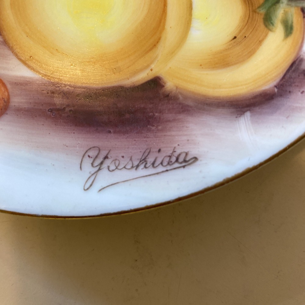 Japanese artist Yoshida Post war Japan Ucagco manufacturing. Beautiful bright colors are hand painted on this fruit themed decorative small plate. 6” across. Is in great condition and has no chips or cracks.