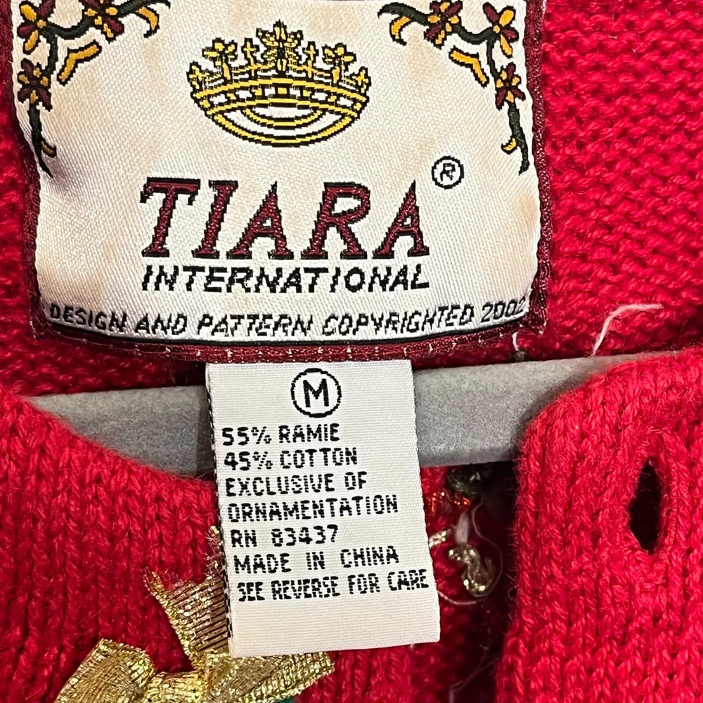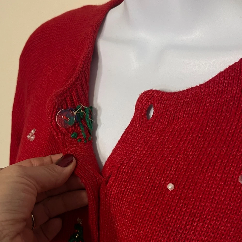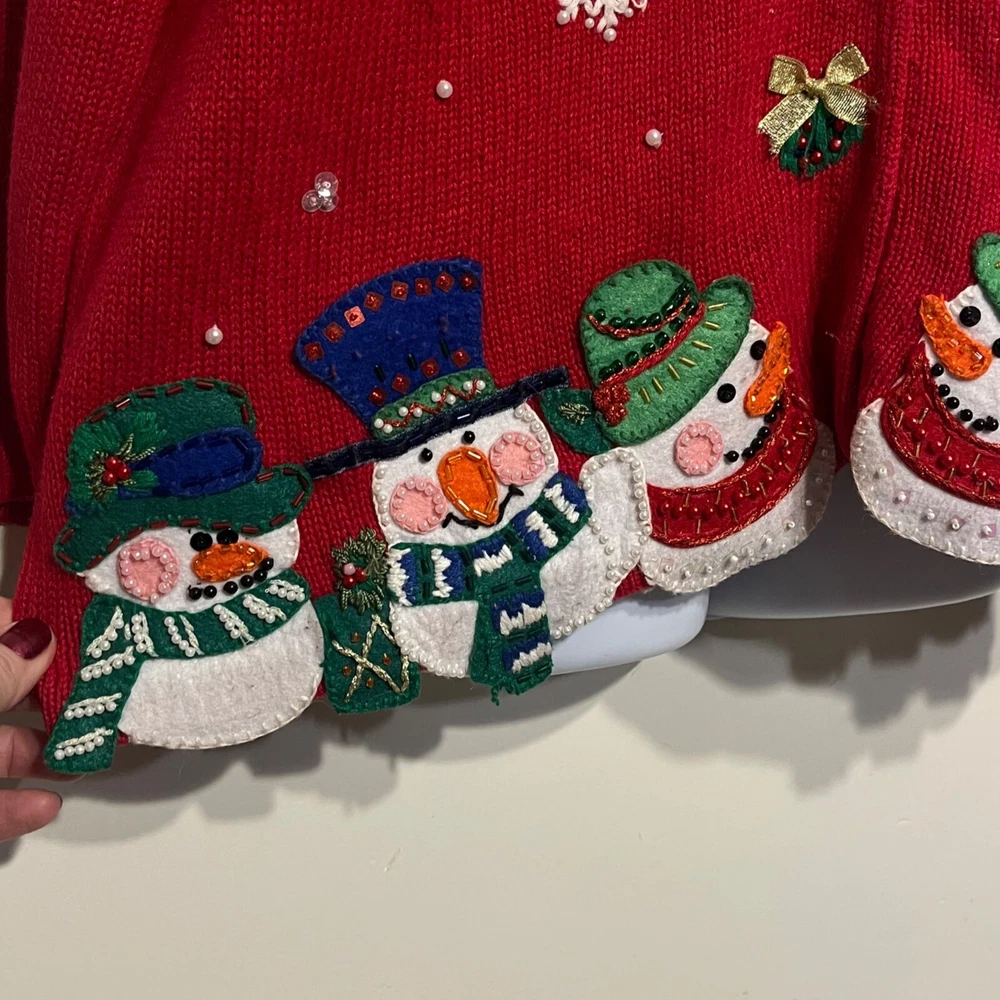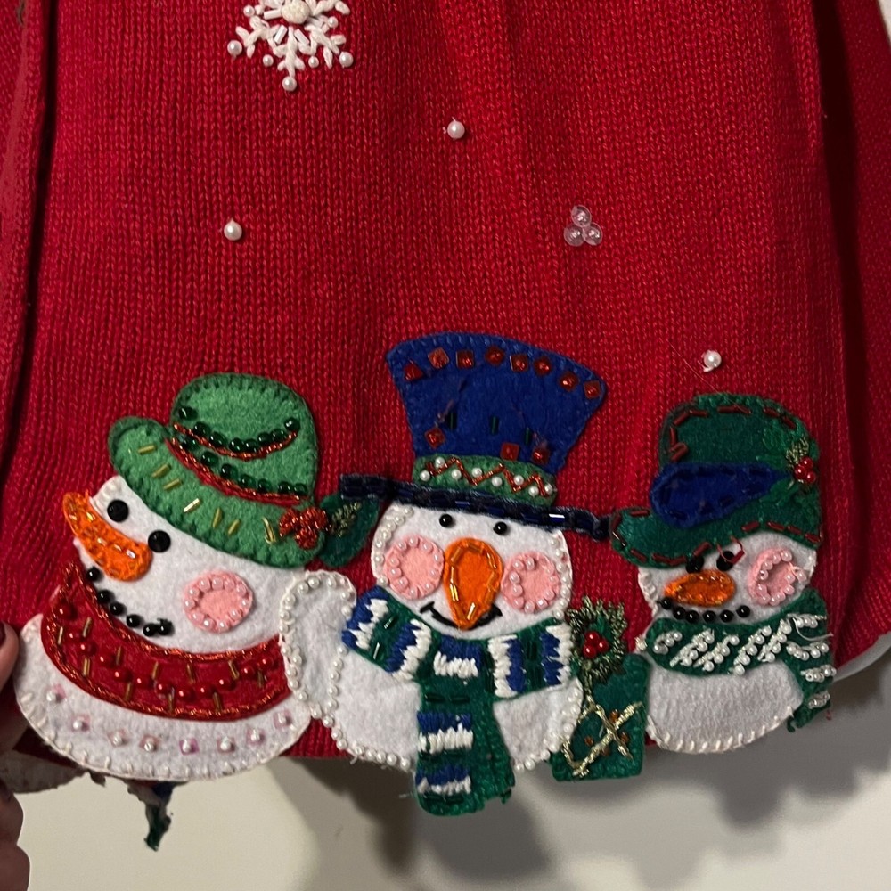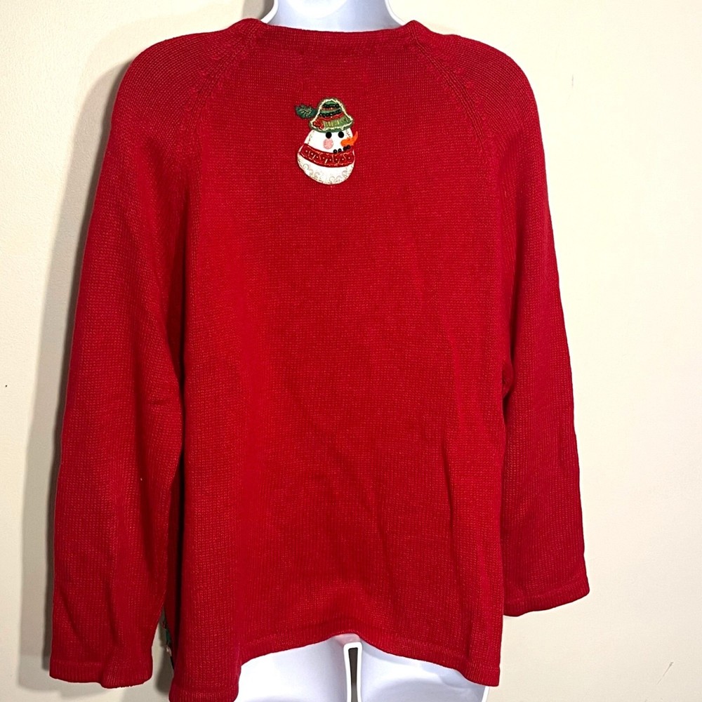 Ramie/Cotton Vintage 2002 Y2K Hidden front buttons Red with embroidered snowflakes, snowmen, Chriastmas trees Good vintage condition. Very faint area of discoloration on front. Hard to see unless you're looking for it. See last photo. Ugly Christmas sweater, grandma, vintage, ornate, unique, eye-catching, colorful , bows, cottagecore, embellished, Across the chest (armpit to armpit) 21 Length 26