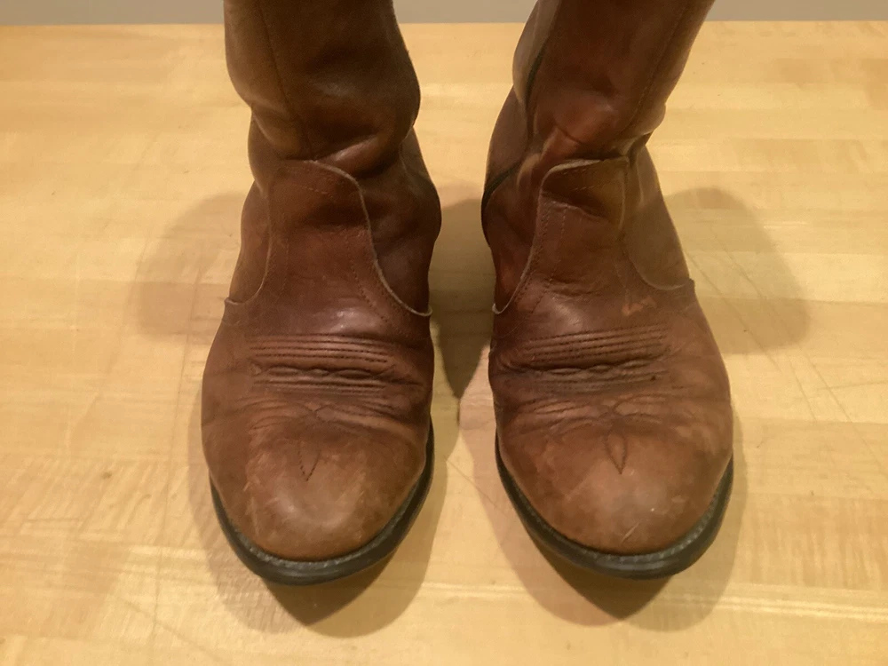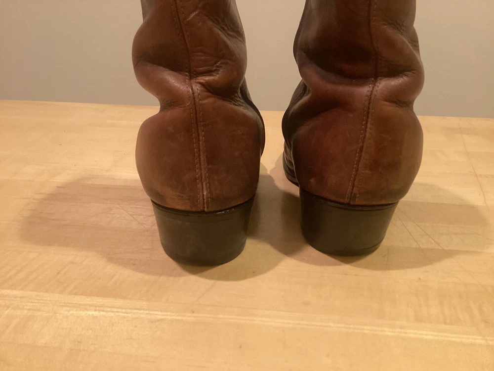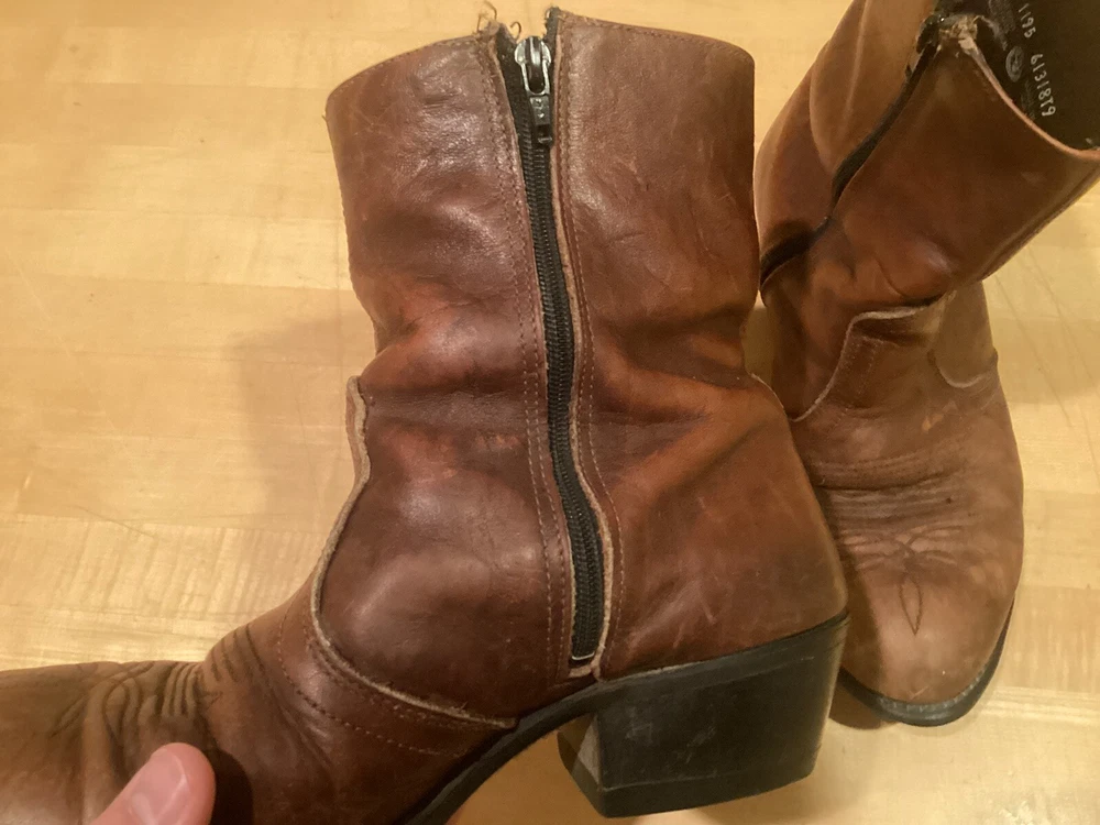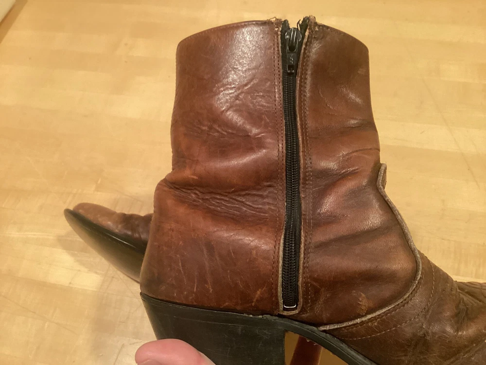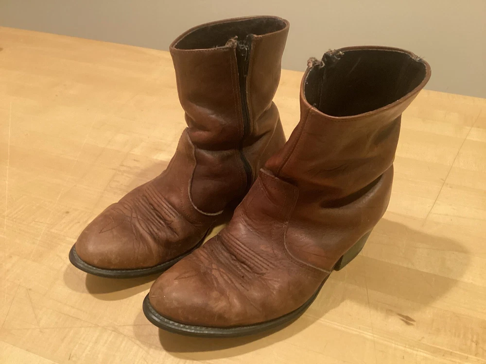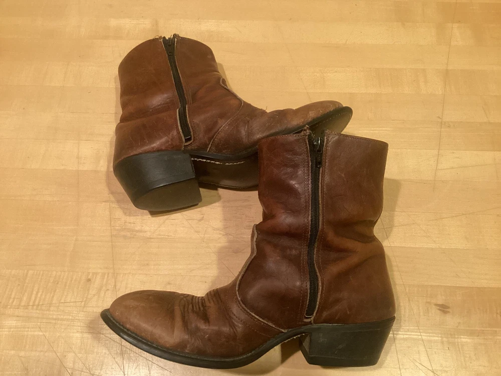 Vintage higher quality men’s western style ankle zip cowboy boots. Show signs of wear and use, missing insoles. Even heel wear. Fast free shipping