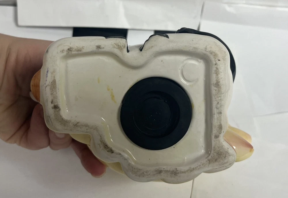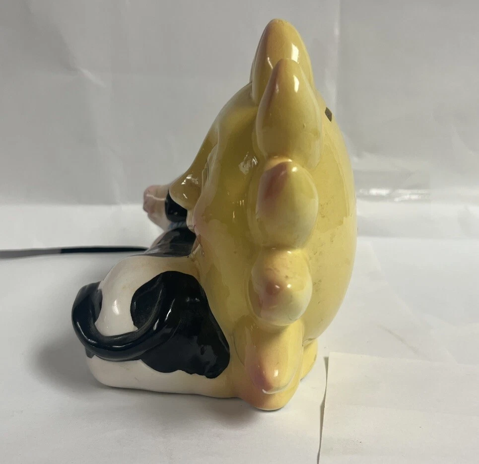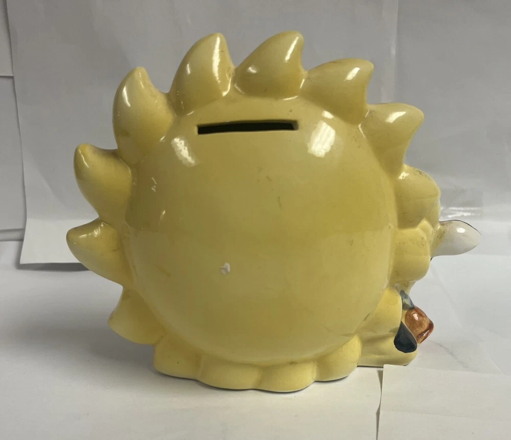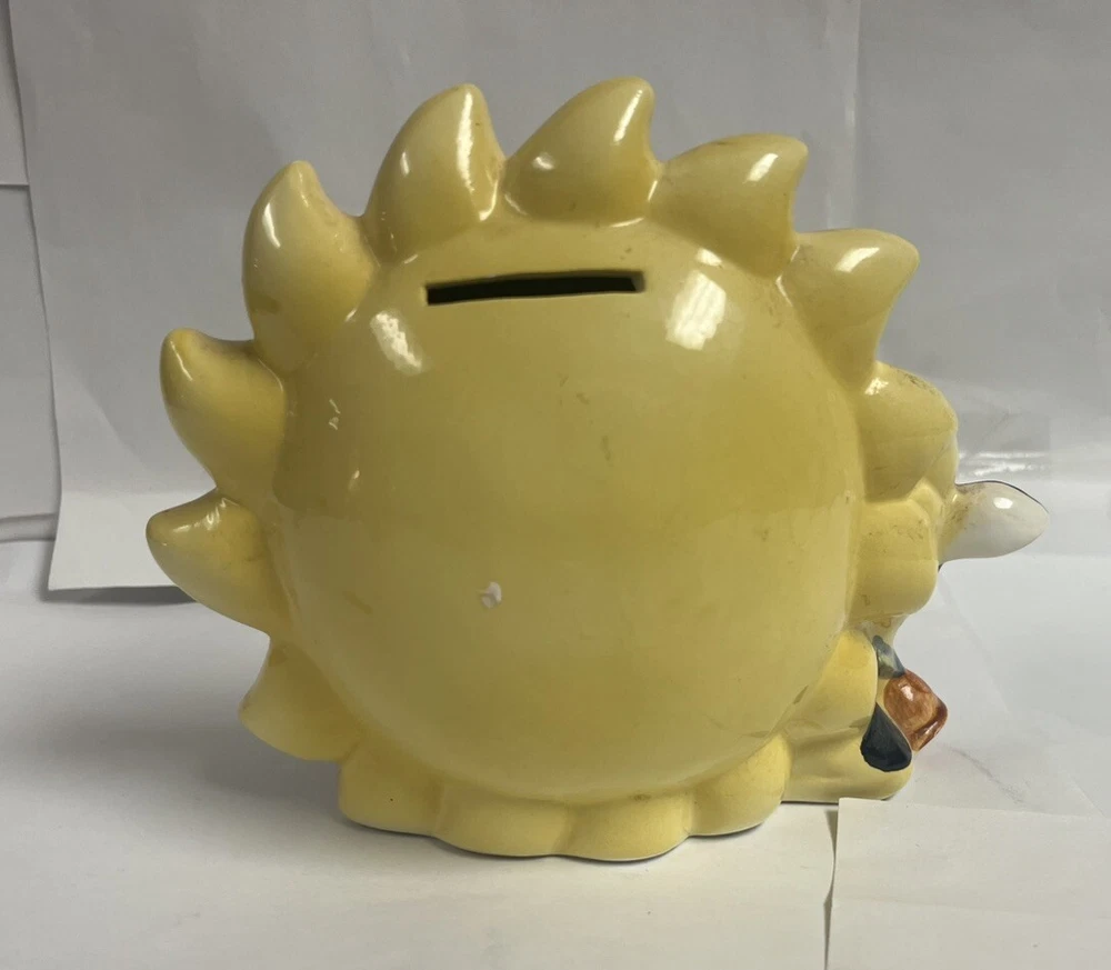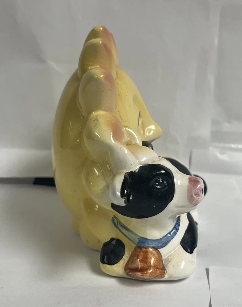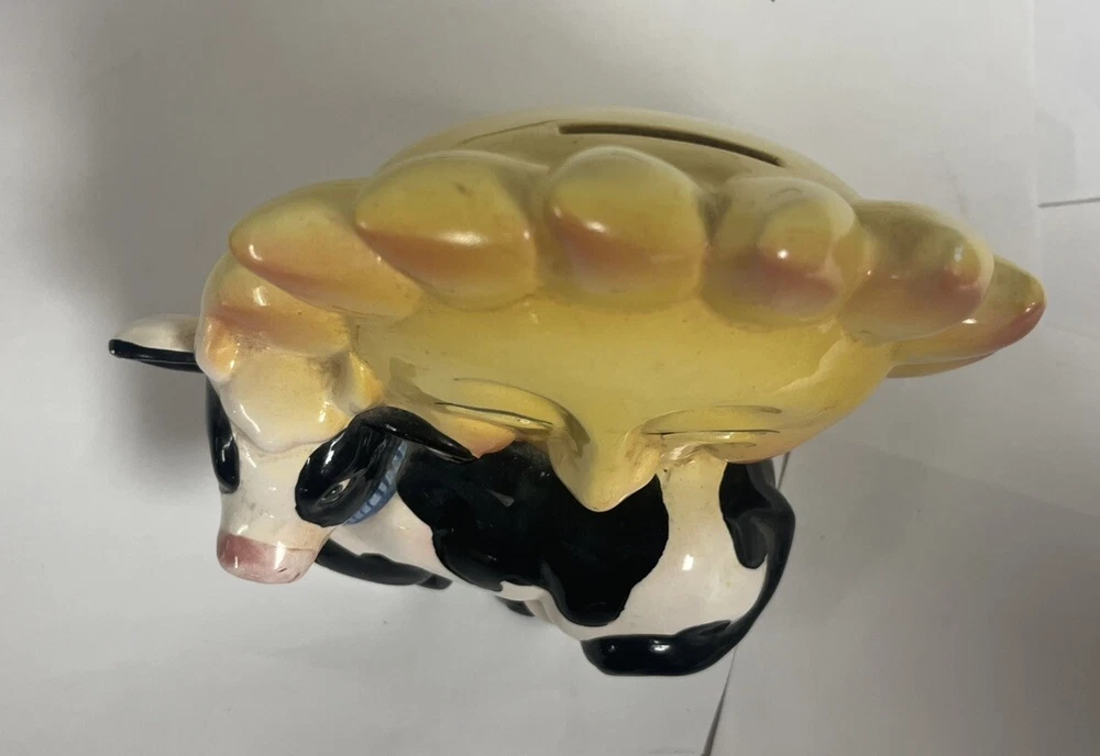 This delightful vintage ceramic coin bank features awhimsical design of a white cow with black spots and a blue collar, standingwith a vibrant sun behind it. The sun, with its yellow and orange gradient,serves as the coin slot, while the rubber stopper at the bottom allows for easycoin retrieval. The charming hand-painted details and the presence of crazingsuggest that this piece is from the mid-20th century, making it both afunctional and decorative addition to any collection. Item Specifics: Brand: Unknown Origin: Unknown Type: Coin Bank Material: Ceramic Design: White cow with black spots, blue collar, and yellow/orange gradient sun Features: Coin slot on the back of the sun, rubber stopper at the bottom, hand Painted Finish: Glossy Glaze Size: 7 in long, 5 in tall, 4 in wide Condition: Good vintage condition with minor crazing, small areas of missing paint. See photos. Markings: Unmarked