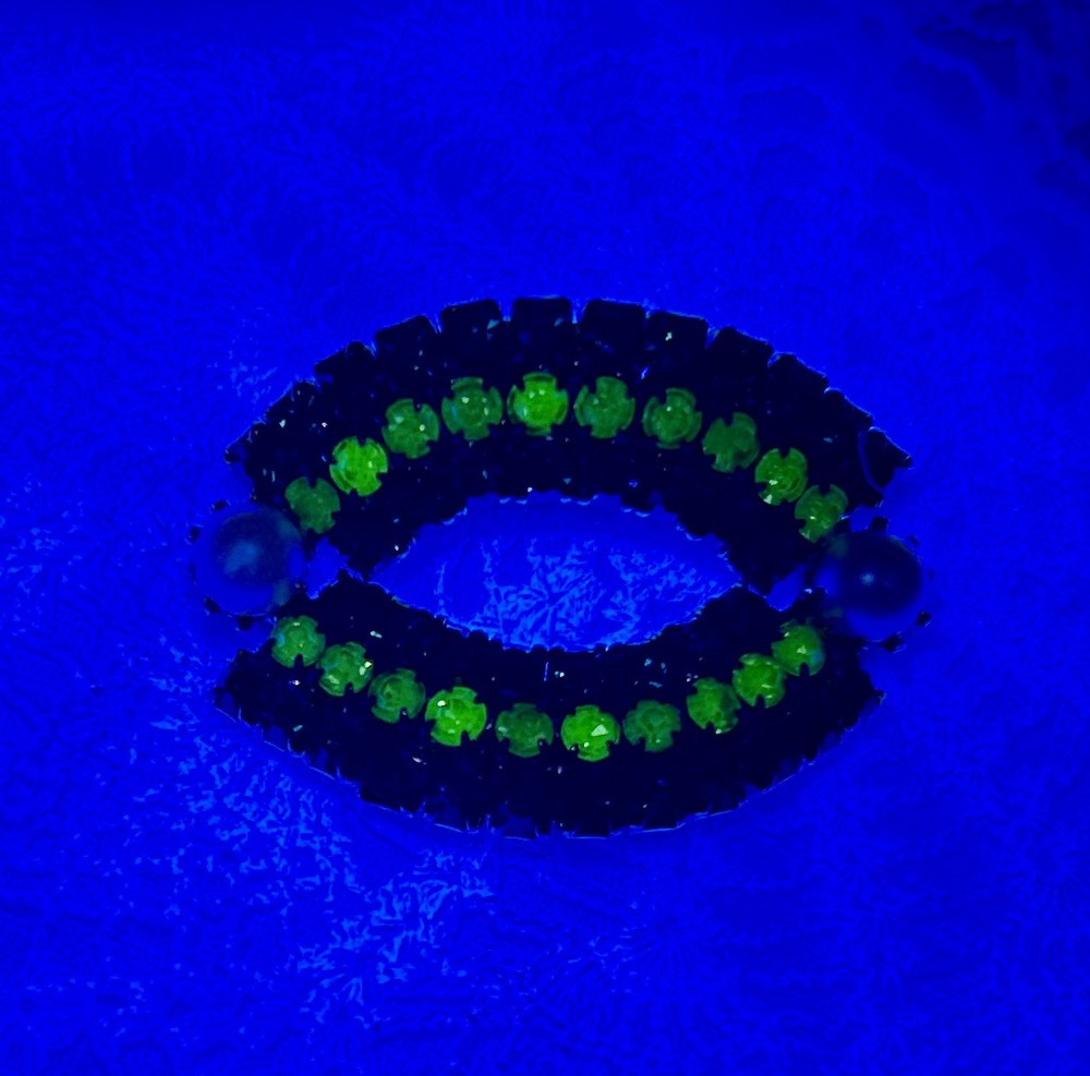Vintage Brooch Uranium Glass Green Rhinestone Faux Pearl Prong Set Retro