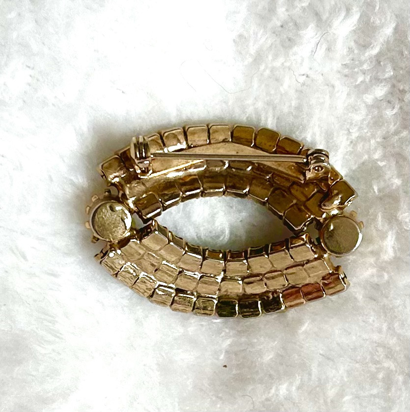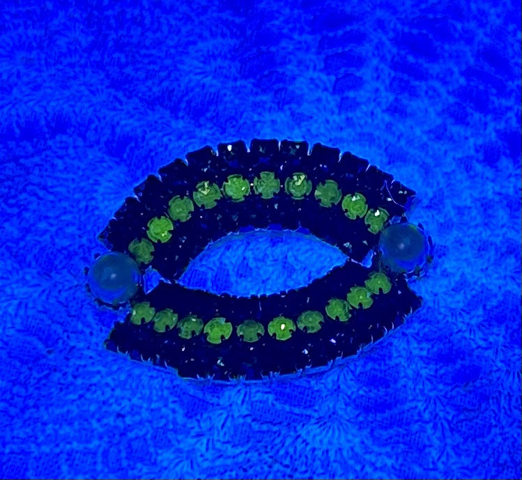 Vintage Uranium Glass Brooch with Green Rhinestones and Faux Pearls