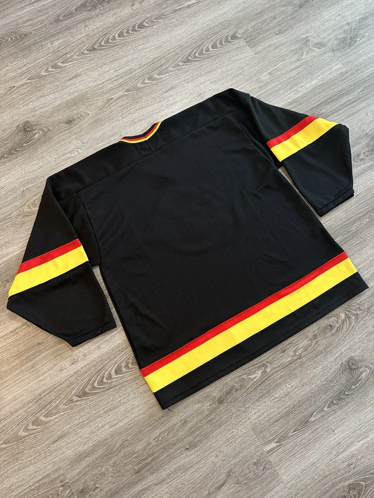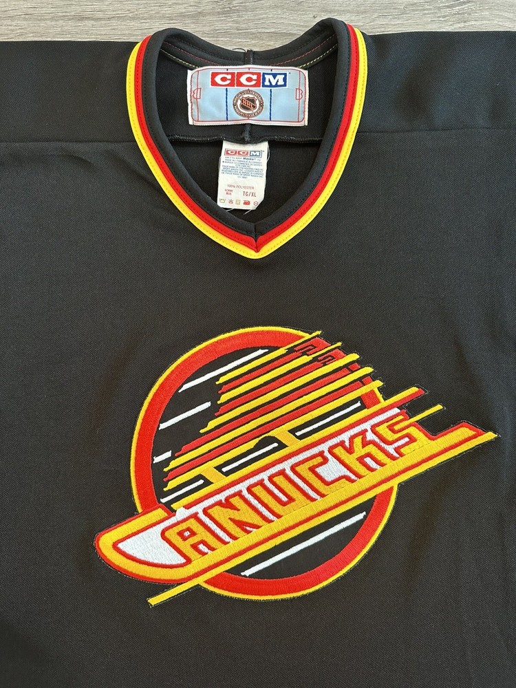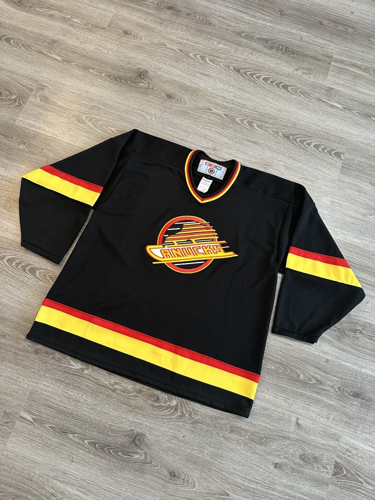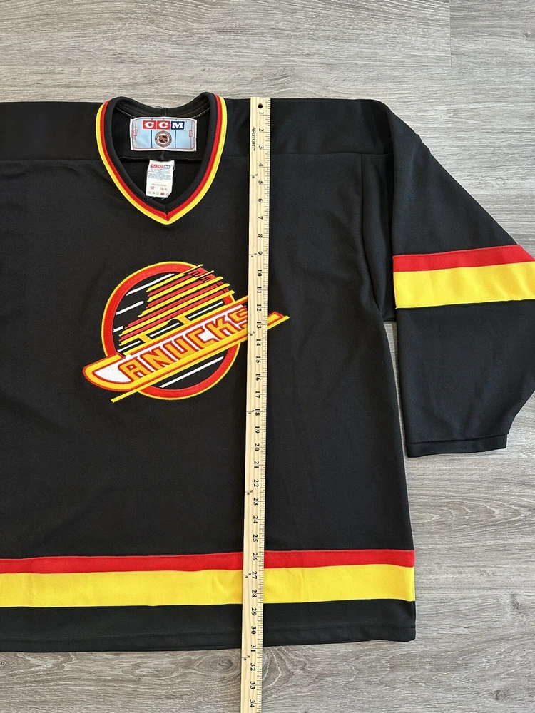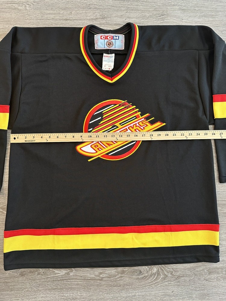 Celebrate the Vancouver Canucks in style with this vintage CCM Black Skate NHL Hockey Jersey. Made for men in size XL, this officially licensed jersey is perfect for any hockey fan. The classic black color and authentic design make it a must-have for any Canucks fan. Show your team spirit during the regular season with this jersey. Measurements shown in photos.