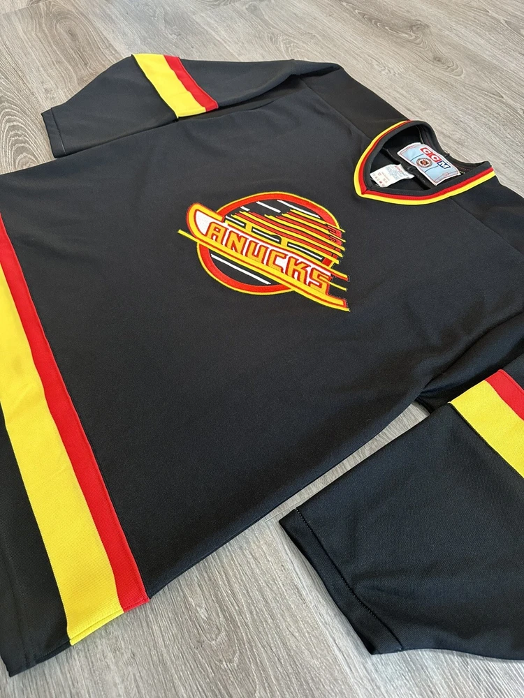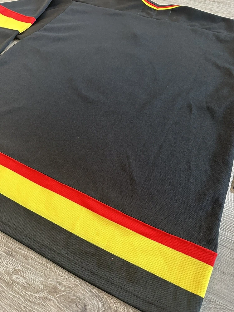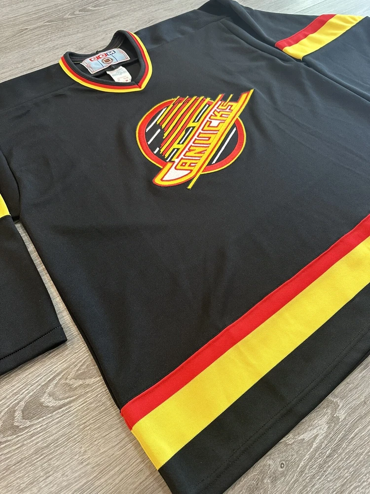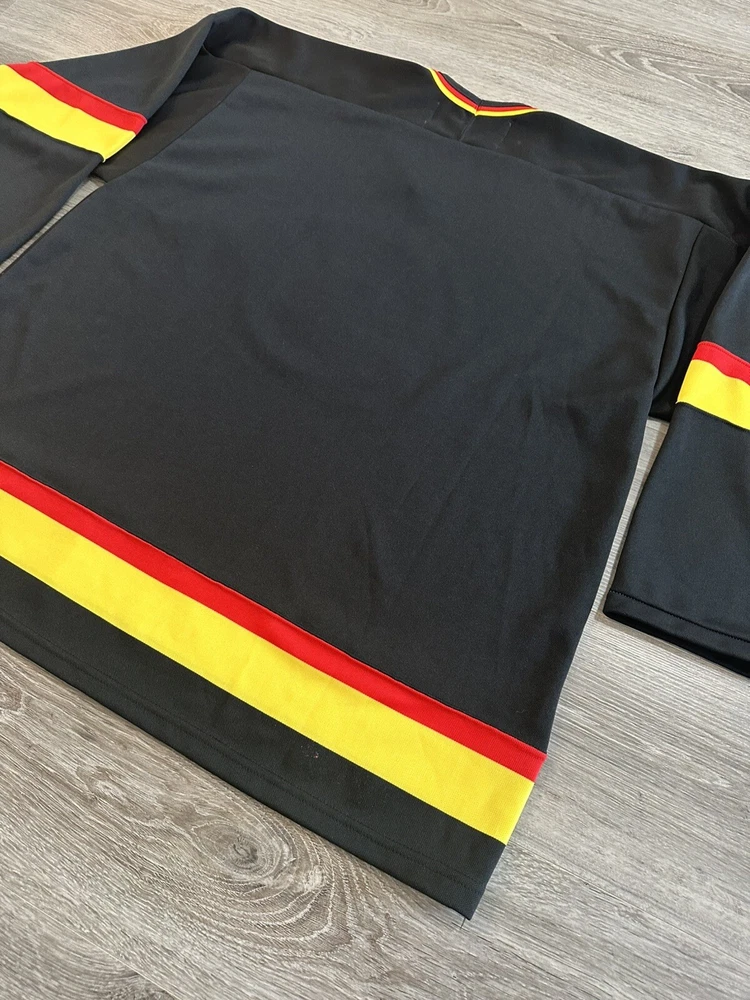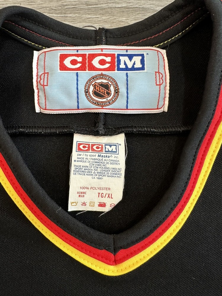 Celebrate the Vancouver Canucks in style with this vintage CCM Black Skate NHL Hockey Jersey. Made for men in size XL, this officially licensed jersey is perfect for any hockey fan. The classic black color and authentic design make it a must-have for any Canucks fan. Show your team spirit during the regular season with this jersey. Measurements shown in photos.