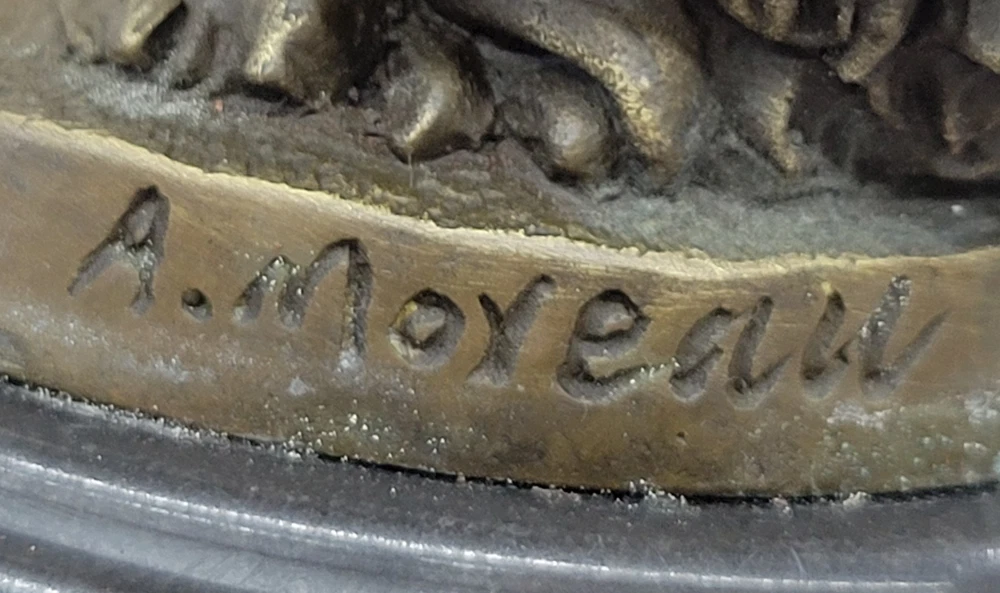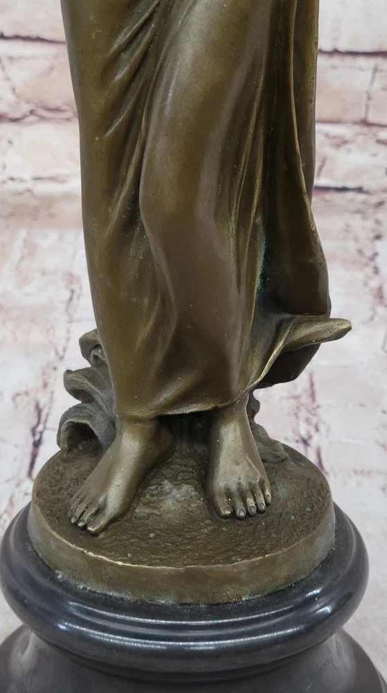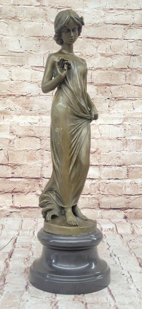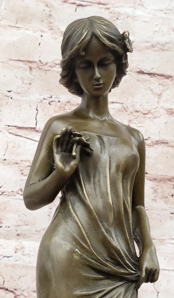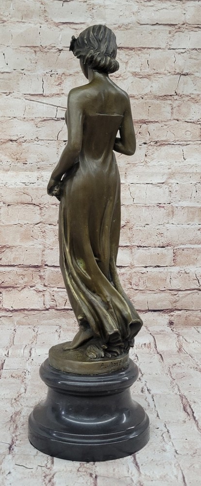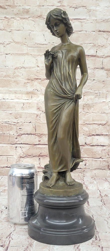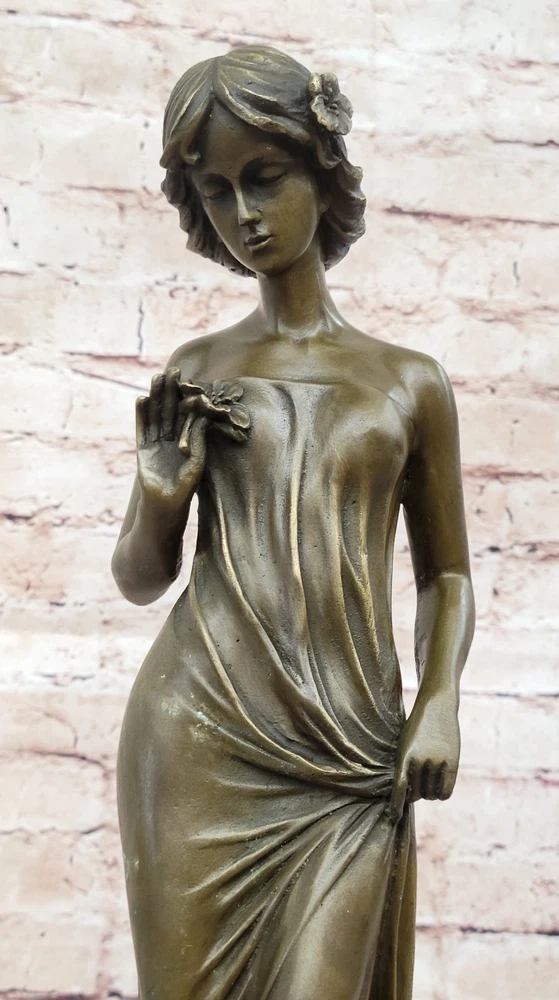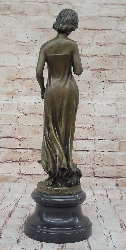 Vintage Victorian Maiden Garden Flowers Bronze Marble Statue Sculpture Art-Deco Vintage Victorian Maiden Garden Flowers Bronze Marble Statue Sculpture Art-Deco Condition : This sculpture is in perfect condition Bronze Dimensions with Marble Base: Height 18" X Width 5 1/2" Marble Dimensions: Diameter 5 1/2" Height without base:15" Weight:12 LBS Inventory:24Y1484842 A young lady stands in quiet contemplation as she gazes tenderly at a delicate flower held in her hand. The subtle expression on her face suggests the bloom may be a token from a secret admirer, evoking a sense of romantic mystery and gentle affection. Her gaze, soft and introspective, draws the viewer into the quiet moment she inhabits. She wears a long, flowing gown that hugs her figure gracefully, emphasizing the elegance of her form. With her other hand, she lightly gathers the fabric, lifting it just slightly to suggest movement and poise. The sculpture captures both innocence and allure, blending emotional depth with classical beauty in its composition. This exquisite bronze piece was handmade using the traditional lost wax casting method, ensuring exceptional detail and craftsmanship. A rich brown patina enhances the texture and depth of the form, while a solid black marble base provides contrast and stability. The piece is signed by the artist Moreau, marking it as a timeless work of art that reflects both charm and sophistication. Bronze Sculpture Young lady Gazes into a Flower by Moreau Art Nouveau Deco Decor Video will open in a new window Using the eBay App? Paste link into a browser window: [isdntekvideo] Shipping Terms : Most of our items are shipped via USPS (United States Postal Service) mail or UPS. Most orders are shipped within 24-48 hours of purchase. Please be aware that not all items are available for USPS shipping due to size and weight. We do ship to Hawaii, Alaska, Canada, Puerto Rico, APO/AE, and U.S. Virgin Islands, however, an additional charge may be required. Please contact us before making any purchases in these areas. For Non-USA customers, you may be responsible for all duty, tax, brokerage fees that may be due upon delivery (shipping costs cover freight charges only). We also ship internationally. Please refer to the "Shipping and Handling" chart for the rates for each area. Payment : We accept just about any form of payment. PayPal, Master Card, Visa or American Express credit cards. Money orders, cashiers checks, and even personal or business checks. For governmental institutions, we will also accept a purchase order. Please understand that for personal or business checks we have to wait for the check to clear (usually 7 days) before shipping. Condition : New Detailed Hand Crafted Hot Cast Bronze Satisfaction Guaranteed. This is Stock Photo, Slight Color Variation!! Listing and template services provided by inkFrog