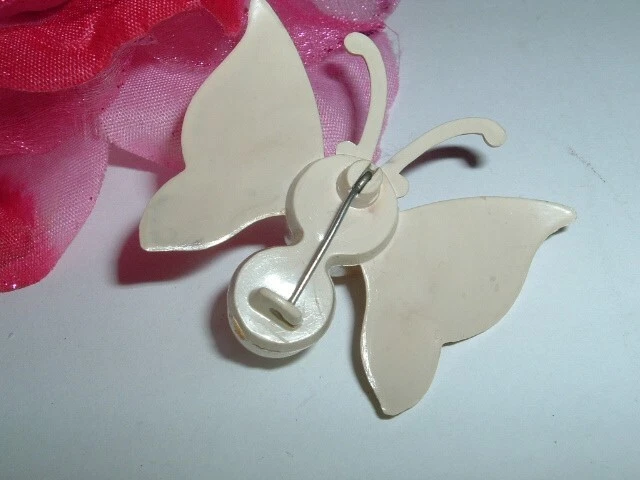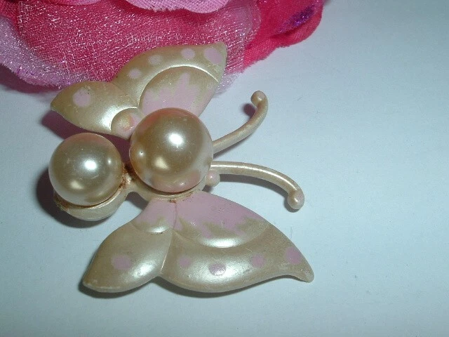 From a Chicago estate sale, a vintage celluloid butterfly pin of champagne colored pearls and pink enamel. Measures 2" wide, 1-1/2" tall with "c" clasp on back, Circa 1910. Condition is excellent, perfect for spring and we will mail in jeweler's gift box.