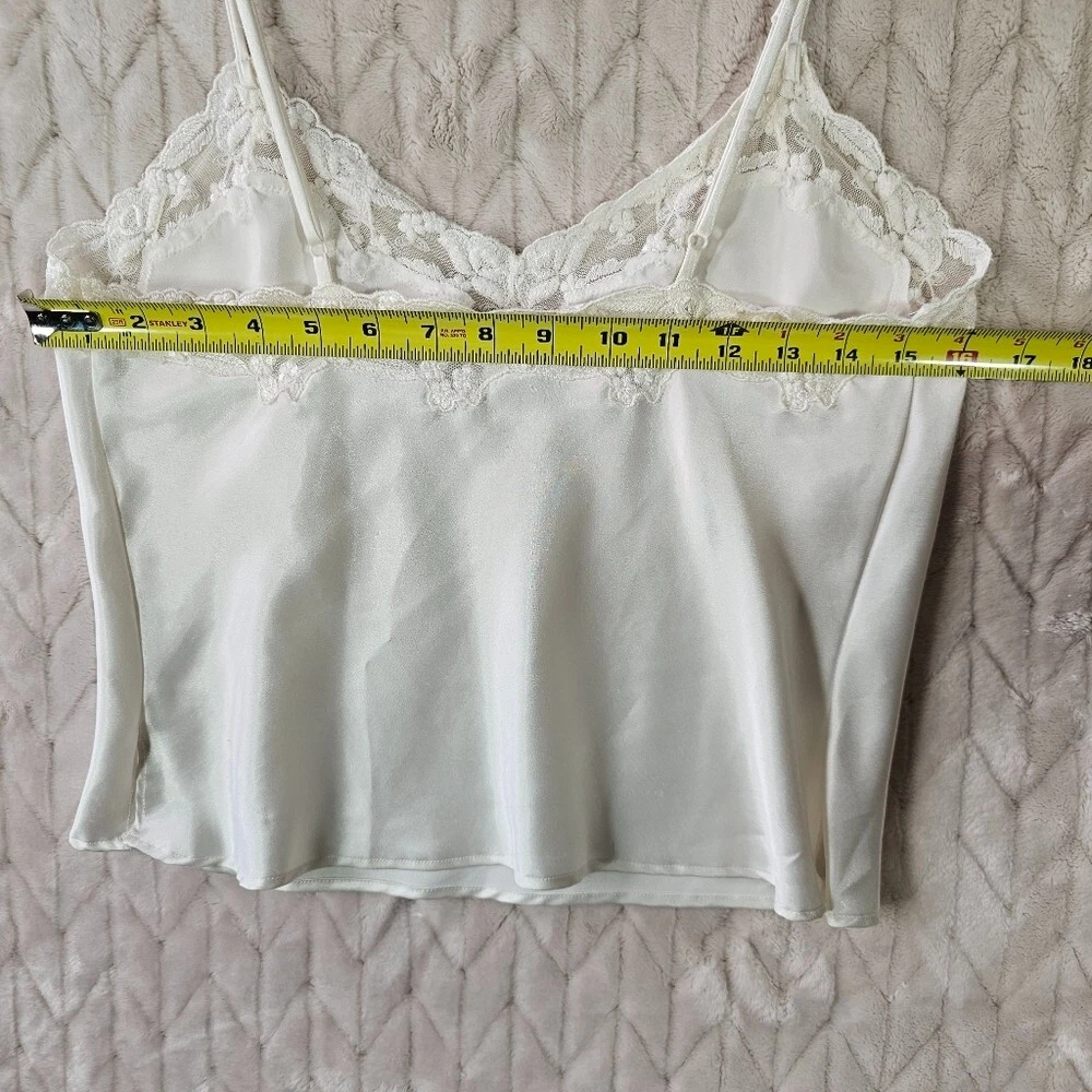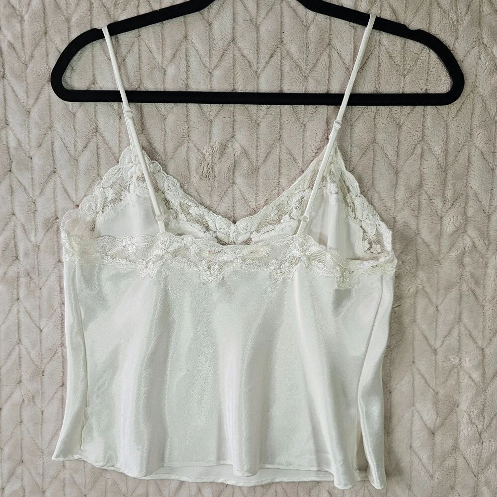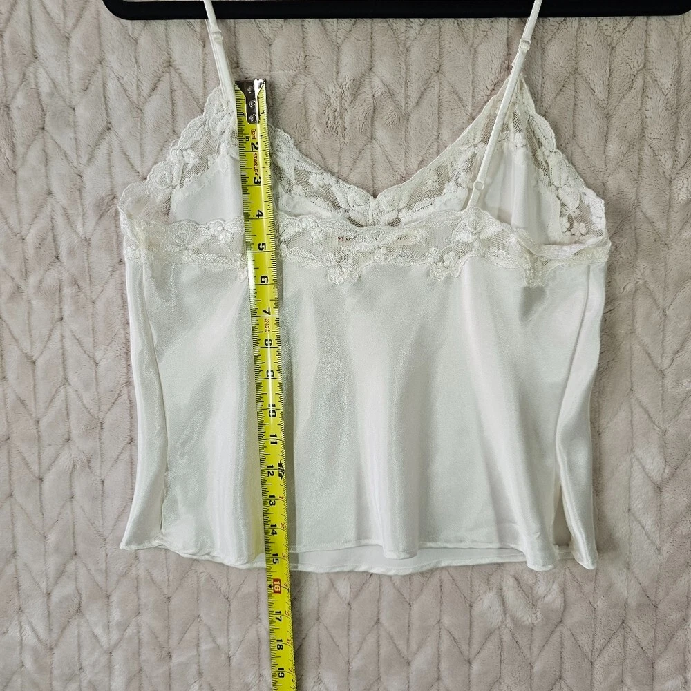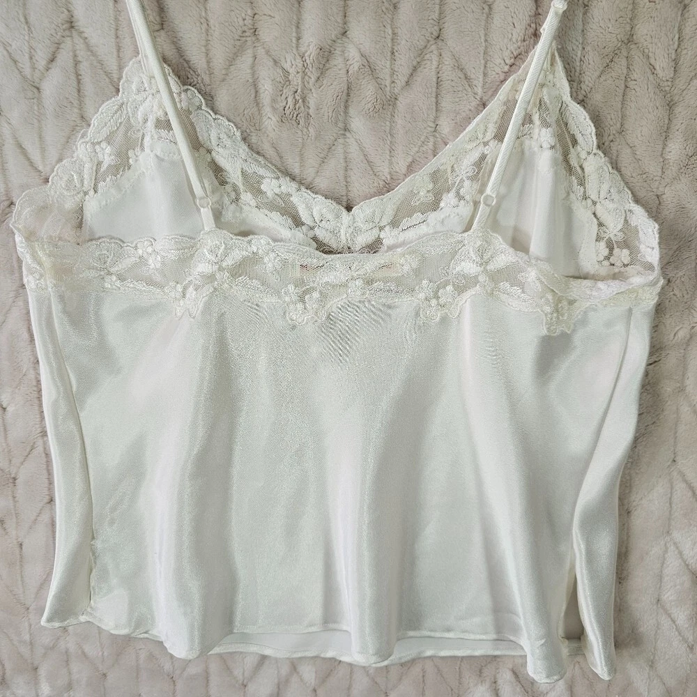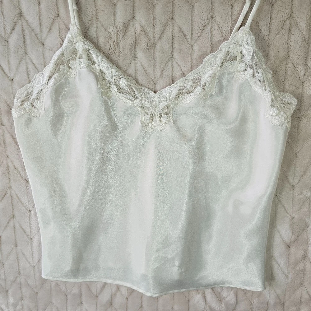 Beautiful liquid satin fabric slip tank cami. The size tag is missing but it measures about a size medium, compare with your own measurements to get the best fit! In excellent condition, has a small snag as shown in photos. See photos for full details.