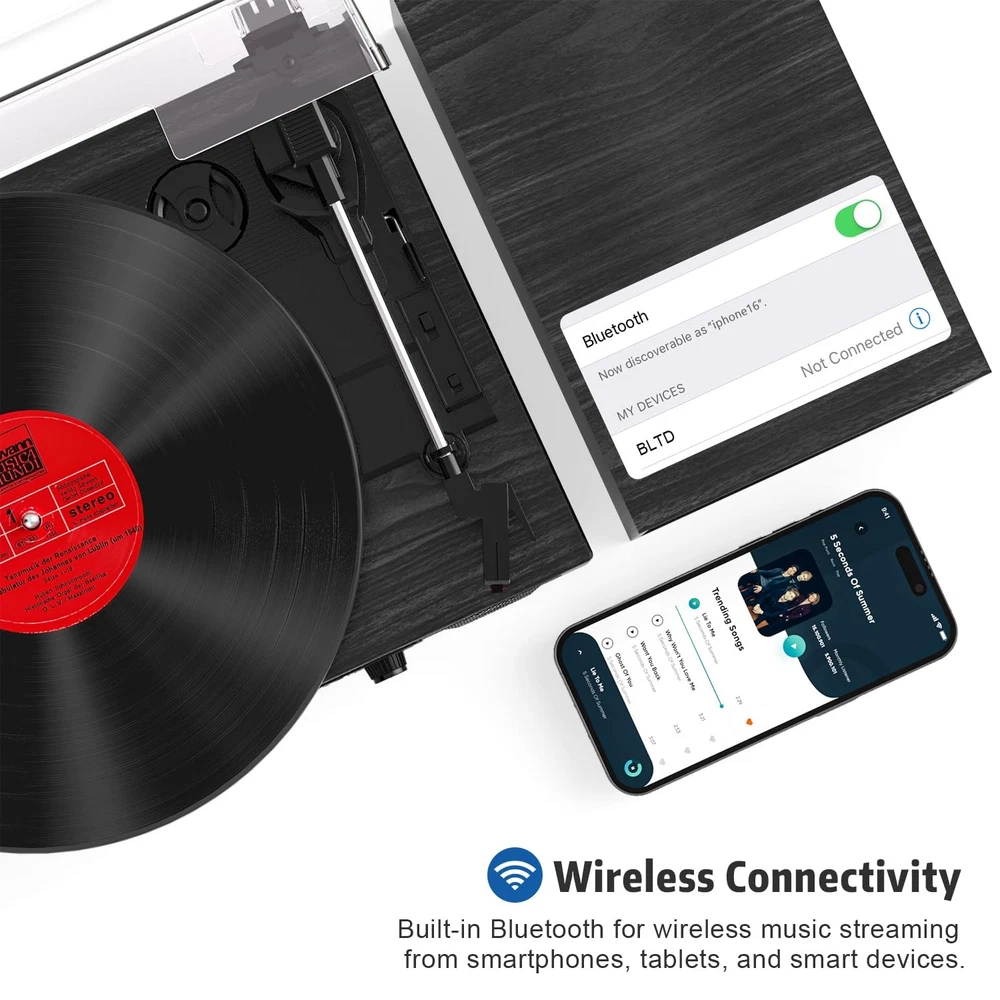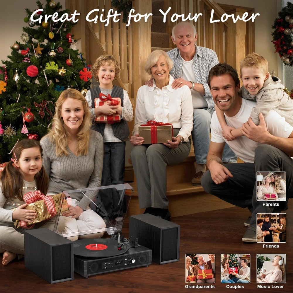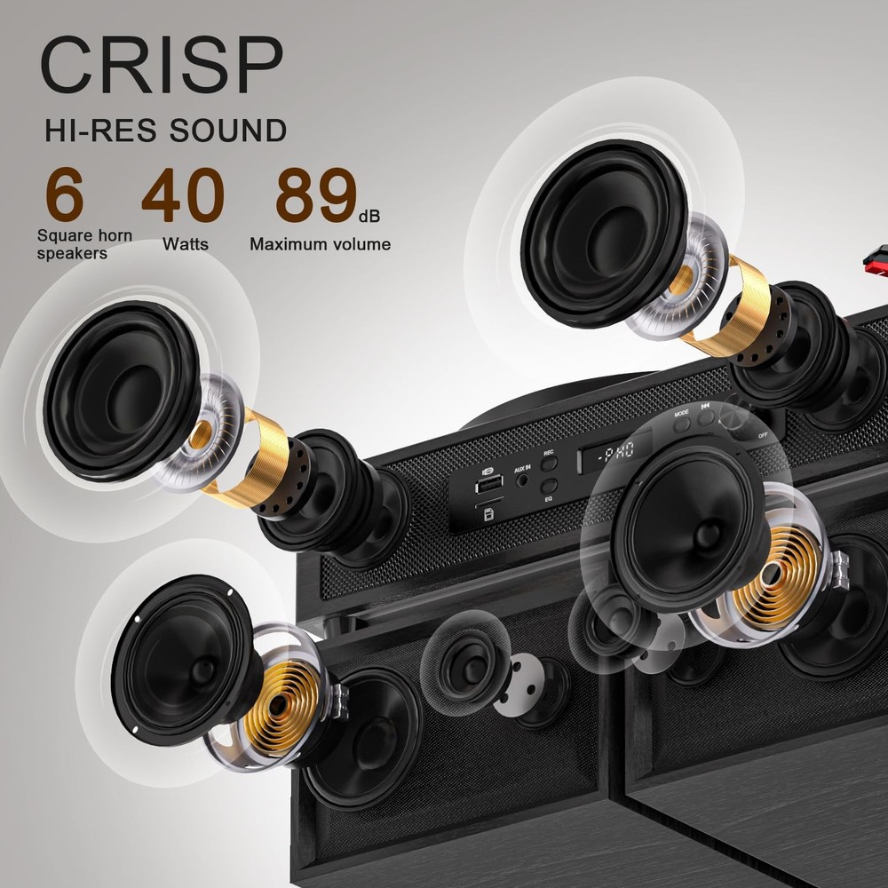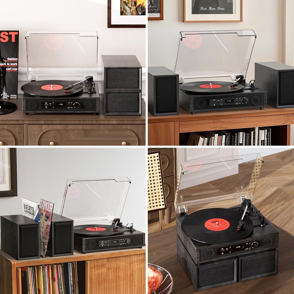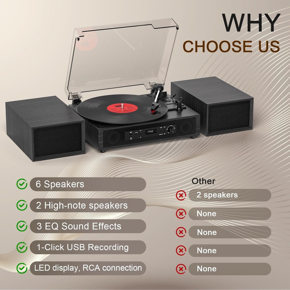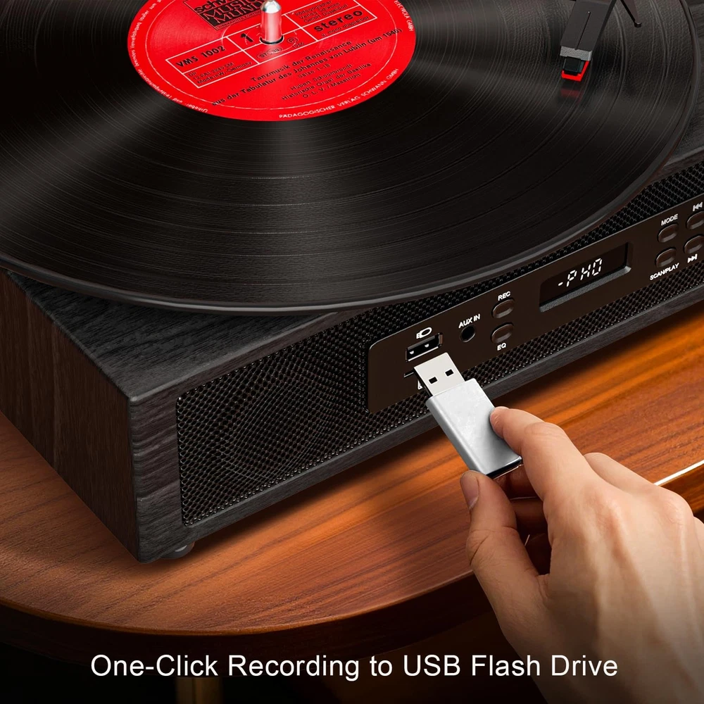 Turntable with Premium Sound & Modern Versatility Enhance your listening experience with this all-in-one turntable system that combines vintage charm with modern technology. Perfect for audiophiles and casual listeners alike, this turntable delivers rich, high-fidelity audio through its powerful built-in stereo speakers and enhanced external speakers (2 tweeters + 2 midwoofers) for crisp highs and deep, resonant lows. Key Features: ▁Multi-connectivity: Stream music wirelessly via Bluetooth 5.0, connect devices via AUX/USB/TF card, or enjoy classic vinyl. ▁USB recording: Digitize your vinyl collection effortlessly with one-touch USB recording (supports MP3 format). ▁Customizable sound: Short press 'EQ" to switch between different sound effects during audio playback. (Bluetooth/USB/TF mode only) ▁Extendable audio: Connect to external speakers or amplifiers via the RCA line-out for a complete home theater setup. ▁Retro style meets modern design: Sleek wood finish with intuitive controls-ideal for living rooms, studios, or gift-giving. 【4+2 Speakers & HiFi Sound】】The 4+2 speaker Hi-Fi system is a vintage record player that features built-in and external speakers, which combine to form a full-range stereo system. This system accurately reproduces the warmth of vinyl records by presenting transparent high frequencies and full-bodied low and medium frequencies. The external speakers can be connected to the turntable quickly and easily via the plug-and-play design, allowing for flexible placement to suit different acoustic environments. 【Digital USB Recording & LED Display 】Equipped with both a high-definition LED display and USB recording function. The LED screen provides real-time display of the playback status, ensures straightforward operation. This record player allows you to play digital music files (MP3/WAV) via a USB port, or record vinyl tracks as high-fidelity audio files to a USB drive. This enables effortless digitisation and sharing of classic records. 【Anti-Resonance Suspension Design】Featuring a belt-driven mechanism with a spring-suspended platter, minimises motor vibration and external noise for clear, distortion-free audio. The auto-stop function is a safety feature that stops the turntable at the end of a record, thereby protecting the stylus and vinyl from wear. 【Vintage Design, Modern Durability】 Handcrafted walnut finish and retro dials enhance your décor, while anti-resonance MDF construction ensures skip-free playback during lively gatherings. 【Bluetooth & Three Speed】 Spin 7", 10", and 12" records at 33/45/78 RPM. Equipped with a built-in Bluetooth receiver, enabling wireless streaming of music and podcasts from your smartphone. The 3-speed selection (33/45/78 RPM) precisely matches 7", 10" and 12" vinyl records for authentic playback. 【Plug-&-Play for All Vinyl Lovers】Wth its Bluetooth-to-Vinyl transitions, and for archiving collections without a laptop. It also allows for upgrading the sound later with RCA outputs. This product is perfect for dorm rooms, lofts, or one's den.