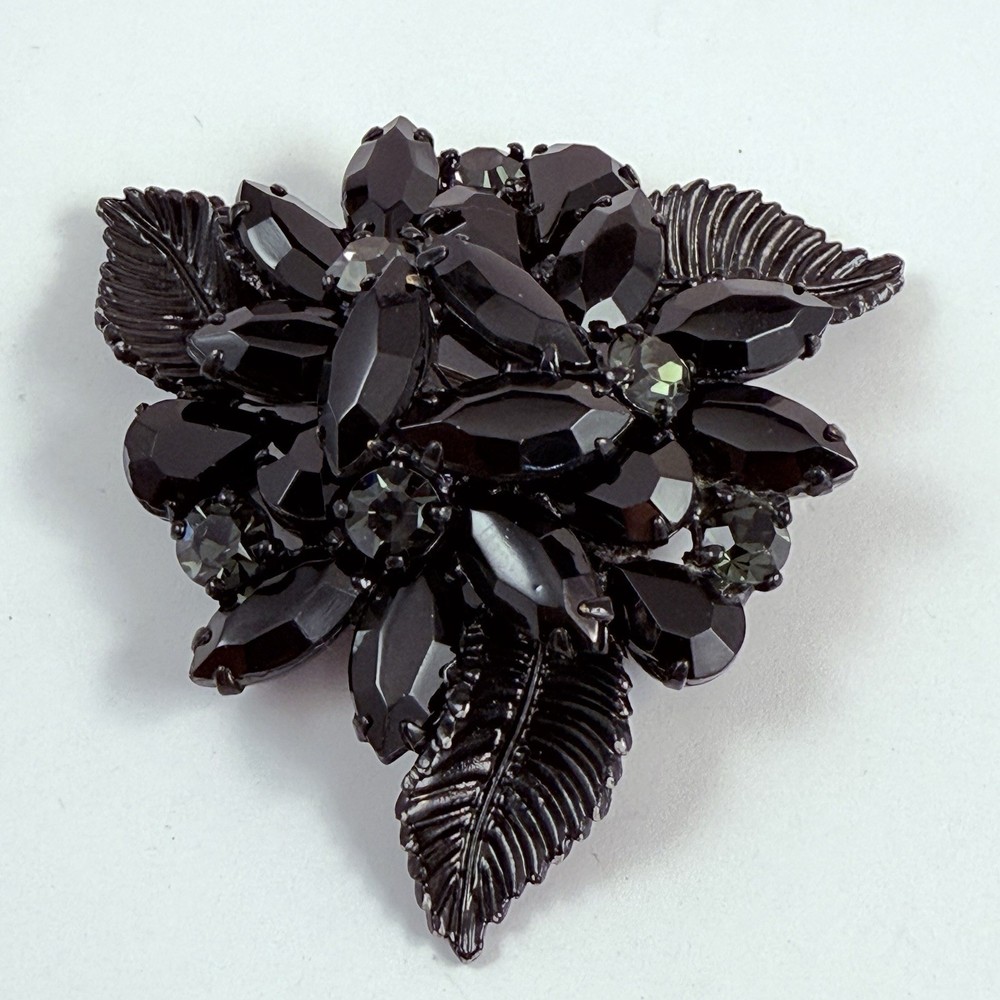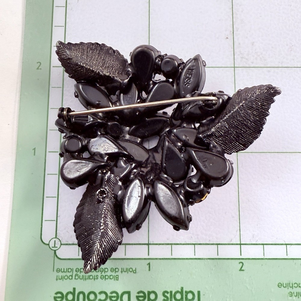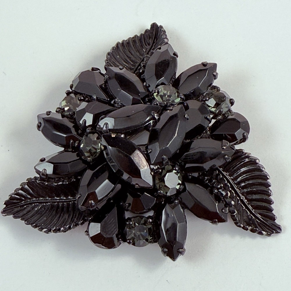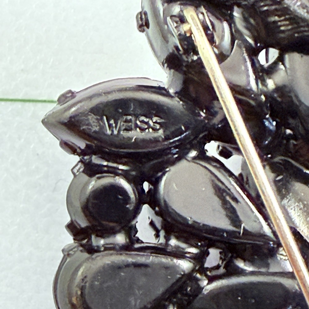 Vintage WEISS Signed Smokey Grey & Black Rhinestone Flower Mourning Brooch. Pre-Owned Estate Jewelry in Very Good Condition. Ready to wear, give as gift or add to a collection. Our Vintage items are mostly from estate sales and vary in age from 100+ years old to more modern pieces. Please use your judgement. Items are photographed on a measuring matte with one-inch squares to give you an idea of size. Any photography props / holders you see are not included.