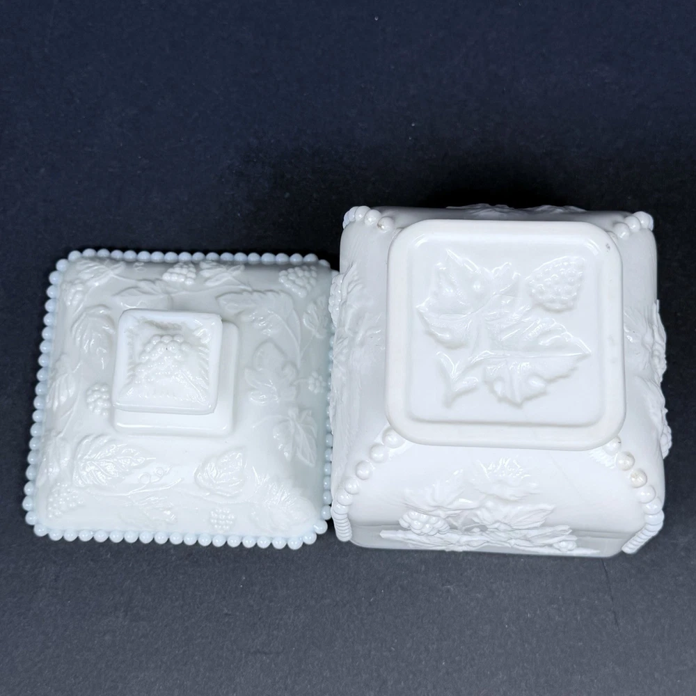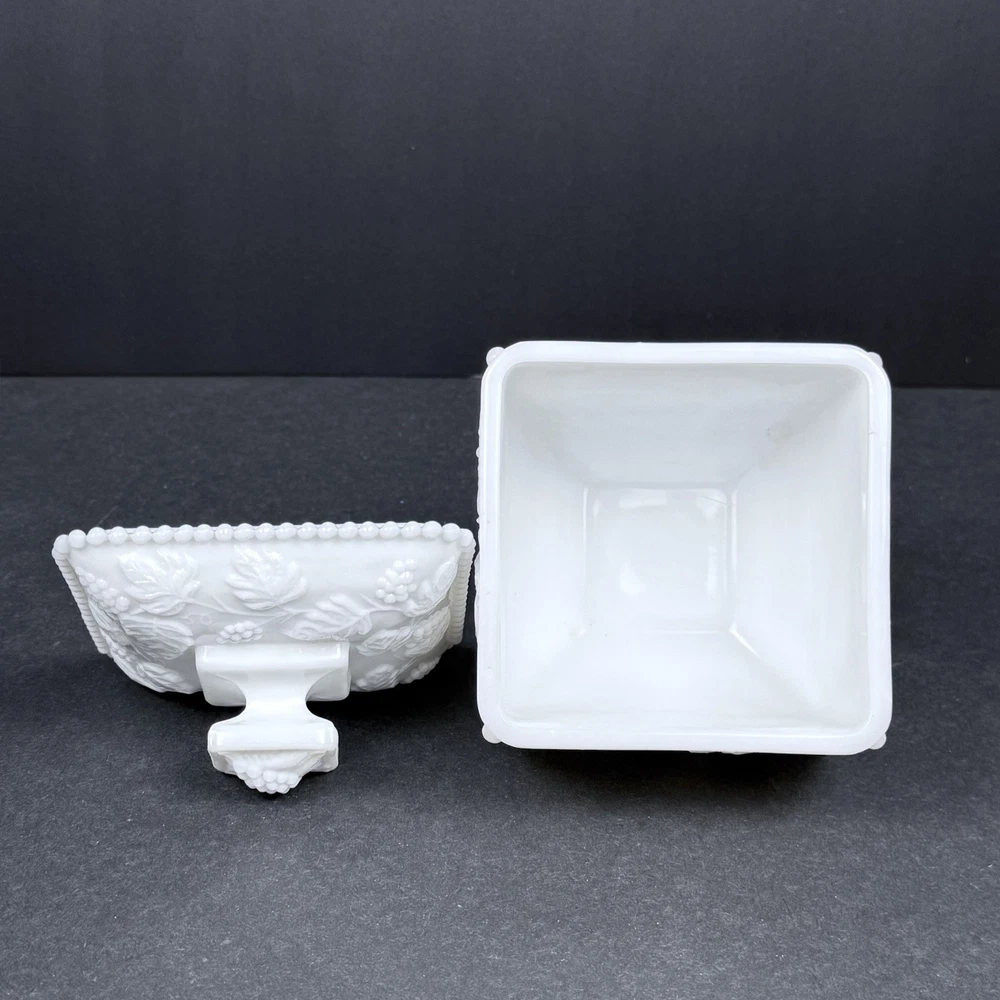 Pattern: Beaded Grape, featuring raised relief grapevine and leaf design Shape: Square with a beaded edge and a lid topped with a grape cluster finial Size: Approximately 5.25 inches tall with the lid on and 3.75 inches square Perfect for candy and a sweet decor down wedding and baby showers and just everyday decor. No chips or cracks. Let me know what questions you have! Blessings to you.. π€π€π€π€π€π€ππ€π€π€