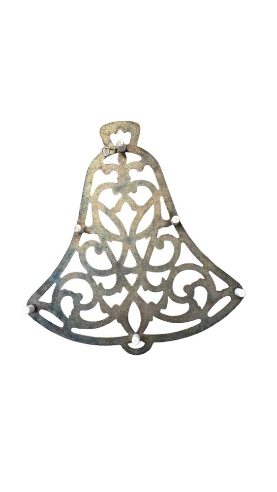 This vintage silver-plated bell trivet from WM A Rogers is a beautiful addition to any Christmas decor. The intricate pattern on the trivet is sure to catch the eye of anyone who sees it. Made of high-quality silverplate, this trivet is a durable and long-lasting piece. It's perfect for holding small trinkets or serving as a decorative piece on a shelf. Add this unique and charming piece to your collection today.