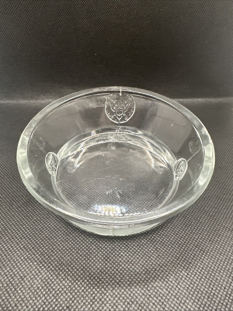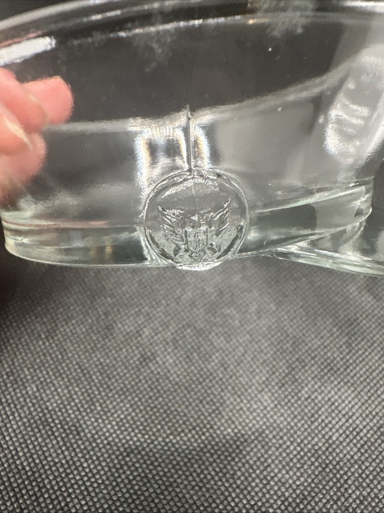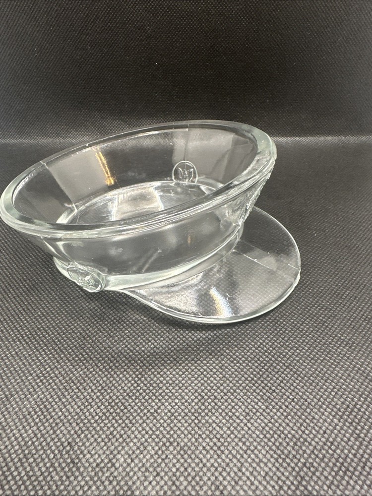 The vintage clear glass U.S. military hat cap cover bowl ashtray is a unique and historically themed collectible item. Its design replicates the shape of a military hat, complete with a cover and bowl for holding ashtray contents. The ashtray showcases a militaria theme, making it a distinctive and eye-catching piece for any collector or enthusiast of military memorabilia. Made of clear glass, this modified item is both functional and decorative, perfect for adding a touch of history to any space.
