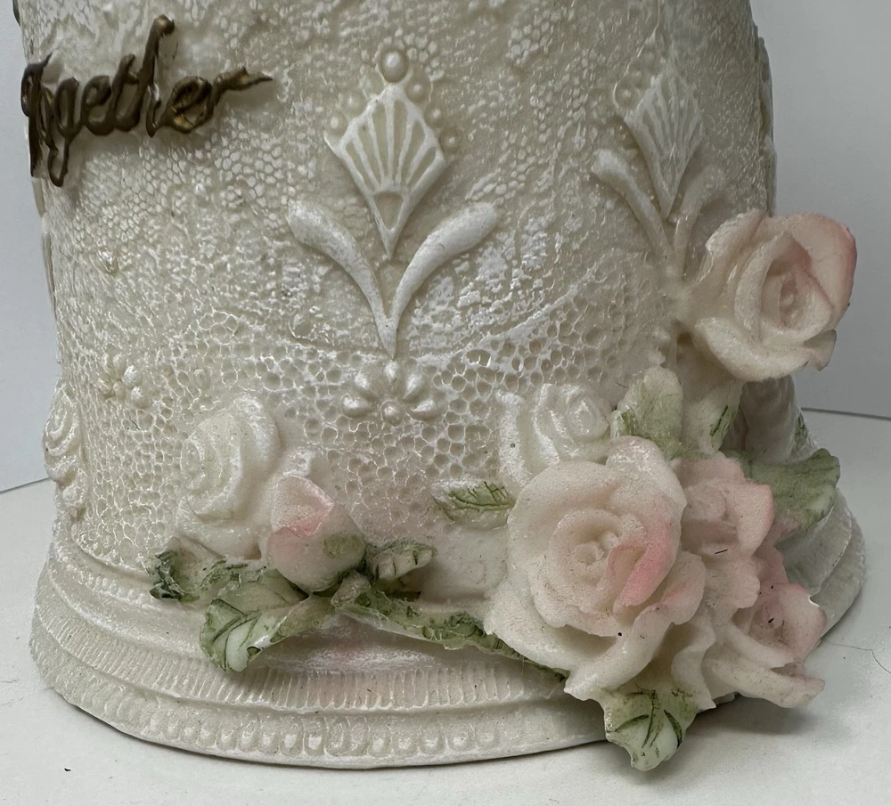 Embellish your wedding décor with a touch of timeless beauty from the Vintage Wedding Elegance Collection. This exquisite cake topper/ décor piece features a stunning arrangement of white dome with pink roses and white doves, meticulously crafted from resin to capture the essence of Roman style. The subtle interplay of pink and white hues creates an enchanting ambiance that will elevate the aesthetic of your special day. Crafted with care, this original MRH piece, dating back to the 1970’s, stands as a testament to the artistry of its era. Whether it's adorning your cake or serving as a decorative element, this piece is sure to leave a lasting impression. Estate sale, item is in excellent pre owned condition with no chips or cracks.