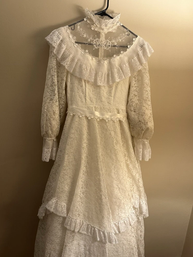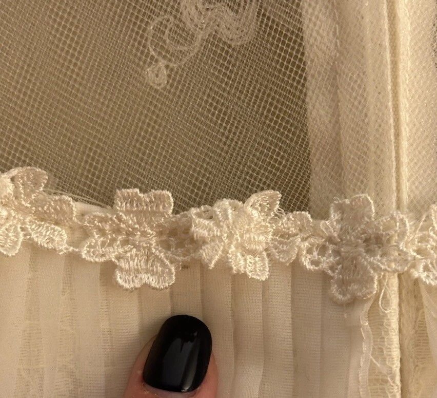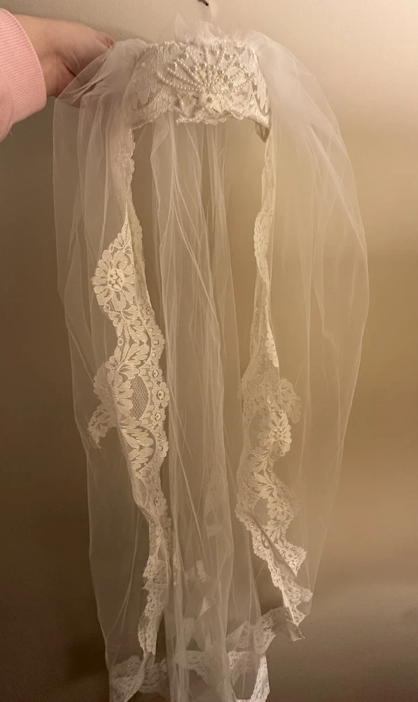 Beautiful vintage wedding gown and veil. Excellent condition! The hem of the lining is a little dirty as shown in photos. there is a very small black mark on the back near the zipper. Will be shipped in a box with care! There is no brand or tags on this dress. It is probably close to a size 0. See measurements below and reach out with any questions before purchase! Shoulder to shoulder: 14.5” Waist: 12” Neckline to hem: 56” Waist to hem: 41” Waist to hem of train (train length): 67.5” Veil length: 48.5” Arm length: 23”