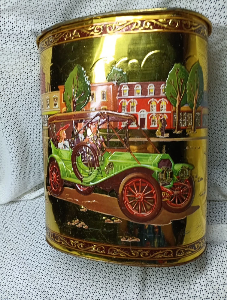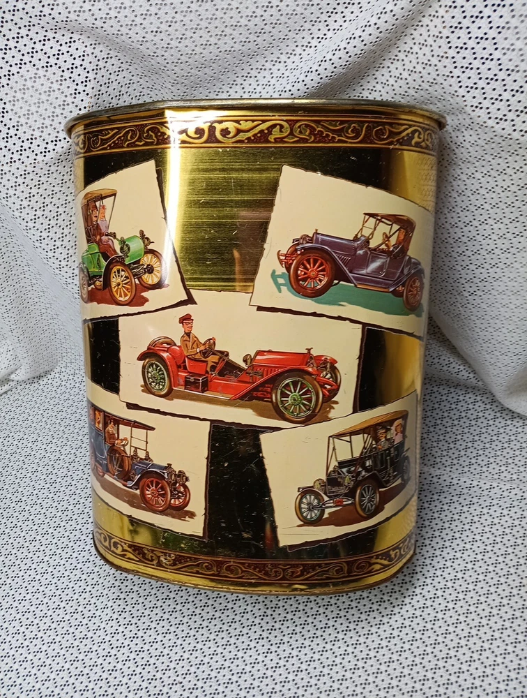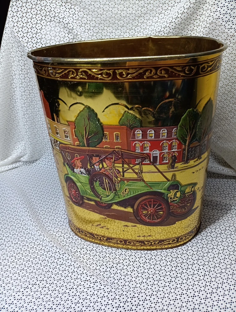 Vintage Weibro Metal Trash Can with Old Jalopy / Antique Car Images