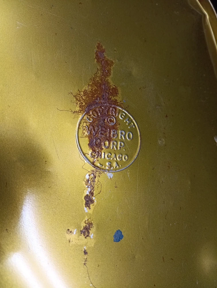 Vintage Weibro Metal Trash Can with Old Jalopy / Antique Car Images. Approx 13" X 10,5" X 7". Some minor surface rust in bottom of can, A few dings and dents, nothing major. See Pictures. Nice Bright color. Has been properly cleaned.