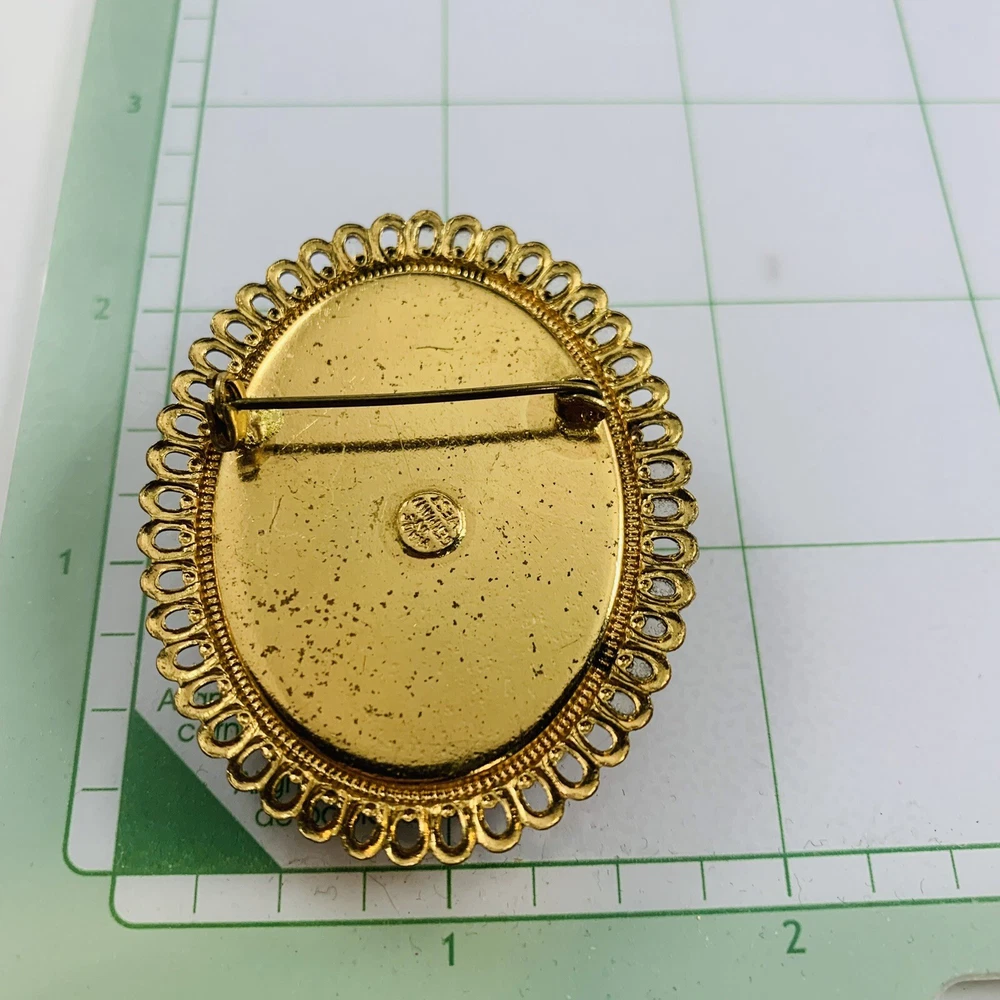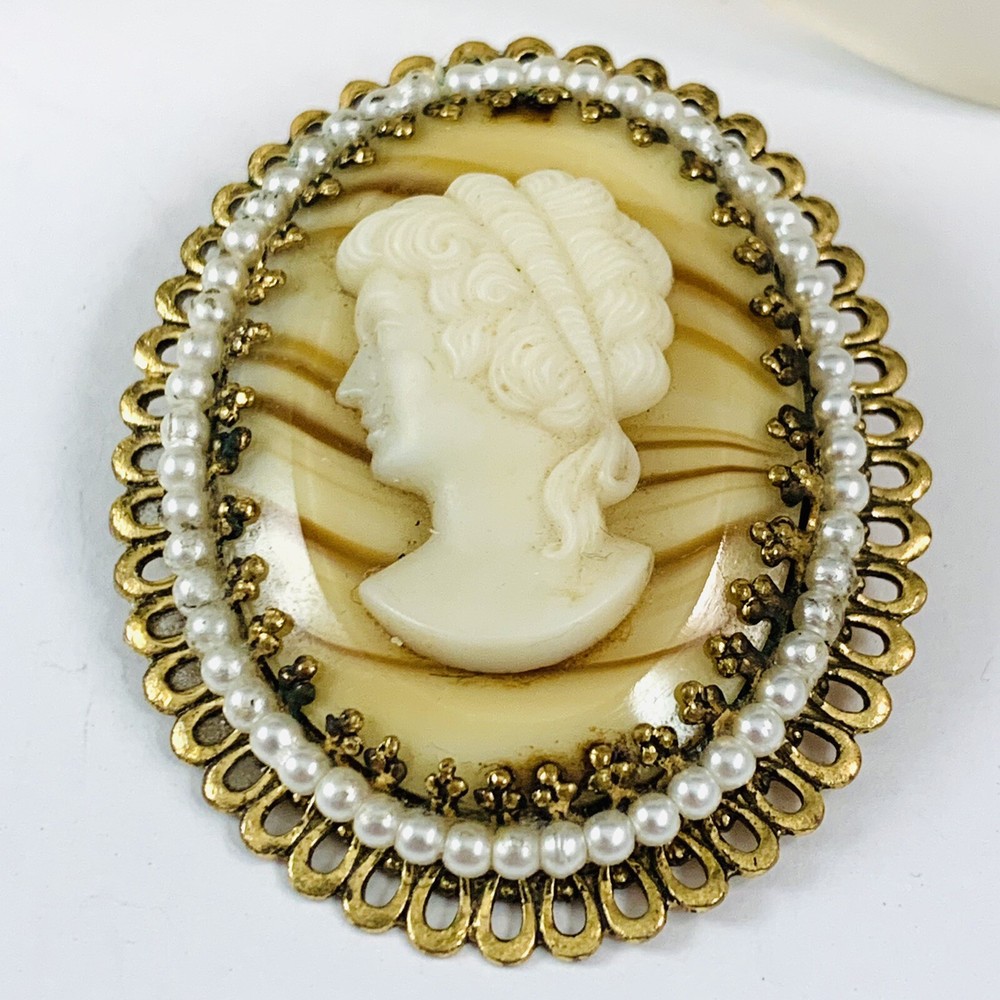 Vintage West Germany Glass Cameo Faux Pearl Gold Tone Brooch. Piece does show some finish wear on the back. Pre-Owned Vintage Estate Jewelry. Ready to wear, give as gift or add to a collection. Our Vintage items are mostly from estate sales and vary in age from 100+ years old to more modern pieces. Please use your judgement. Items are photographed on a measuring matte with one-inch squares to give you an idea of size. Any photography props / holders you see are not included.