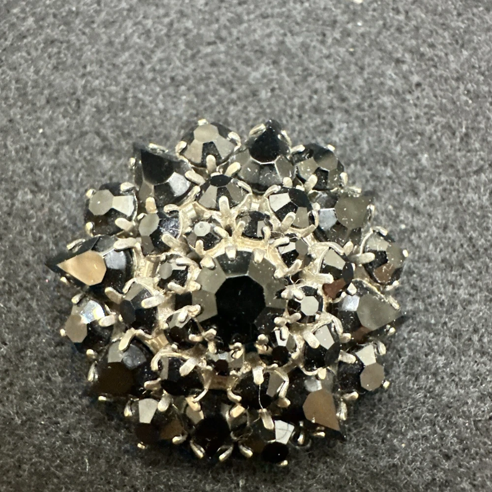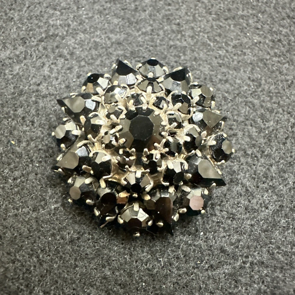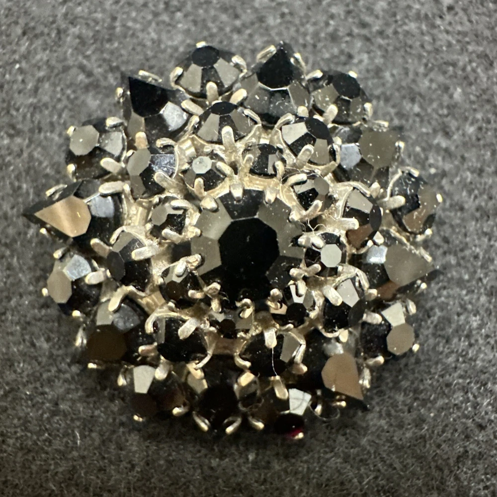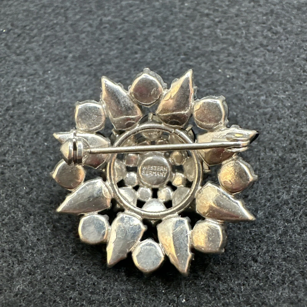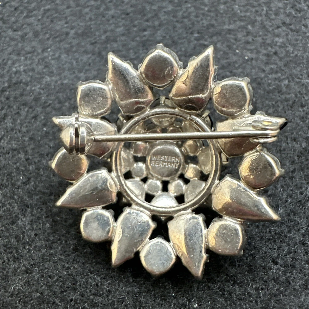 This vintage brooch from West Germany is a timeless piece of fashion jewelry. The silver tone and black onyx gemstone make it perfect for any occasion. The brooch is signed and plated with rhodium, making it an original and authentic piece. The round shape and retro design of this brooch make it a unique addition to any collection. It is 1.25 inches in length and can be worn by both men and women. This brooch is a great vintage find and is sure to impress.