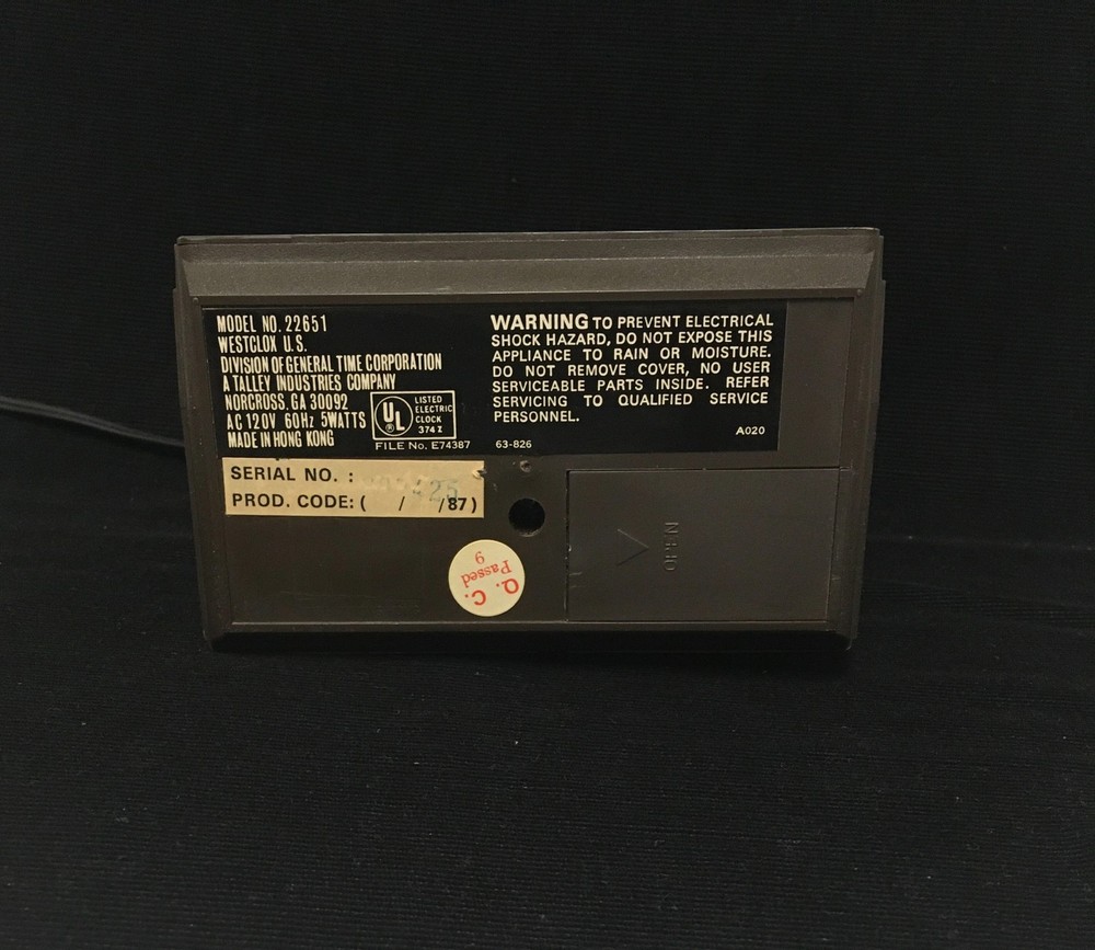 : : : : : : : : : : : : : : : : Vintage Westclox Digital Alarm Clock Model 22651 1987 TESTED A-OK Unique "Drowse" Button (before 'snooze' became popular) Has battery back-up Measures 5.25" x 3" x 2" Ask for any other details or photos Offered for sale as in photos and described : : : : : : : : : : : : : : : :