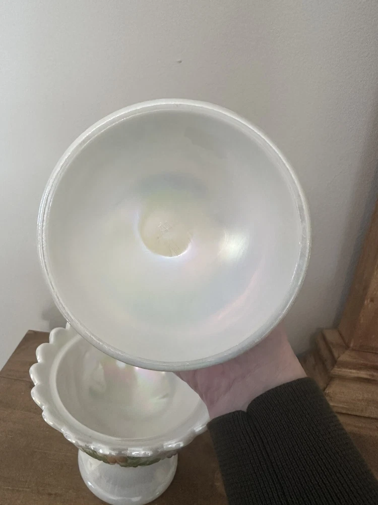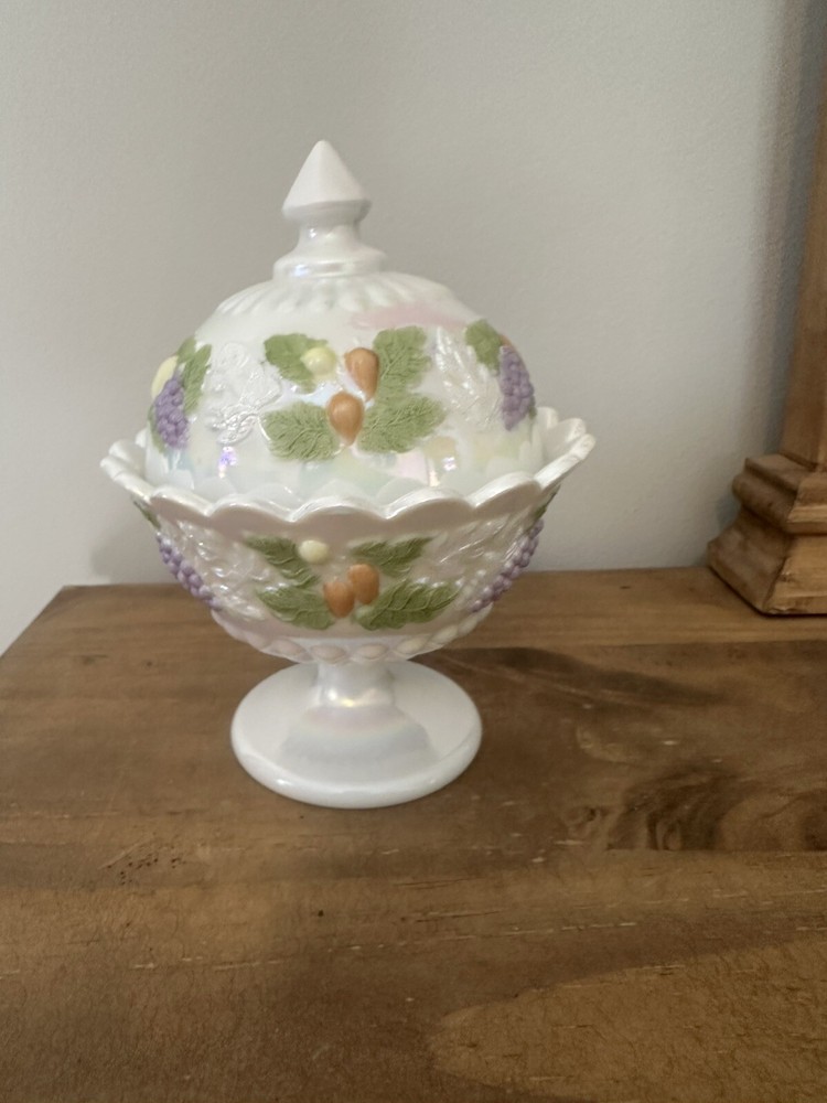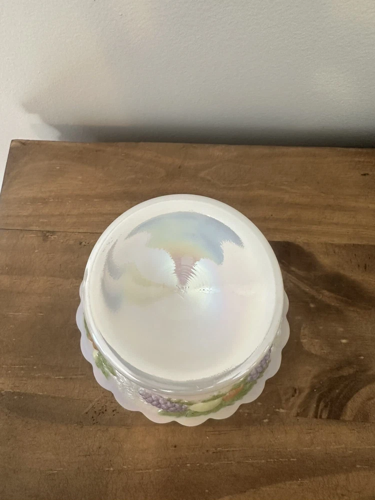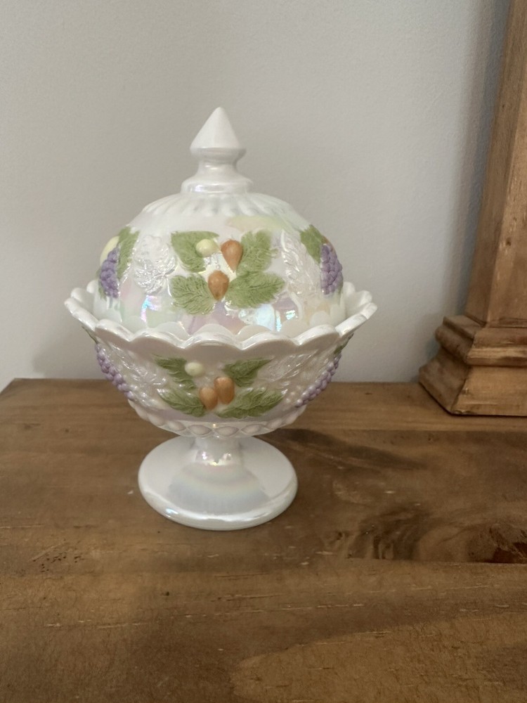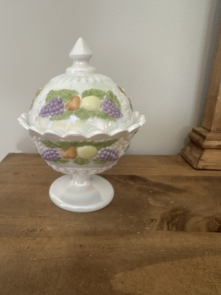This is a beautiful Westmoreland Iridescent Pedestal Glass Candy Dish with Lid that has been hand painted with a fruit design. The dish is made of high-quality glass and features a white color that accentuates the intricate details of the hand-painted artwork. This collectible item is an original and was made in the United States using ceramic and porcelain materials. It is perfect for display and can be used to hold small candies or treats. No chips or cracks. 7”T with lid
