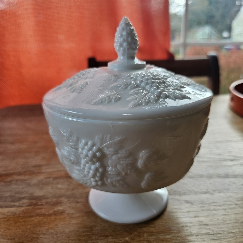 Vintage Westmoreland Milk Glass Grapes Candy Dish Milk Glass Compote Dish with Lid. Shorter Pedestal. Rounded. Grapes design. Beautiful for decor or a collection. No Chips. One small crack, not breaking through though. A couple tiny black marks. Excellent Condition.