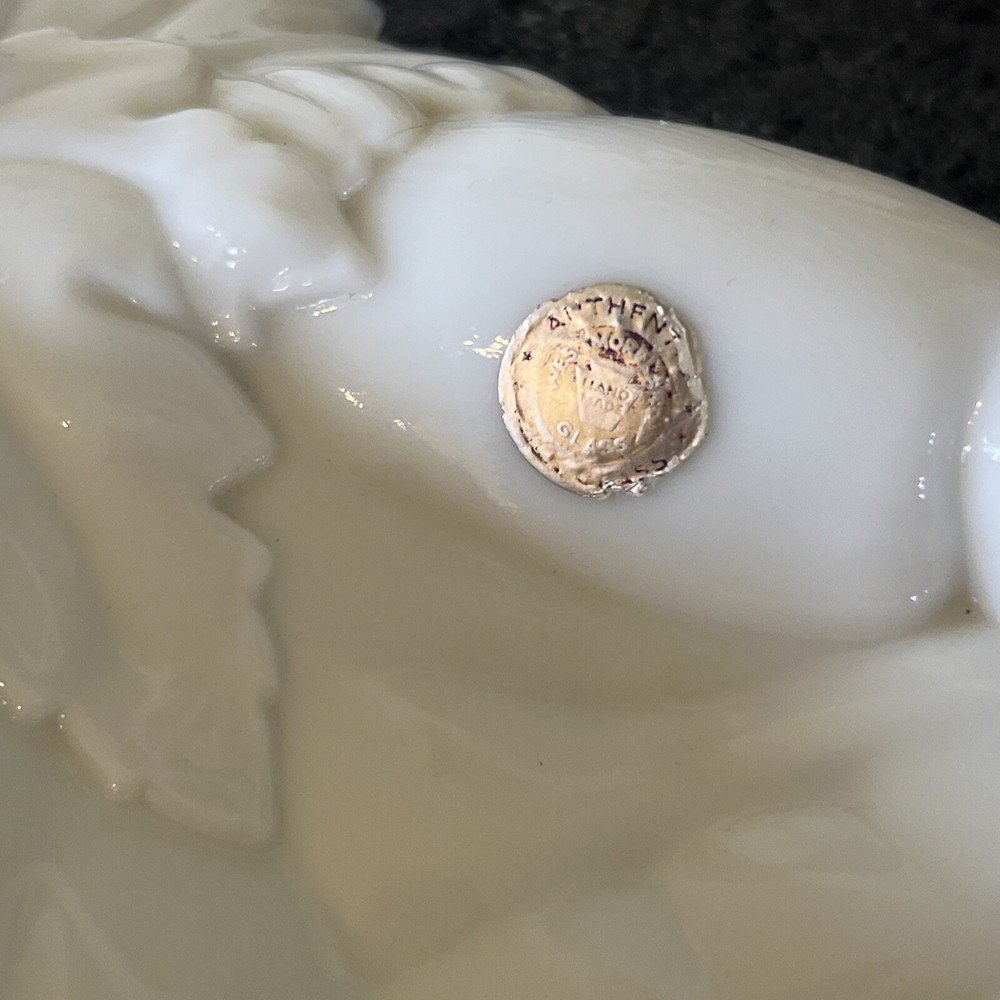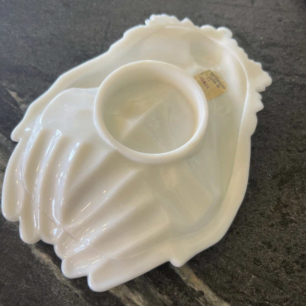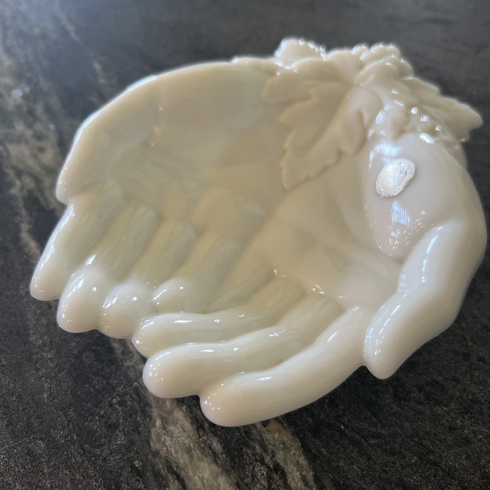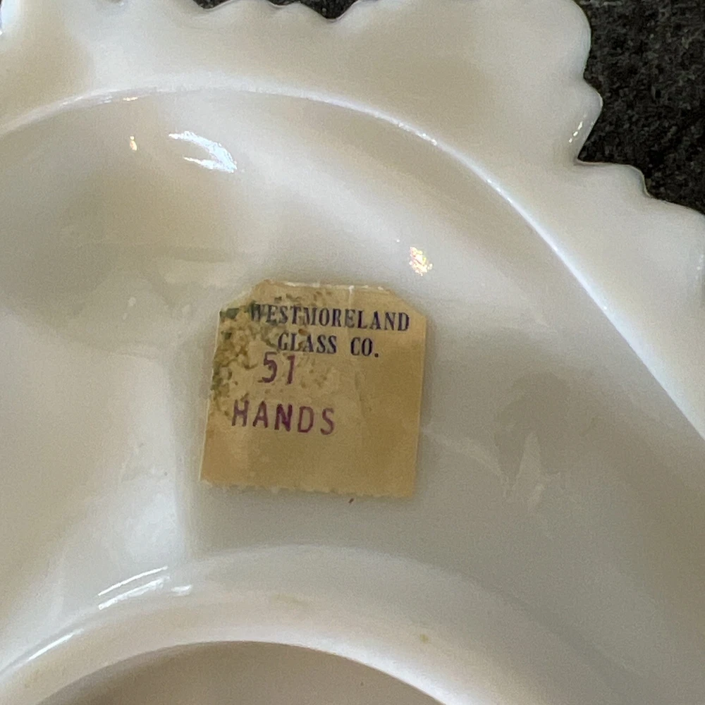 This vintage milk glass dish is a unique addition to any collection. With a figural design of open hands, it can be used as a soap dish, trinket holder, or jewelry dish. The white glass is accented by an impressed backstamp and was produced in the USA by Westmoreland. The candy dish is perfect for display or everyday use and would make a great gift for any collector. Excellent preowned condition. Actually still has the original West Moreland price tag on the underside.