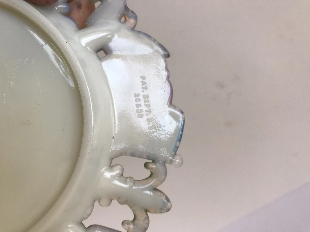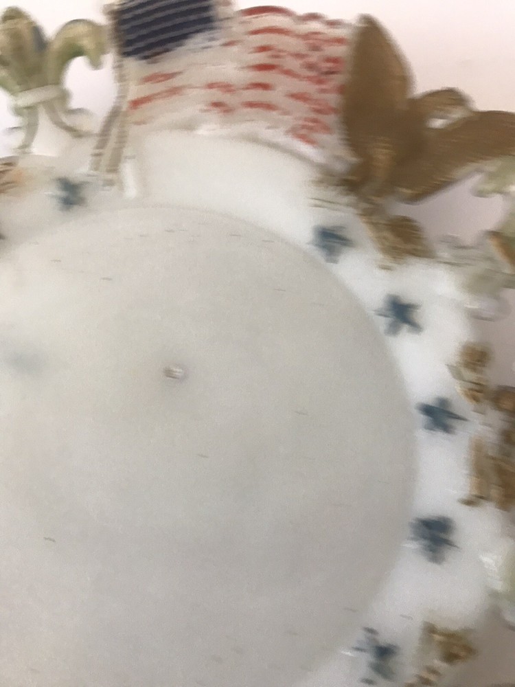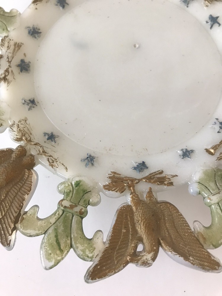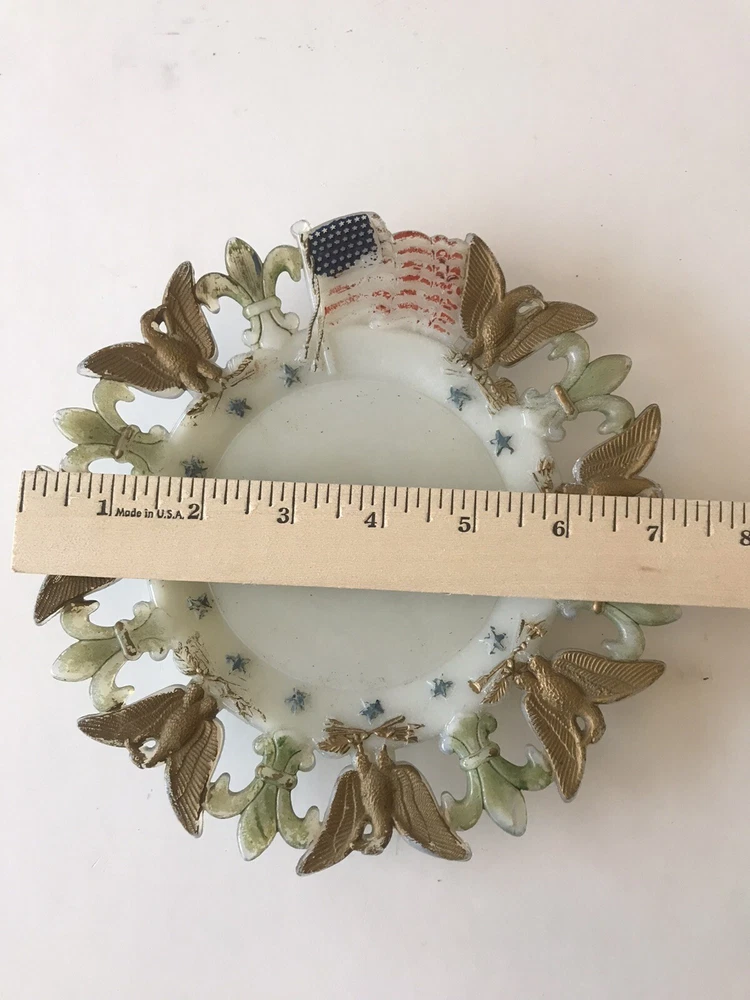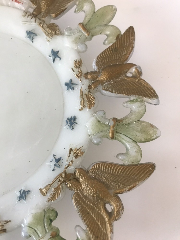 Delve into the rich history of American decor with this exquisite Westmoreland Milk Glass Collector Plate, featuring a vibrant display of the American flag, eagles, and fleur-de-lis design. Crafted in 1903, this piece embodies the patriotic spirit and ornate style of the Edwardian era, making it a timeless treasure for any collection. Measuring at 7.25 inches in diameter, the plate's round shape and multicolor palette are complemented by the high-quality glass material, ensuring both durability and aesthetic appeal. Proudly manufactured in the United States, this decorative plate is a testament to the intricate artistry and cultural heritage of early 20th-century America.