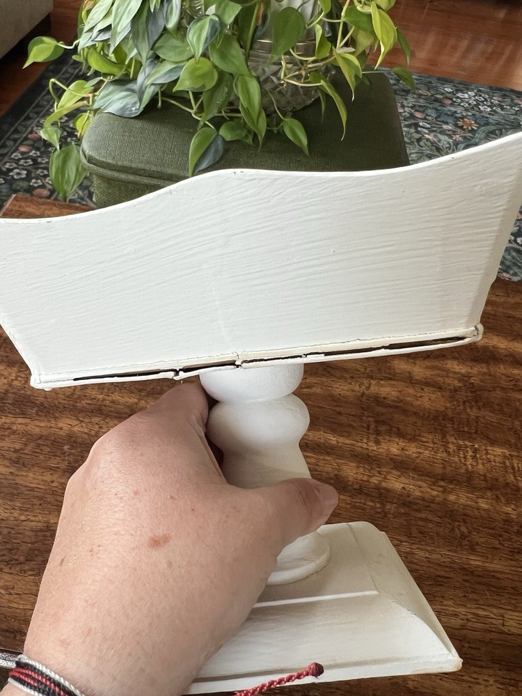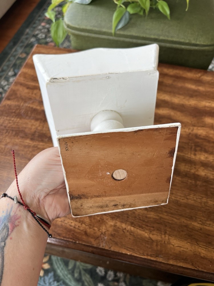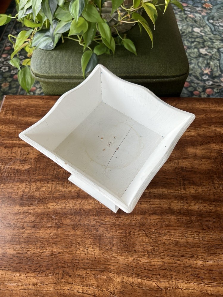 For sale is a charming vintage white wooden pedestal bowl, a versatile and elegant piece perfect for home decor or display. This square-shaped bowl features a scalloped edge and a sturdy pedestal base, painted in a classic white finish that adds a timeless touch to any setting. Ideal for holding fruit, decorative items, or as a centerpiece, this piece showcases a rustic yet refined style. Marked “Japan” on the underside, it reflects quality craftsmanship from its era. • Condition: Pre-owned, in good vintage condition with minor wear, including light scratches and slight paint chipping on the edges and base. No major cracks or damage. • Dimensions: Approximately 7 inches tall x 7 inches wide (exact measurements may vary slightly). • Material: Wood. • Style: Vintage, rustic, pedestal bowl. • Origin: Made in Japan. • Note: For decorative use only; not intended for food storage or heavy items. Perfect For: • Collectors of vintage wooden decor. • Home stylists seeking unique centerpiece pieces. • Adding a rustic elegance to shelves or tables.
