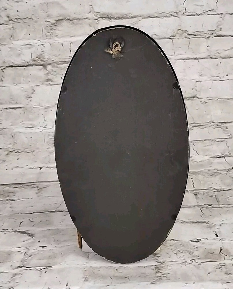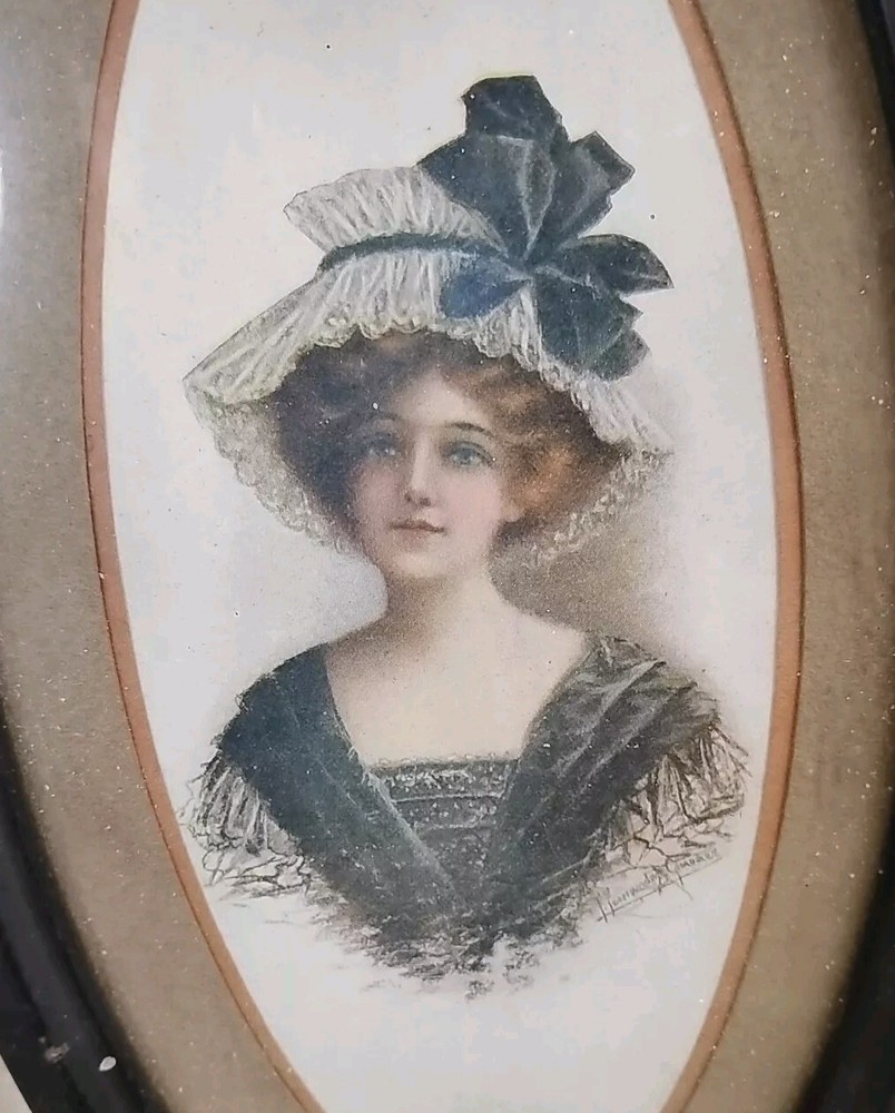 This vintage art print titled "Cupid Awake" features an angelic woman in a gown with a lace hat, depicted in a portrait orientation. The print is framed in a brown oval frame and measures approximately 10.5x5.5 inches. The lithography was produced in 1897 and is a licensed reprint. The print is made of paper and is a small size, perfect for a single piece sale. The item length is 10 inches, the item height is 12 inches, and the item width is 5 inches. The print is not handmade and does not come with a certificate of authenticity. The theme of the print is woman and the production technique is lithography. It was produced in the time period of 1850-1899.