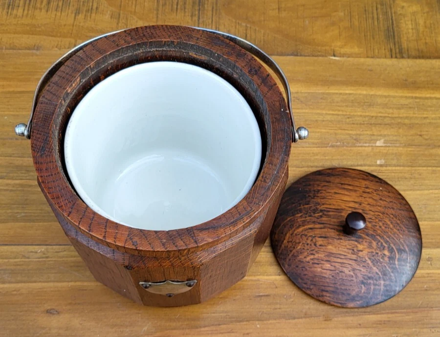 Vintage Wooden Biscuit Barrel with Ceramic Liner Retro Kitchen Storage