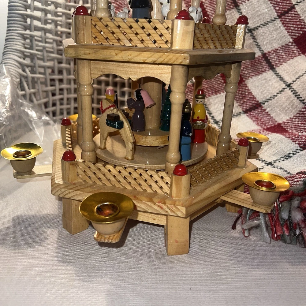 This vintage wooden Christmas nativity windmill carousel is a charming addition to any room. Its multicolor design and traditional style make it a perfect piece for the holiday season. The carousel features a revolving and rotating windmill that adds a unique touch to the overall design. Crafted from high-quality wood, this medium-sized carousel is a great collectible for adults and a perfect addition to any Christmas around the world collection. Whether you're looking for a decoration to go with your Christmas tree or a unique gift for a loved one, this vintage styled wooden Christmas nativity windmill carousel is sure to bring joy to any room. Box is in bad condition. Windmill has very little cosmetic damage, if any. Please see photos for details