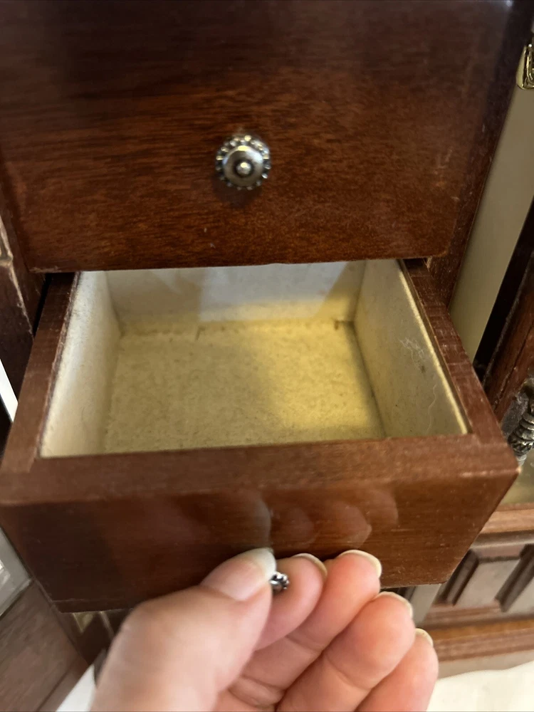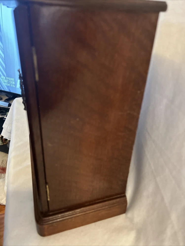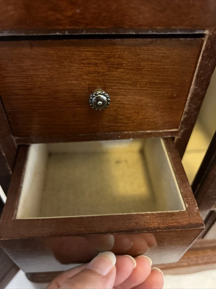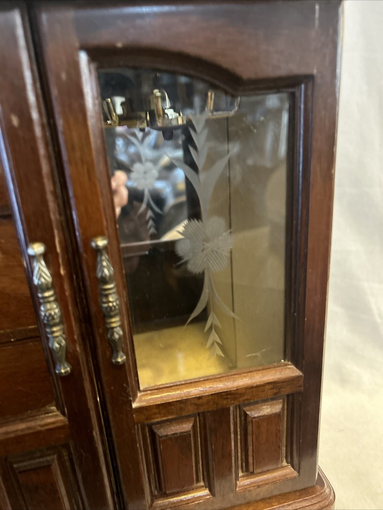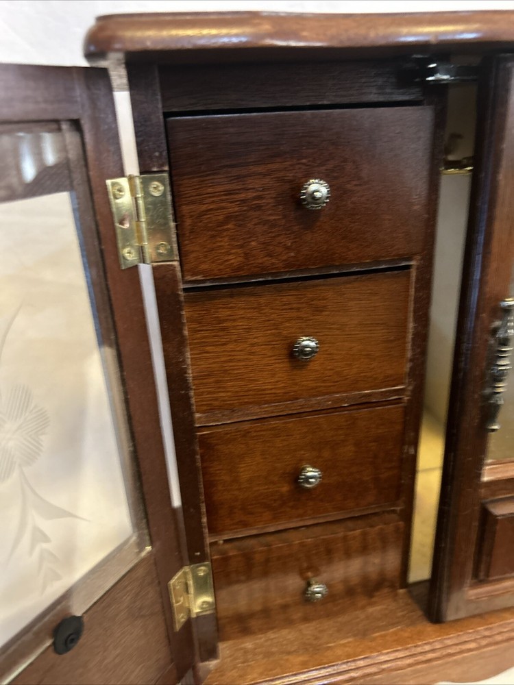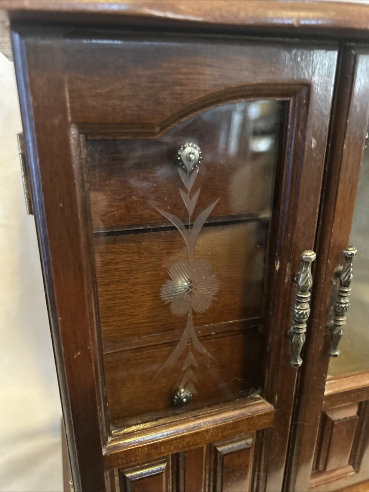 Vintage wooden musical jewelry box. The glass doors have edged flowers on the glass and the music is in working condition. See pictures for description and condition of this vintage wooden jewelry box. No cracks on the wood and has some nicks and scratches as seen on the pictures. Please review pictures for description, condition, and size.