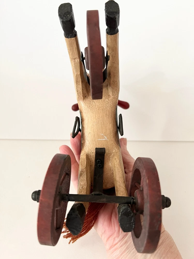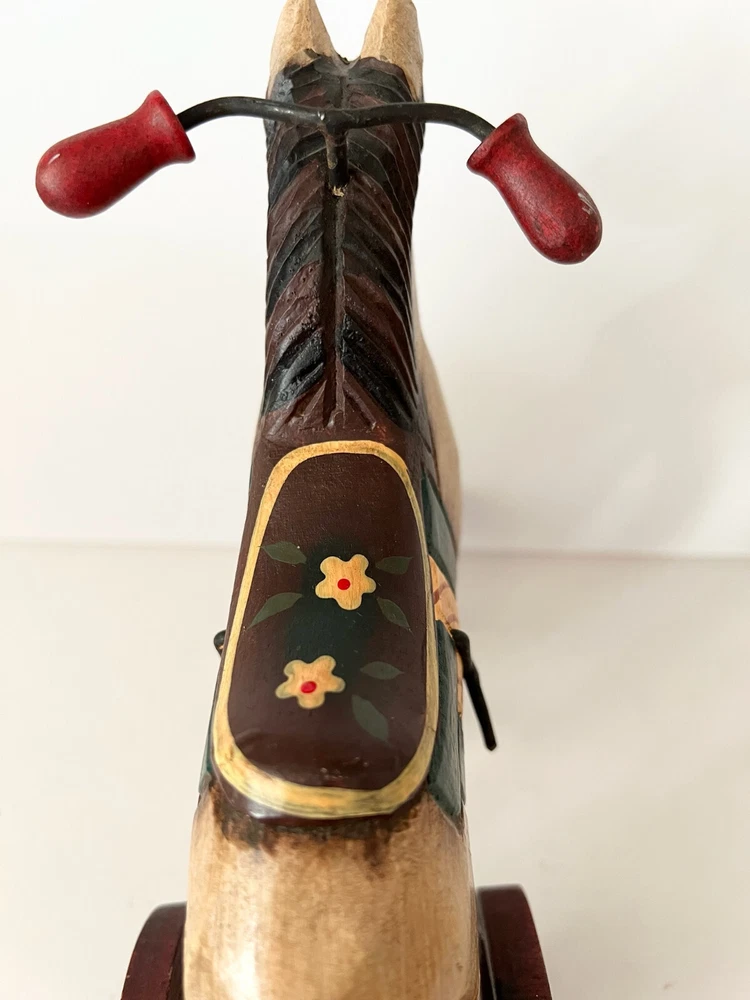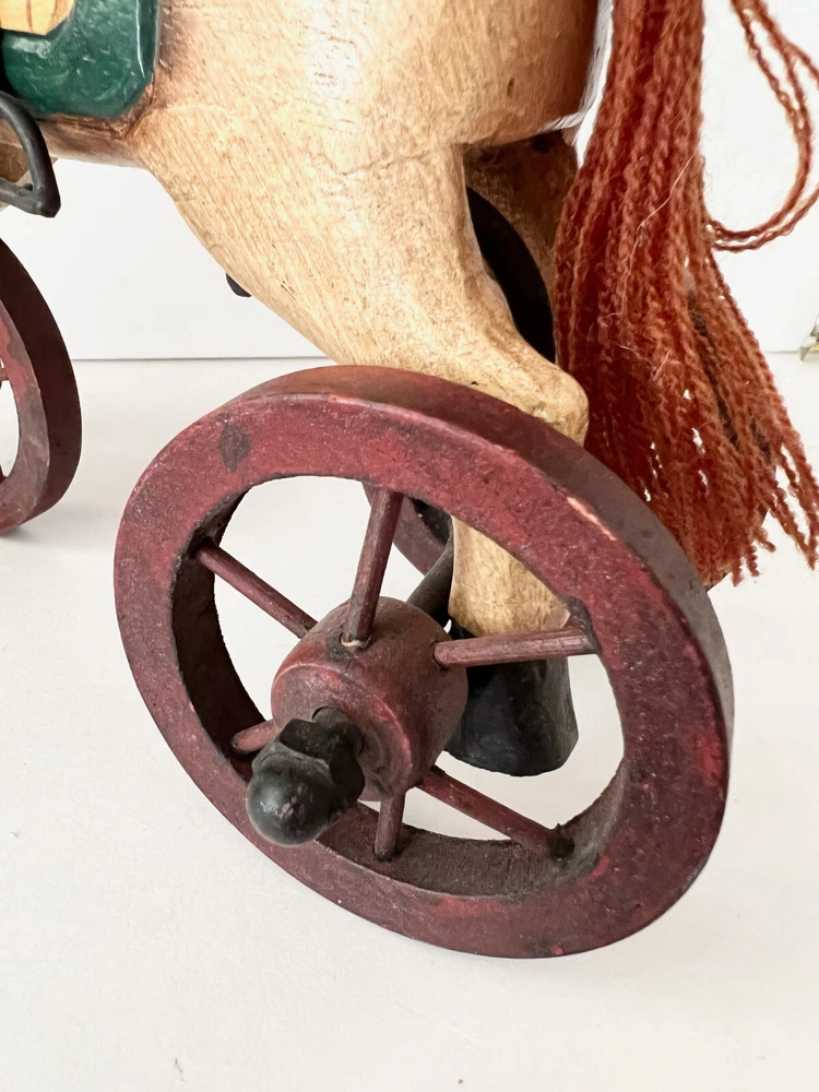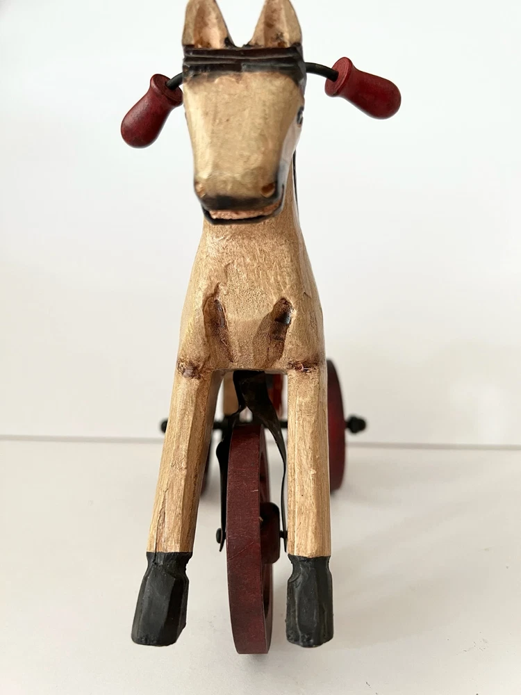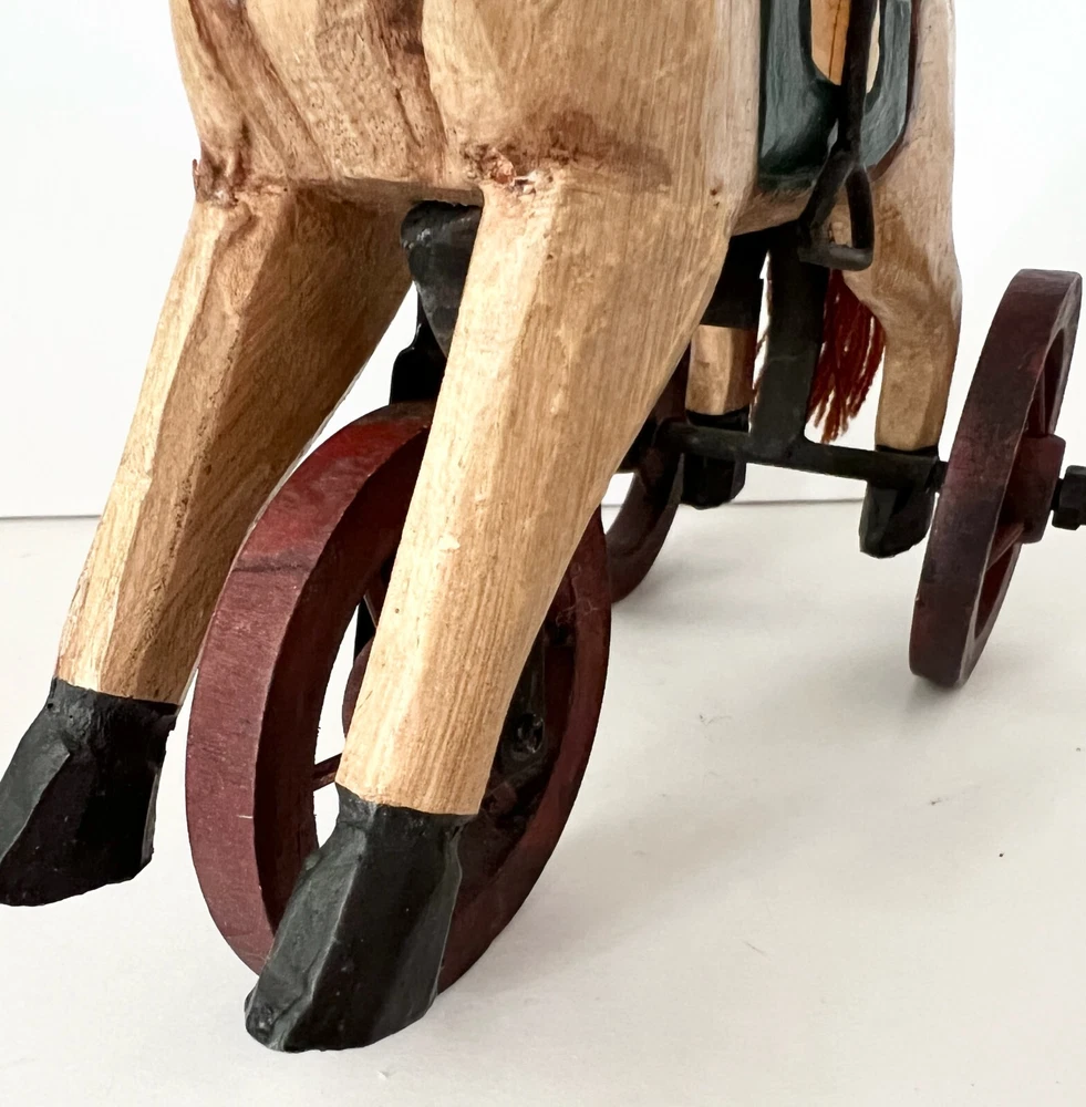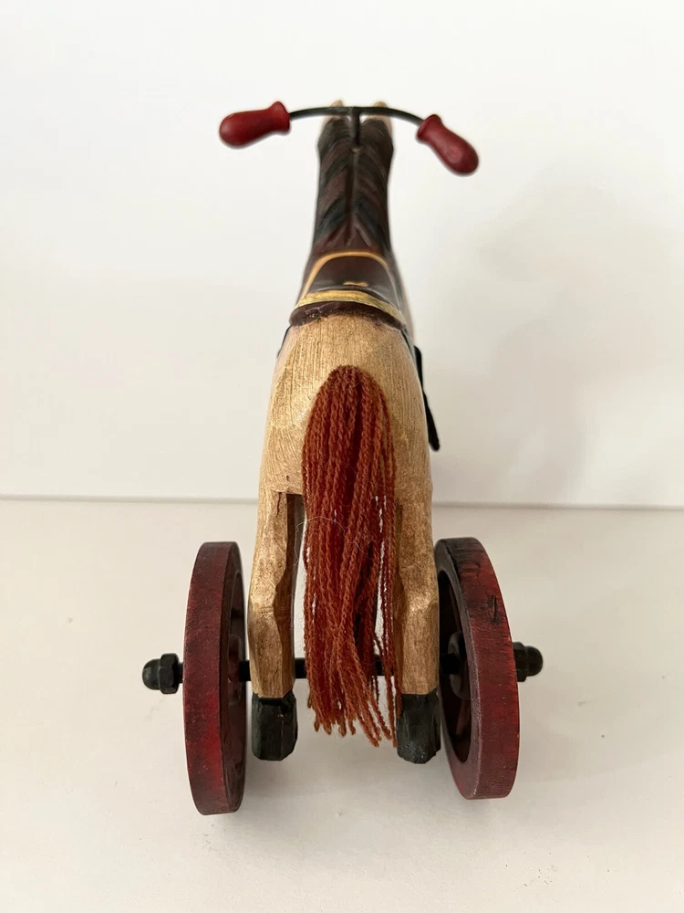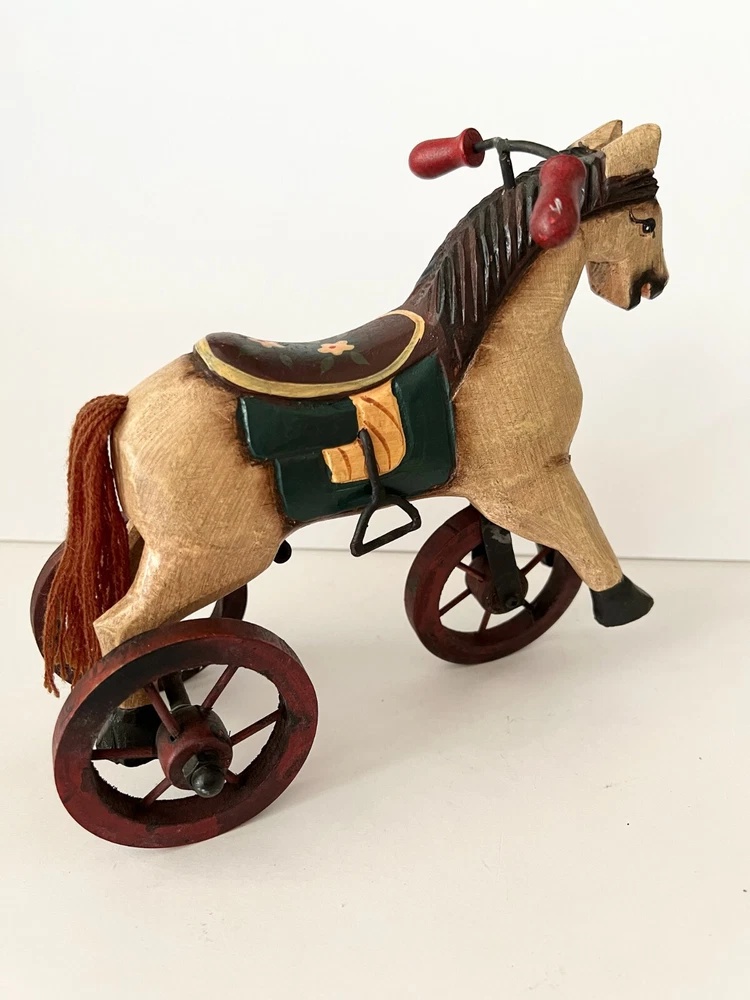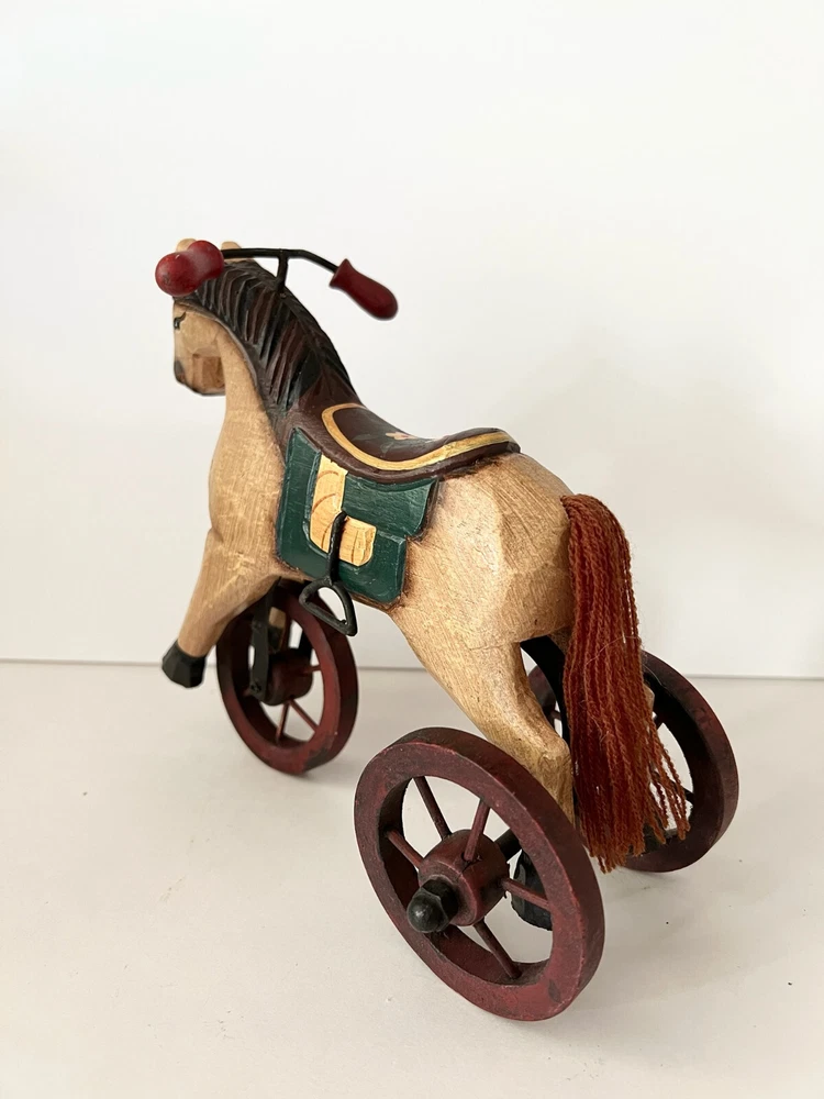 Vintage Wooden & Metal hand carved Horse Folk Art Horse Tricycle Saddle Stirrups The size of this piece is about 8 inches long by about 7.5 inches tall . Found at an Estate sale , could be Antique but for sure Vintage . This horse is in great condition and the wheels all turn. A fun piece of Folk Art .